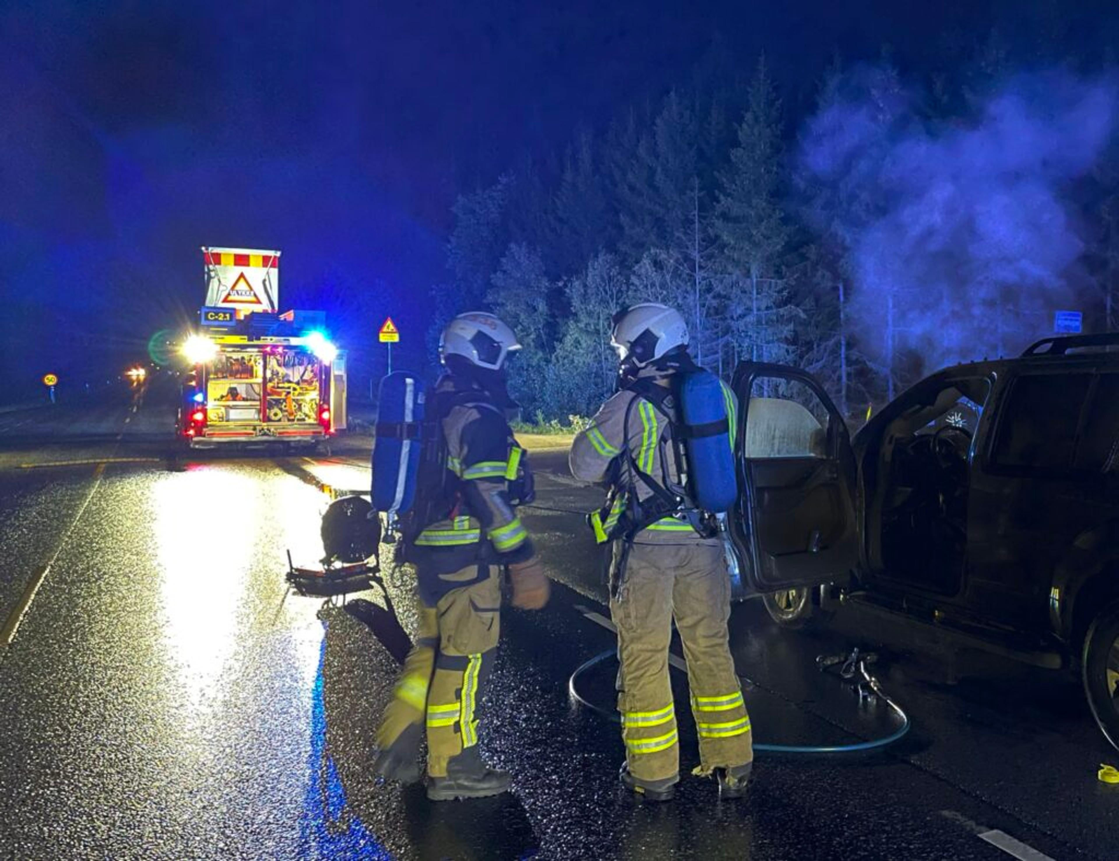 FØRSTE TIL Å HJELPE: Brannmannskap kom til stedet snaut et kvarter etter brannen starta. Da hadde ingen forbipasserende stoppa for å sjekke ut hva som skjedde og hjelpe til. Dette skjedde ved innkjøringa til Valleåsen, der er det god plass til å stoppe for forbipasserende. Foto: VIB.