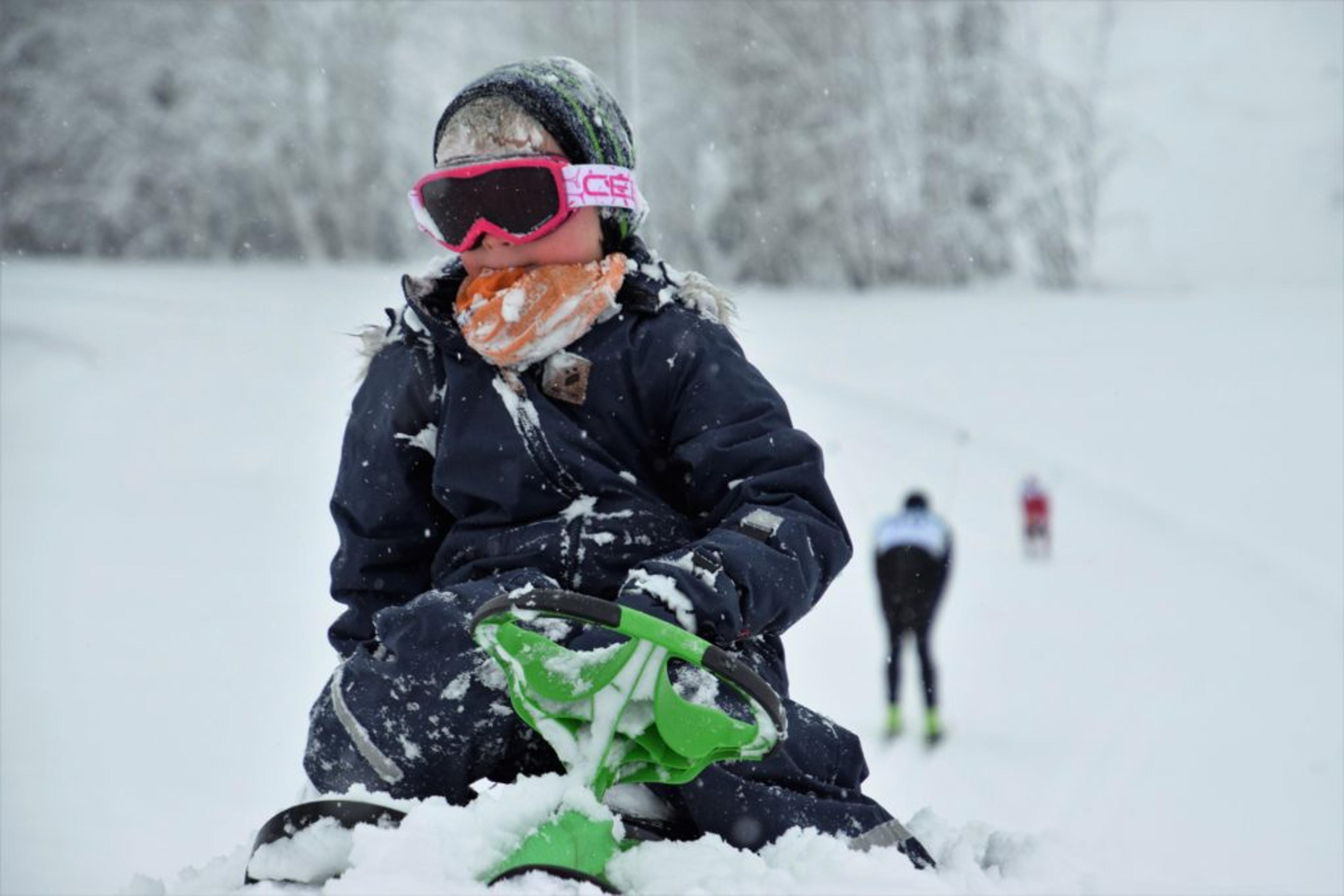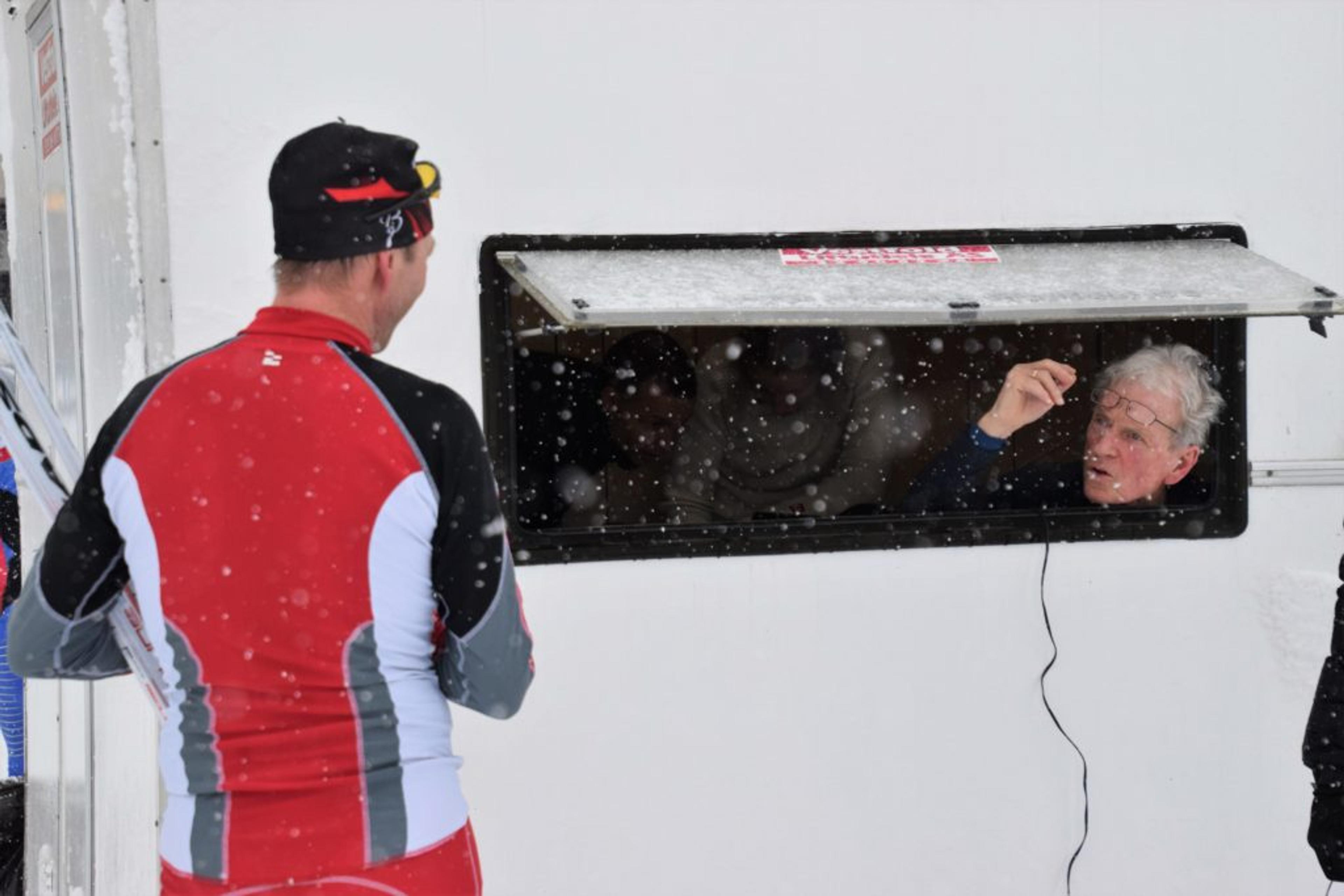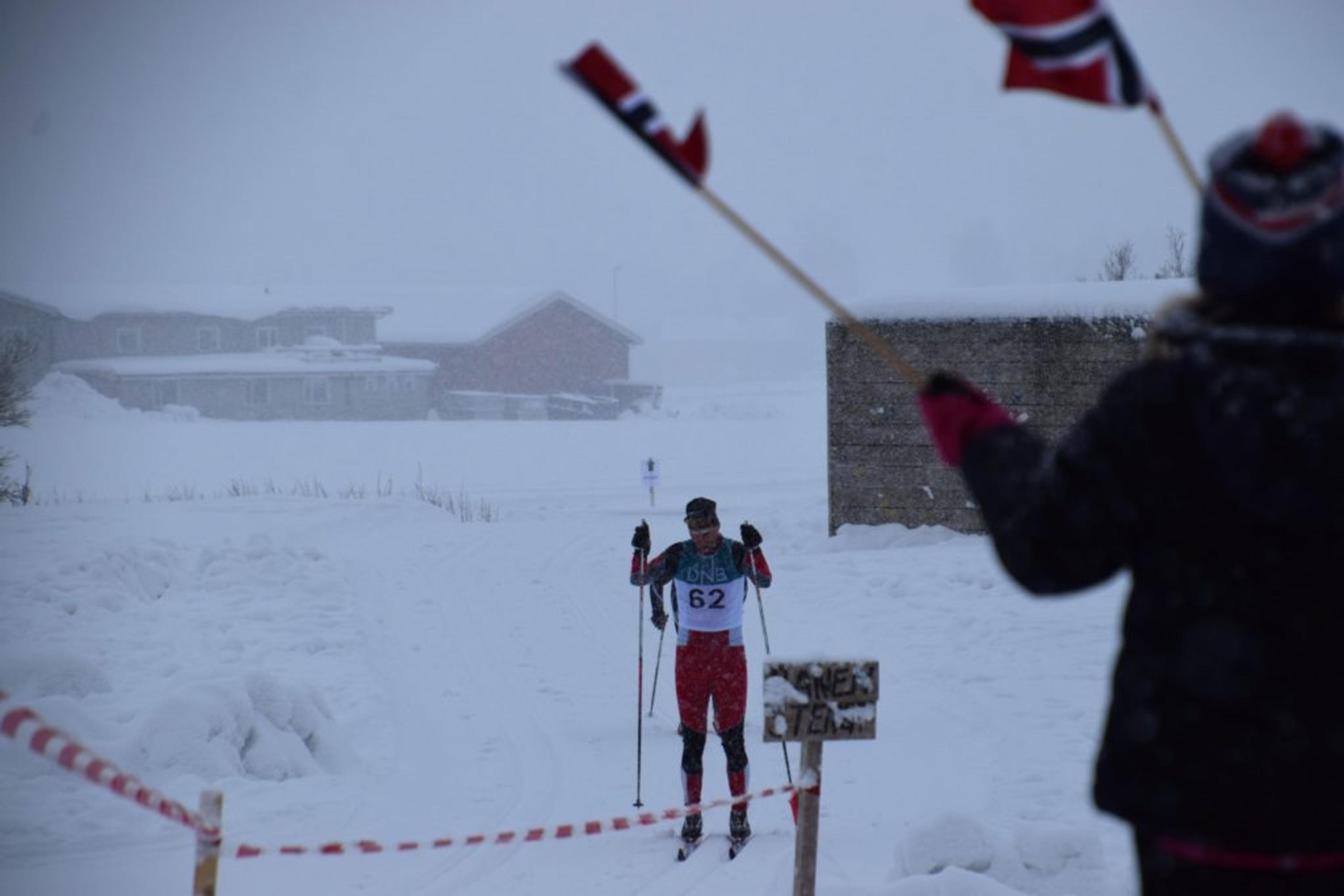 HEIA! Det var ikke like mange folk langs løypa som tidligere år, det skal kanskje tett snøvær ha skylda for. Det var ikke alltid godt å se hvem som kom i løypa. Men noen hadde møtt opp for å heie når deltakerne susa forbi husveggen – som denne karen på akebrett. Foto: Stian Ormestad.