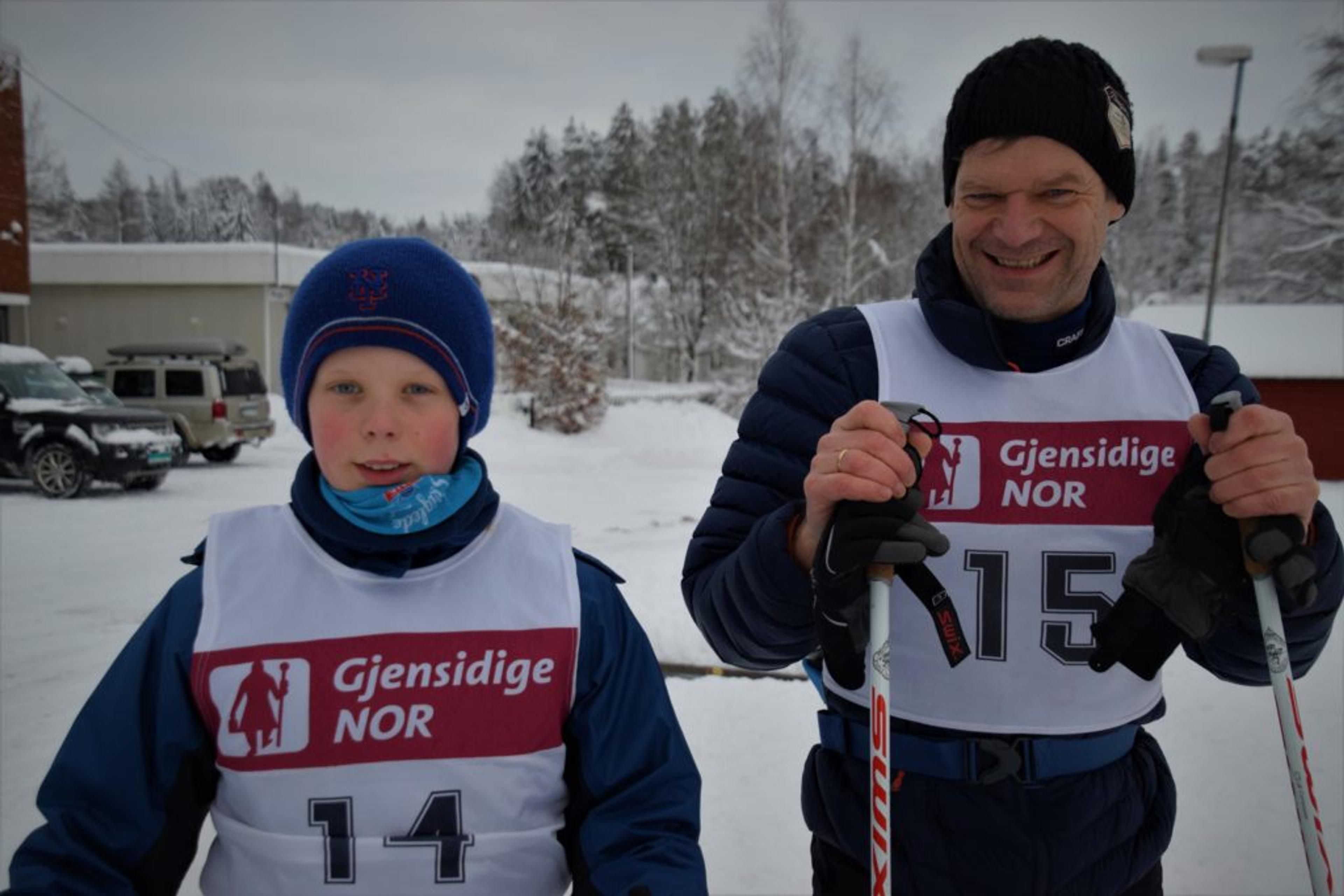 FAR OG SØNN: Alf Rune Brygmann (52) vil ikke utfordre sin skiglade sønn Fillip Brygmann (12). – Vi skal vel gå tur sammen, forteller pappa som skal prøve å henge på guttungen. Alf Rune har vokst opp i Ramnes, nå bor familien på Revetal. Foto: Stian Ormestad.