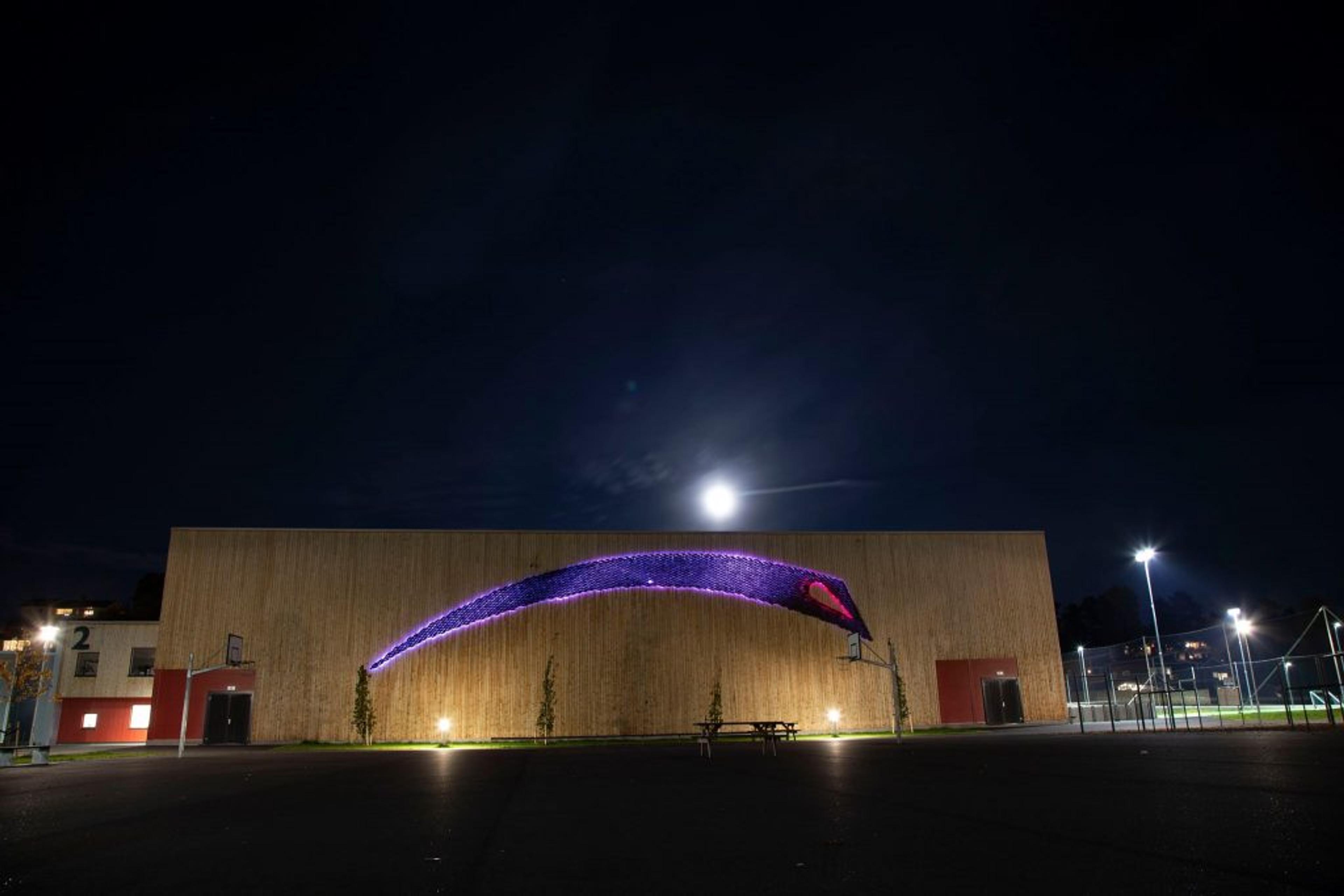 ORMEN VÅGE: Også den lyskunstpris-nominerte middelalderormen på Revetalhallen er foreviget av Eivinds drone. Foto: Eivind Heggem.