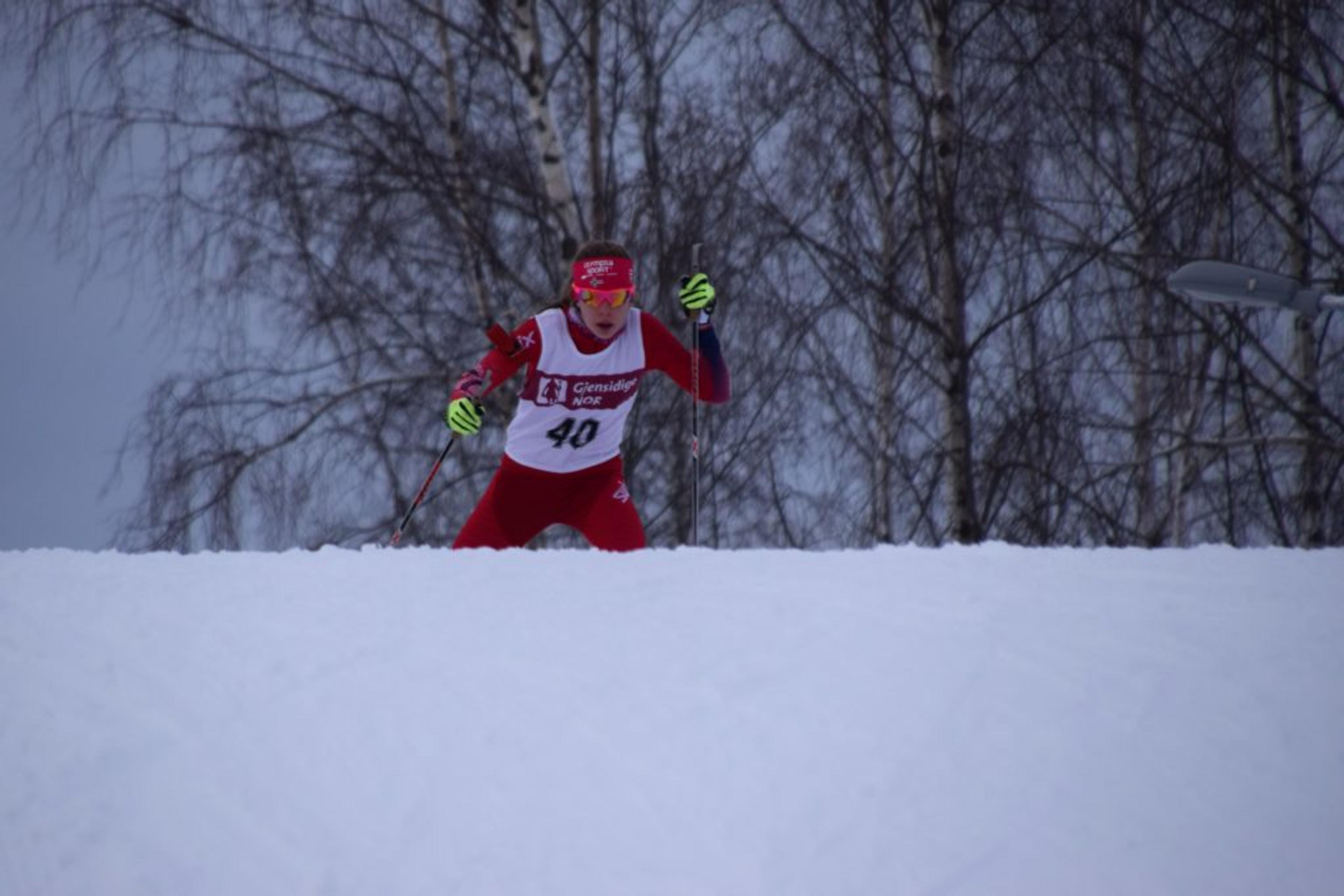 I FINT DRIV: Lovise Horn i Jenter 11-klassen freser mellom treleggene inn på skistadion på Bibo. Foto: Stian Ormestad.