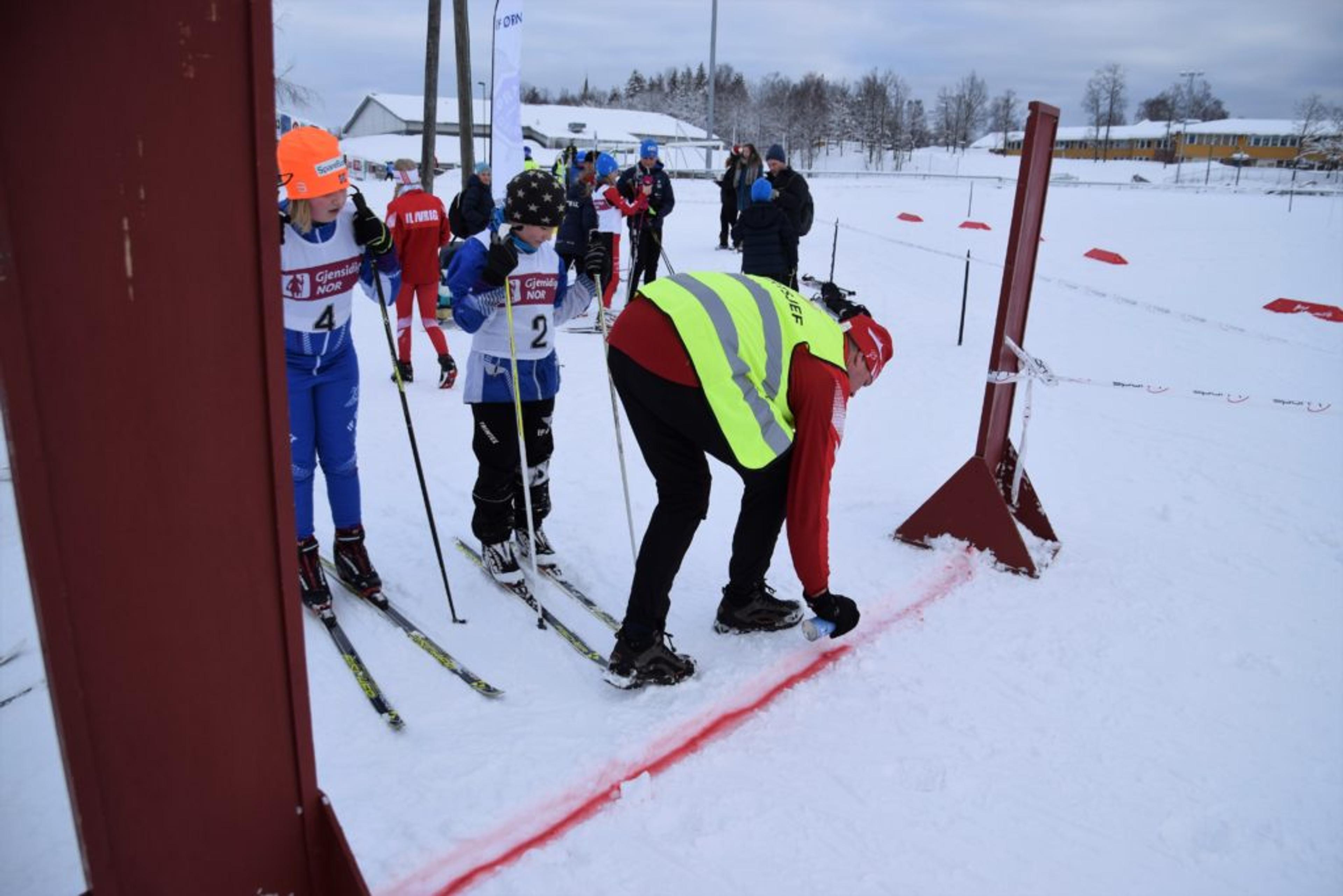 SISTE INNSPURT FØR FØRSTE START: Spente skiskyttere står klare bak en fersk startstrek. Foto: Stian Ormestad.