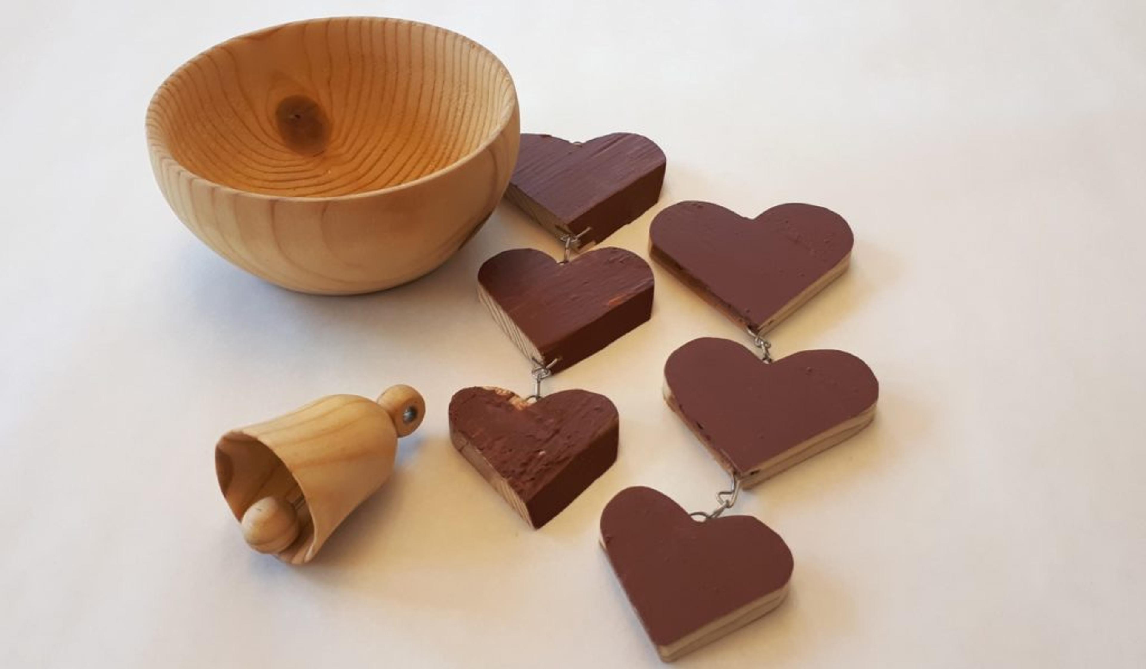 TREARBEIDER: Unike, lokale suvenirer laga av takbjelker fra Ramnes kirke. Foto: Privat.