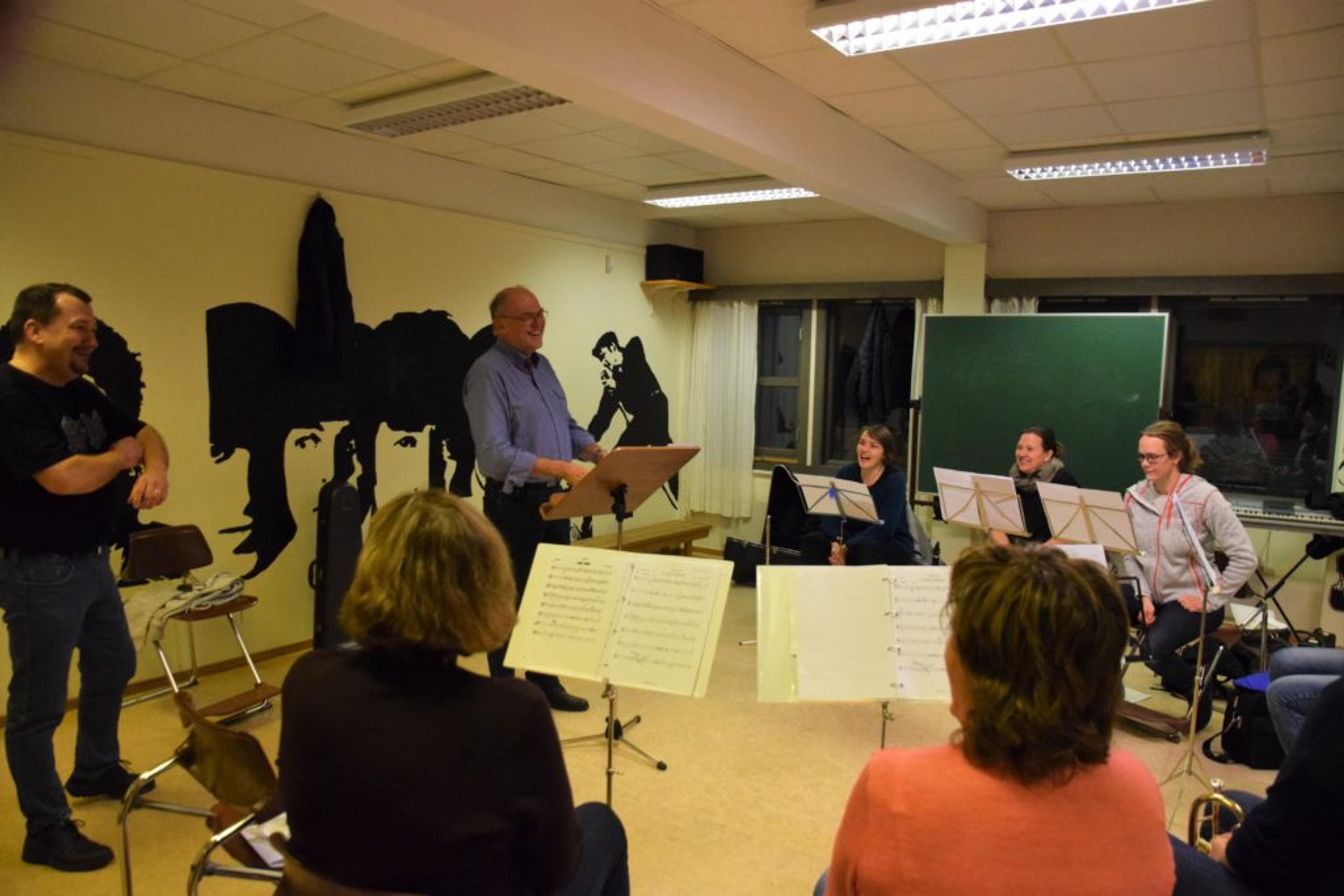 VOKSENKORPS I RAMNES: Blågjengen øver mandagskvelder på musikkrommet på Ramnes skole. Mandag 19. desember er det tid for den tradisjonelle julekonserten i Ramnes kirke. Foto: Stian Ormestad