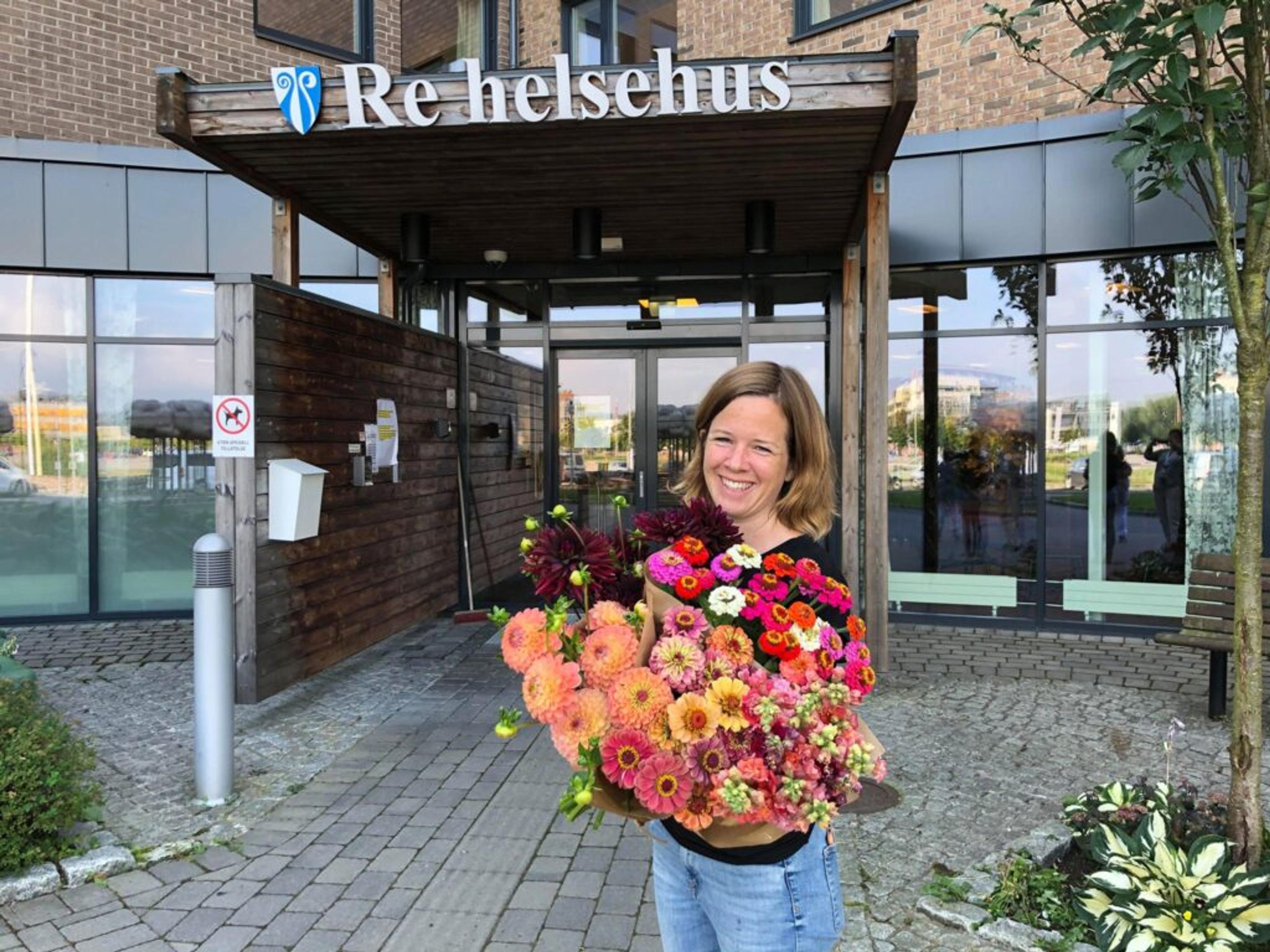 VELDUFTENDE GAVE: Marthine Søyland Hoel (38) fra Ramnes leverer flotte blomsterbuketter til Re helsehus – gratis. Foto: Privat.