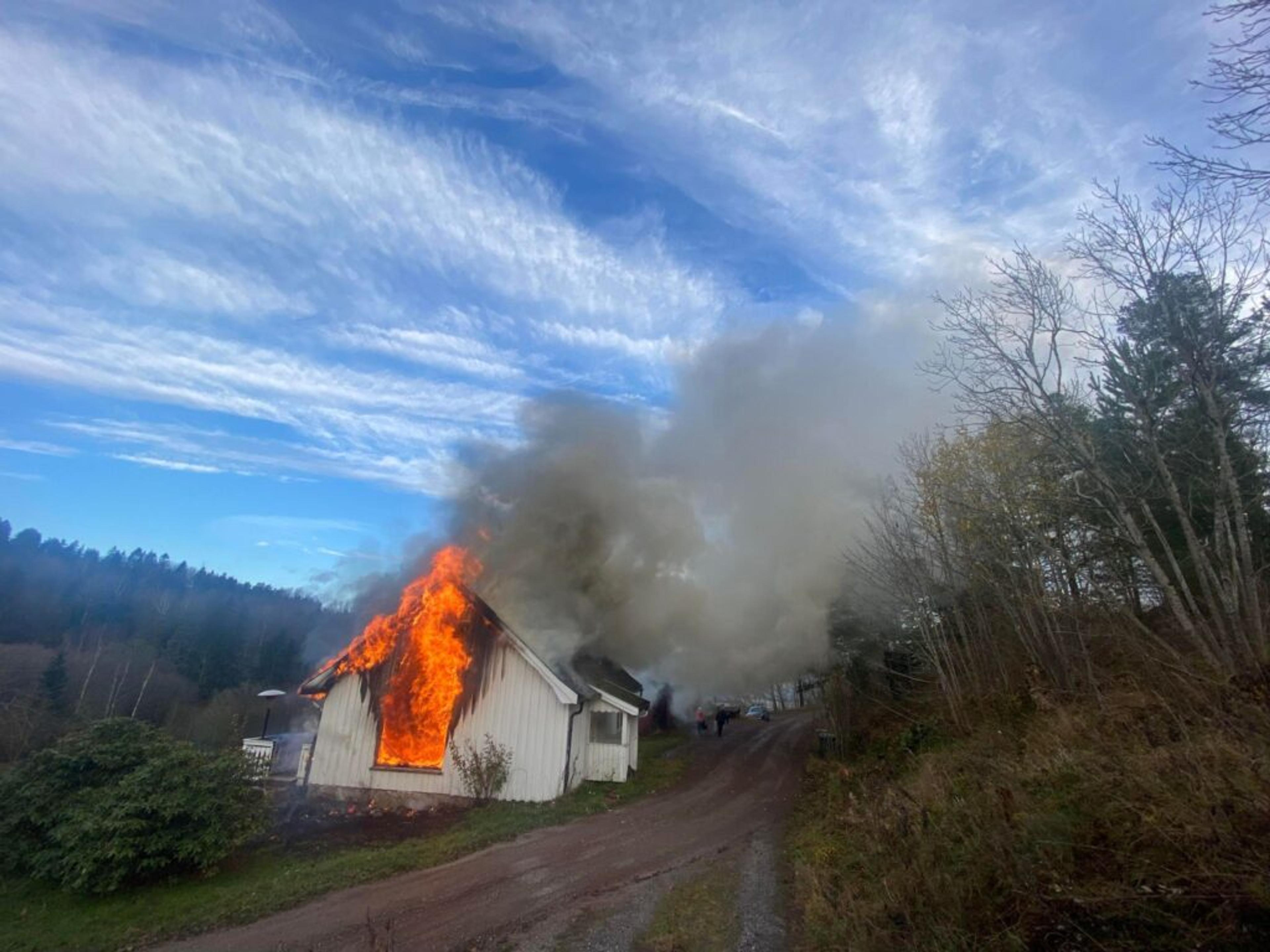 BRENNER NED: Boligen var ikke mulig å redde fra flammene og brenner helt ned. Foto: Stian Ormestad.