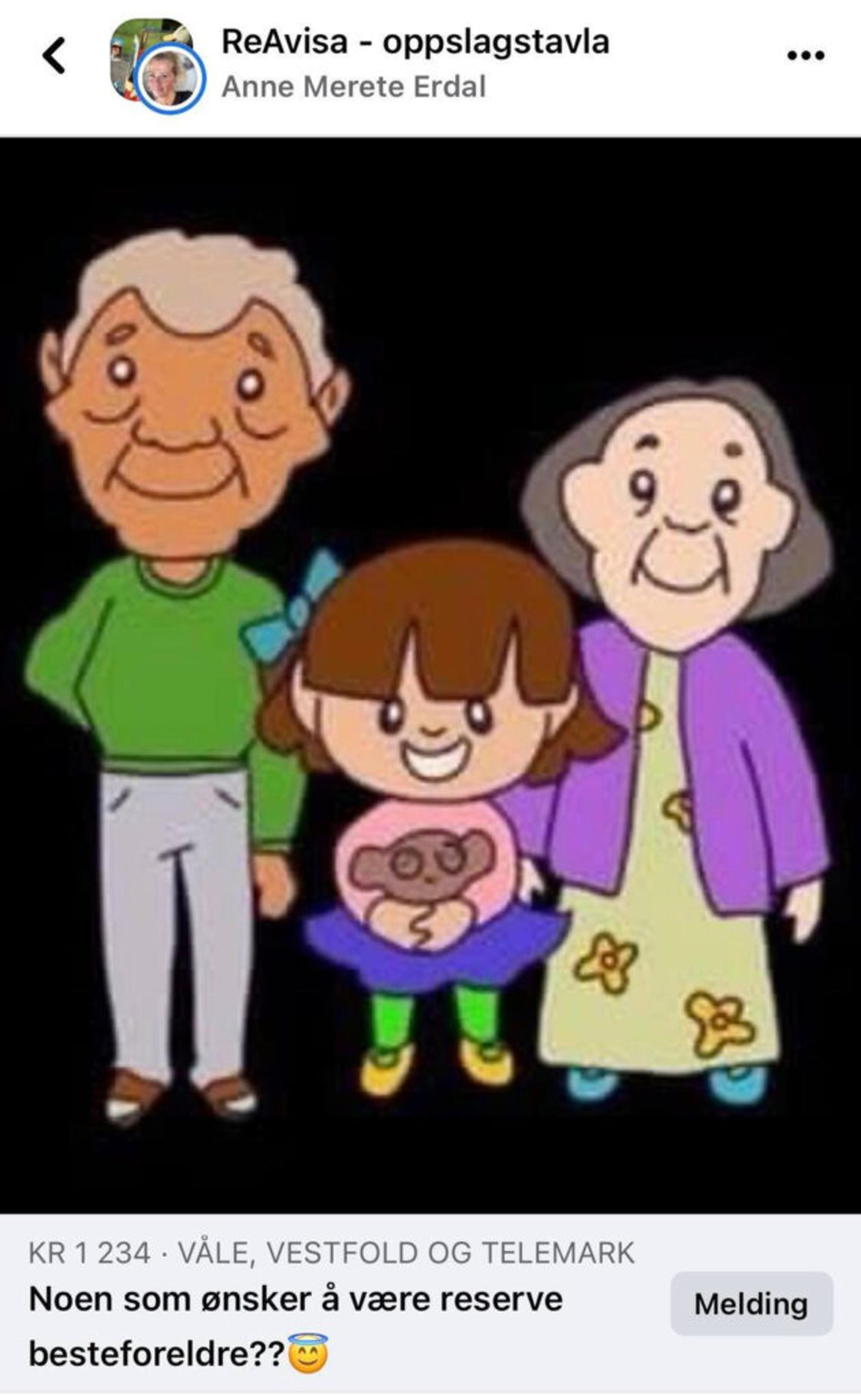 «Reserve besteforeldre!! Min familie bor på Vestlandet så har ingen familie i nærheten og er mye alene med mine barn. Ønsket mitt er at de skal kunne få en litt større omgangskrets, eller få et slags bestemor/bestefar-bånd med noen her i nærheten.»