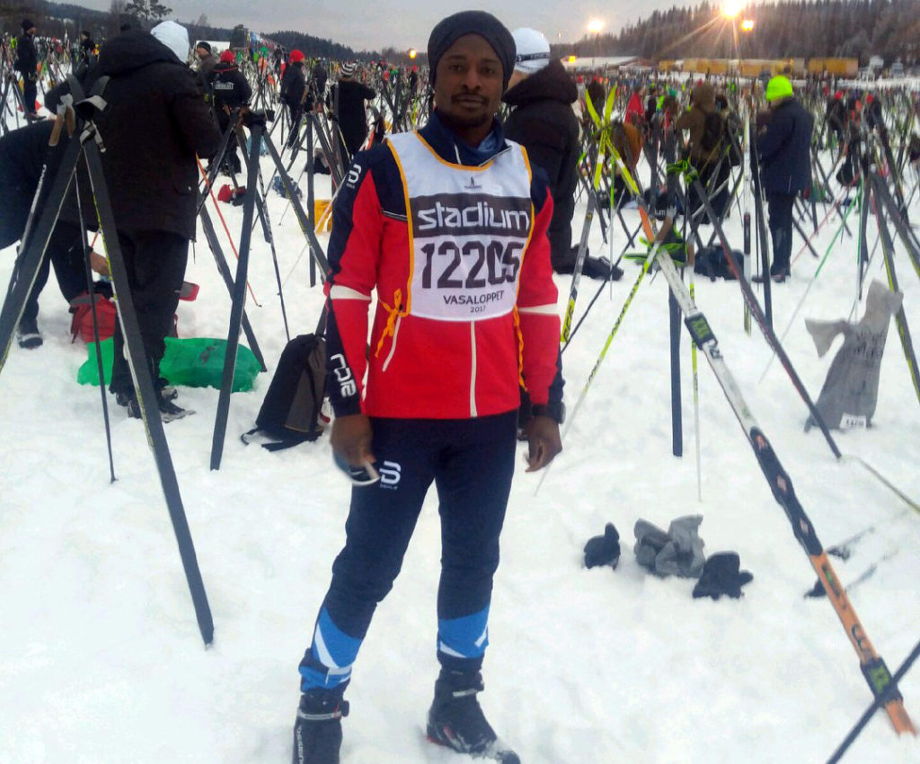 SKILØPER FRA RE: John Bosco Kisembo (30) fra Katwe bor på Brår med kone og to barn. Han elsker å gå på ski, og her er han klar for Vasaloppet. Foto: Privat.