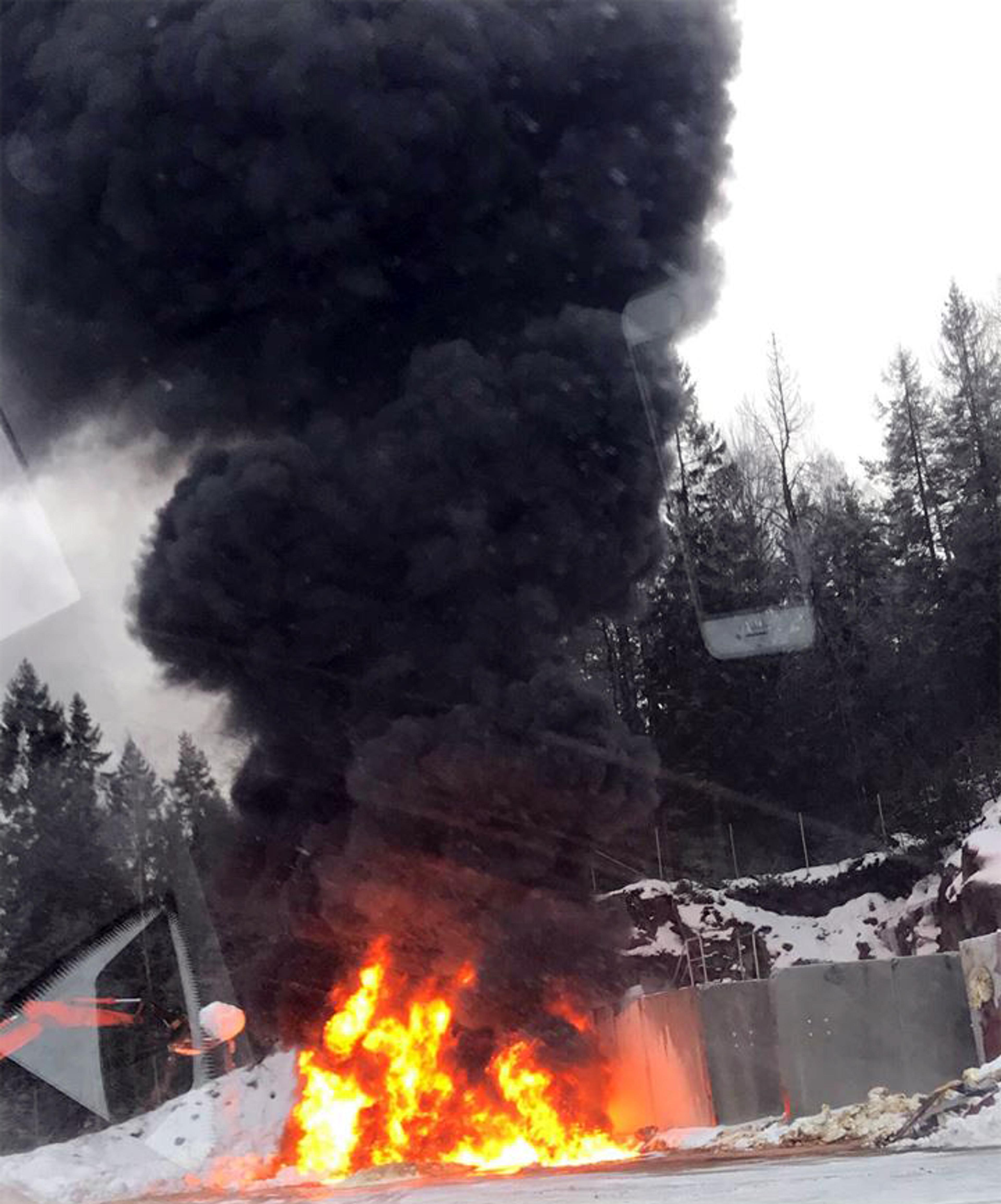 SLOKKER: Brannen er her effektivt slått ned med snø – før nødetatene har rekki fram til stedet. Foto: Stian Ormestad.