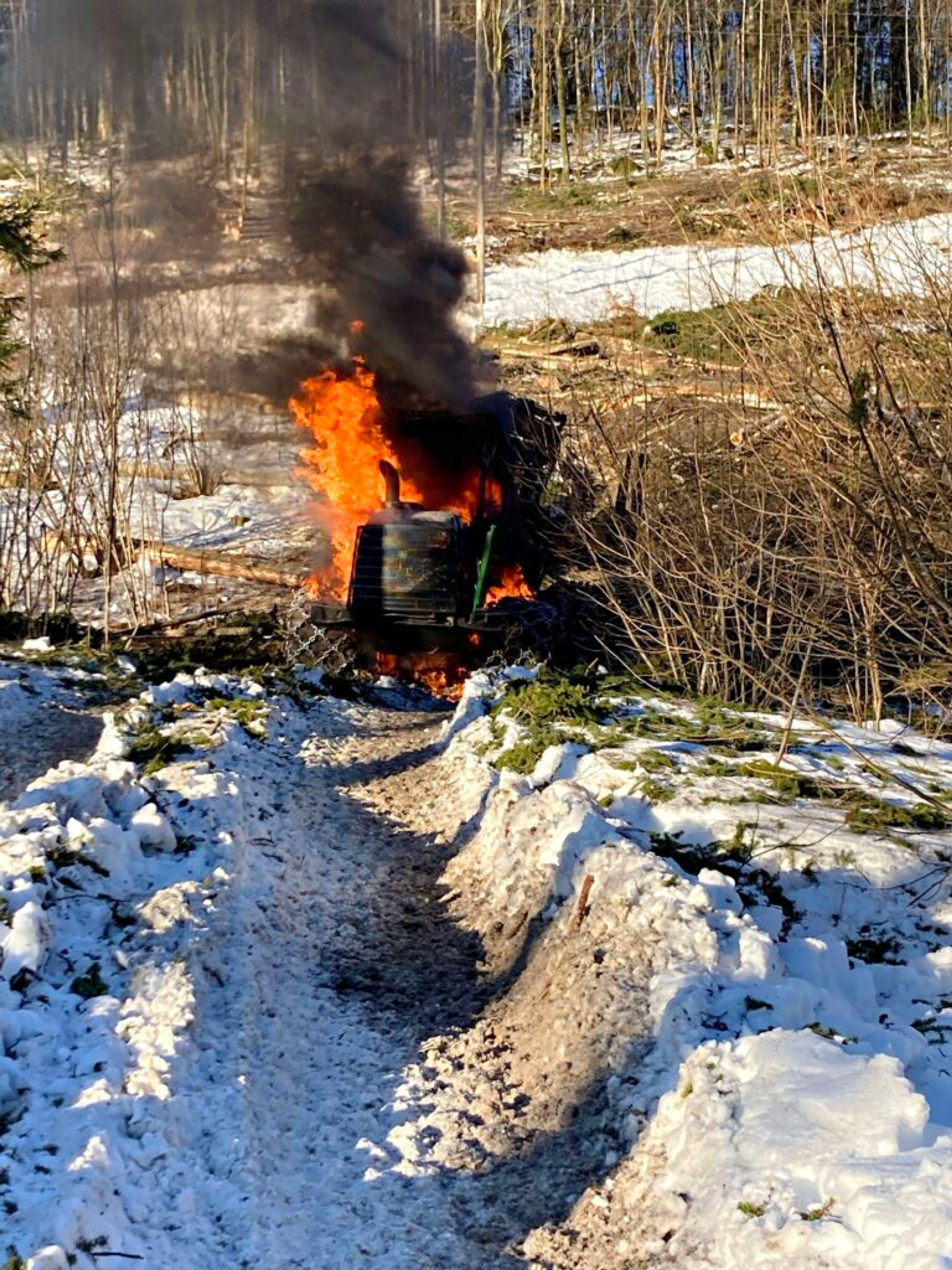 – Skogsmaskinen framstår nå totalt utbrent, forteller politiet på stedet ett par timers tid etter første melding om brannen: