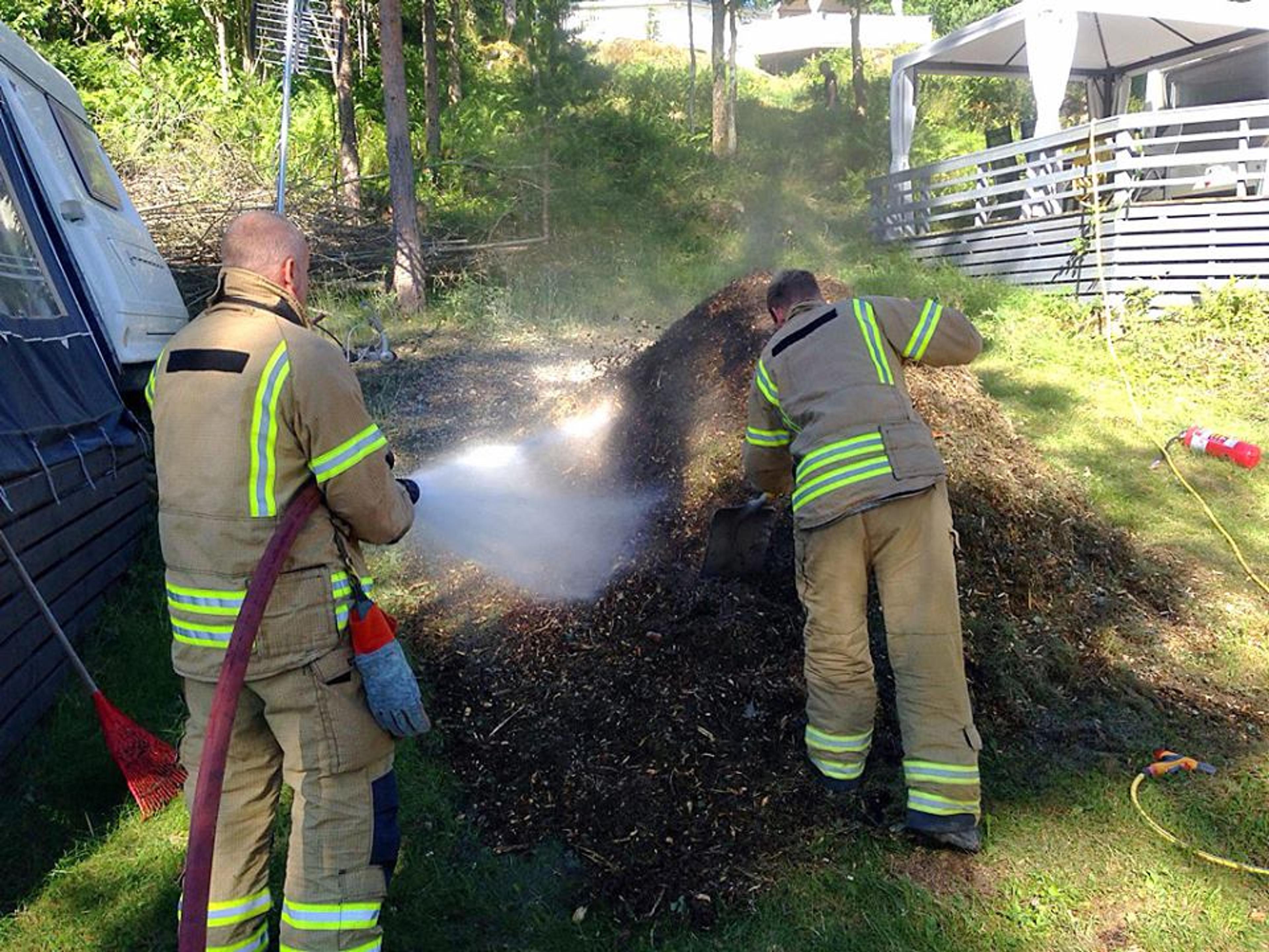 Klokka 09:17 mandag 3. juli rykket mannskapene ved Kopstad brannstasjon ut til Sand Camping i Re etter melding om brann i en haug med bark og flis.