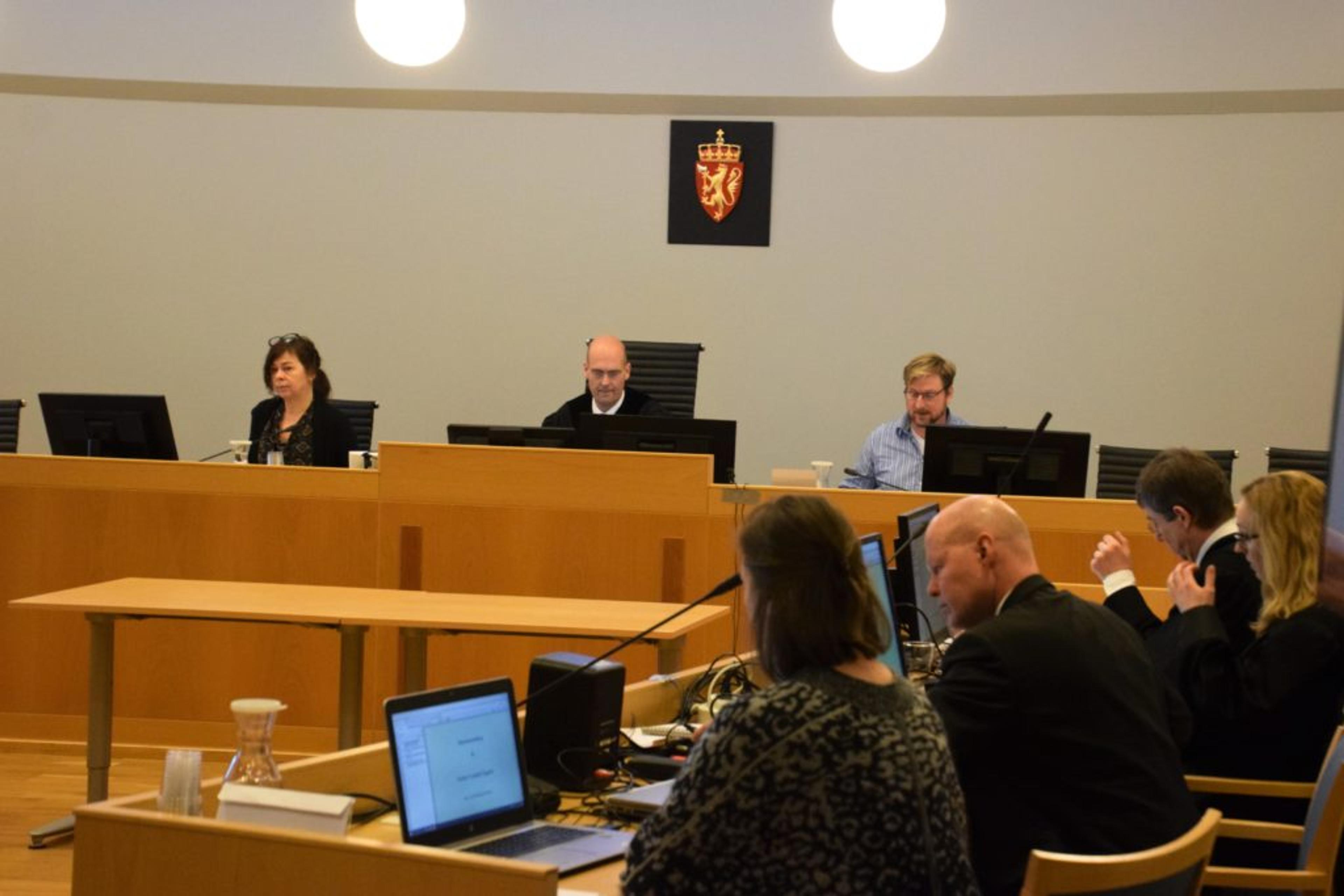 RETTSSAK: Nesten tre uker er satt av til rettssaken mot tre i Revac-ledelsen og to firmaer. På bildet ser vi dommerkollegiet og påtalemyndigheten. De tre tiltalte vil ikke la seg avbilde under rettssaken. Foto: Stian Ormestad.