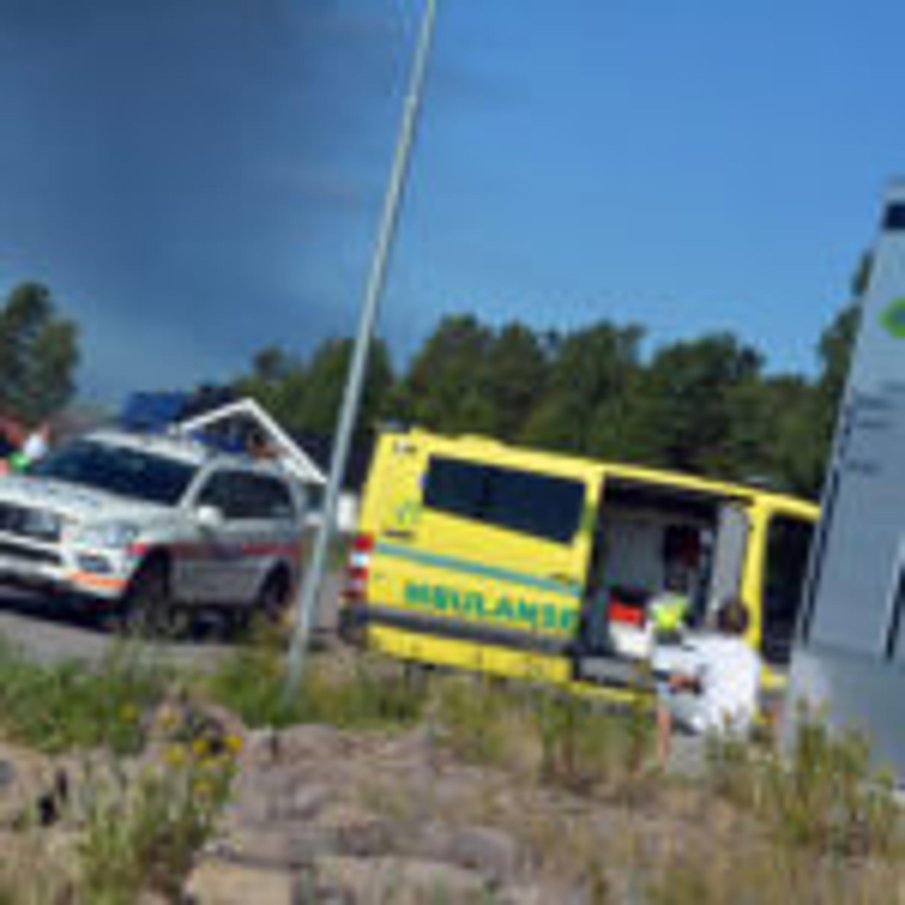 AMBULANSE: En brannmann måtte kjøres avgårde i ambulanse etter å ha fått i seg røyk. Det er ingen tvil om at det var svært helseskadelig å få i seg røyken fra brannen. Foto: Stian Ormestad.