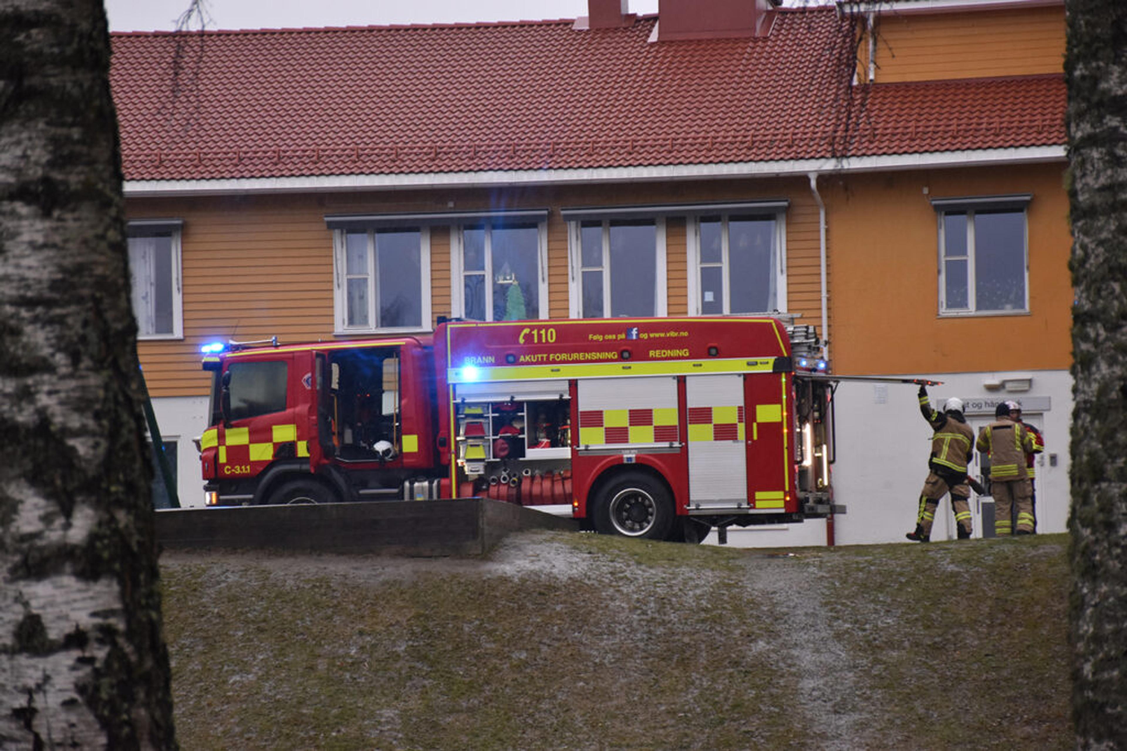 PÅ PLASS: To brannbiler og en vaktbil er på plass på Kirkevoll skole. Foto: Stian Ormestad, ReAvisa.