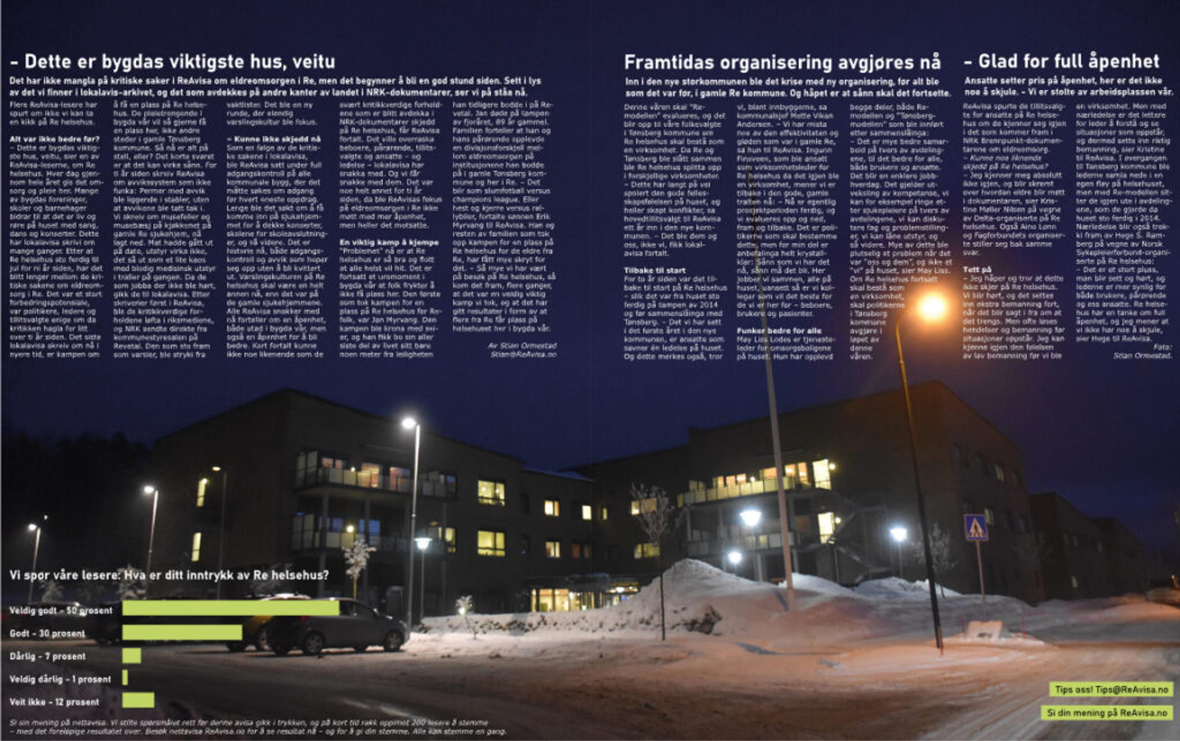 LOKALAVISA OM LOKALE FORHOLD: Riksmediene og ReAvisa har rapportert om to forskjellige verdener, når det gjelder eldreomsorg og hjemmesjukepleie på andre kanter av landet sammenlikna med her i Re. Les mer om lokale forhold i tidligere saker i lokalavisa. Faksimile: ReAvisa februar 2023.