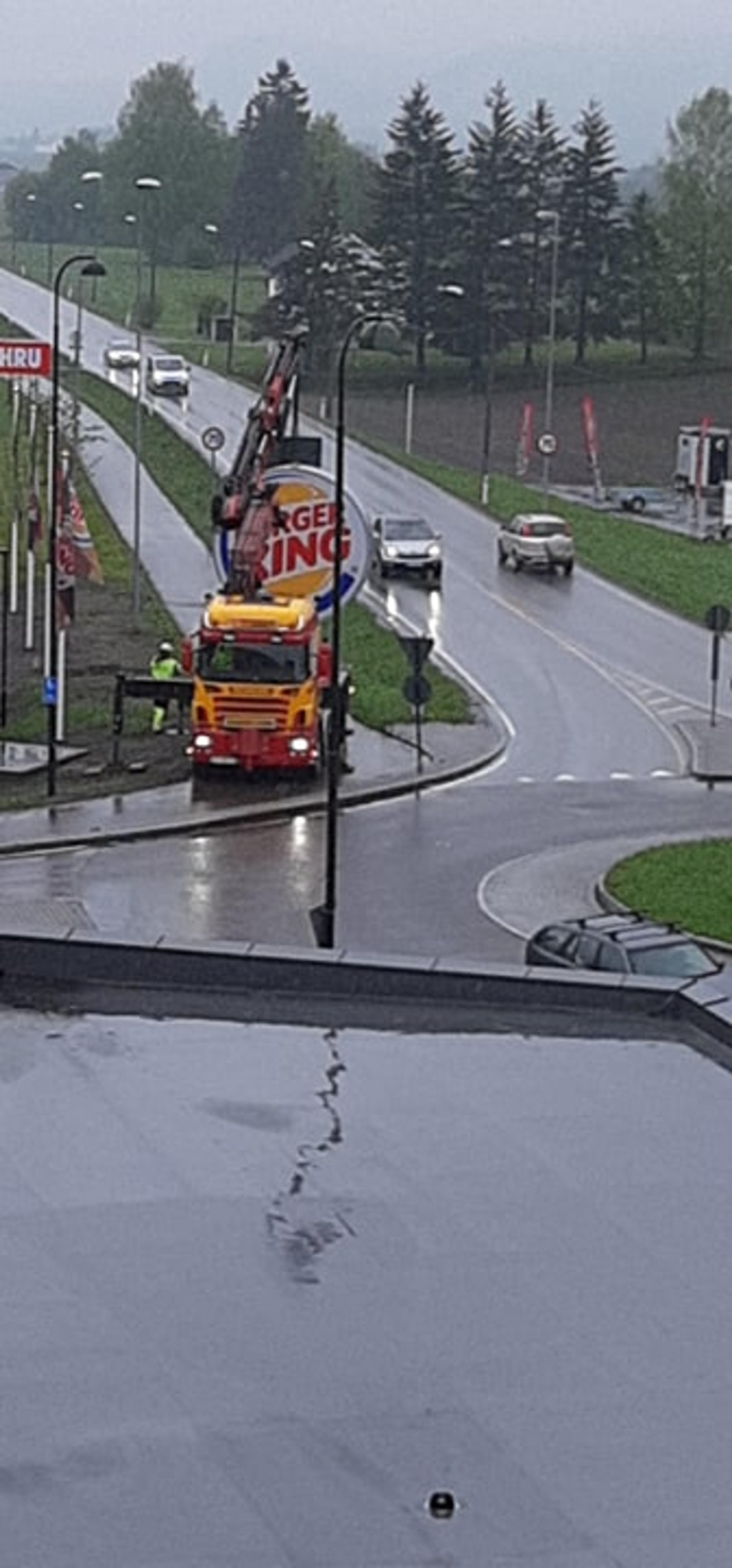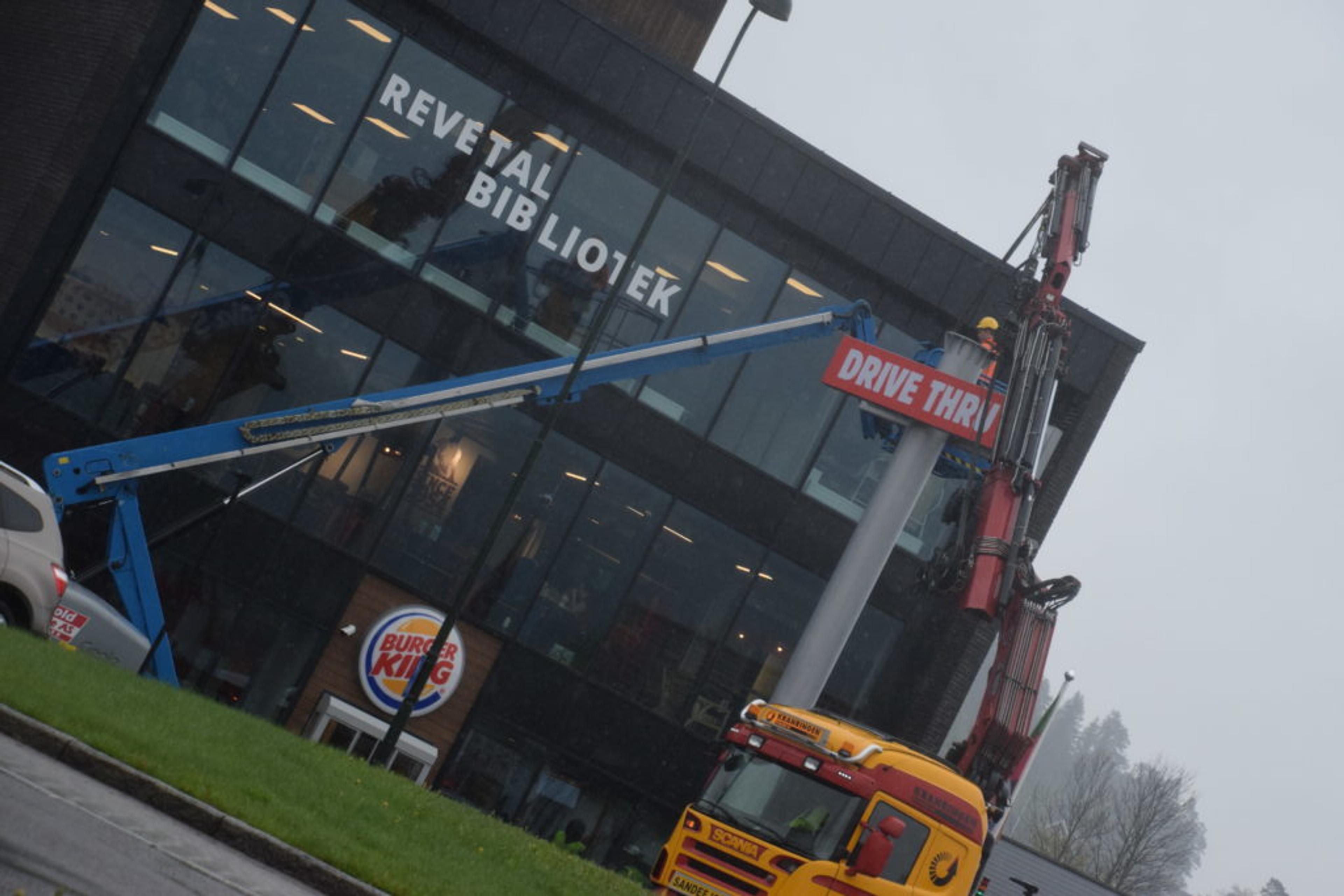 REVETAL KAN SKILTE MED BURGER KING: Men ikke fra det lysende skiltet i toppen av «monstermasta», og heller ikke med flagg langs veien. Alt blir tatt ned i dag, fredag 10. mai 2019 – et snaut halvår etter at det ble satt opp. Foto: Stian Ormestad,