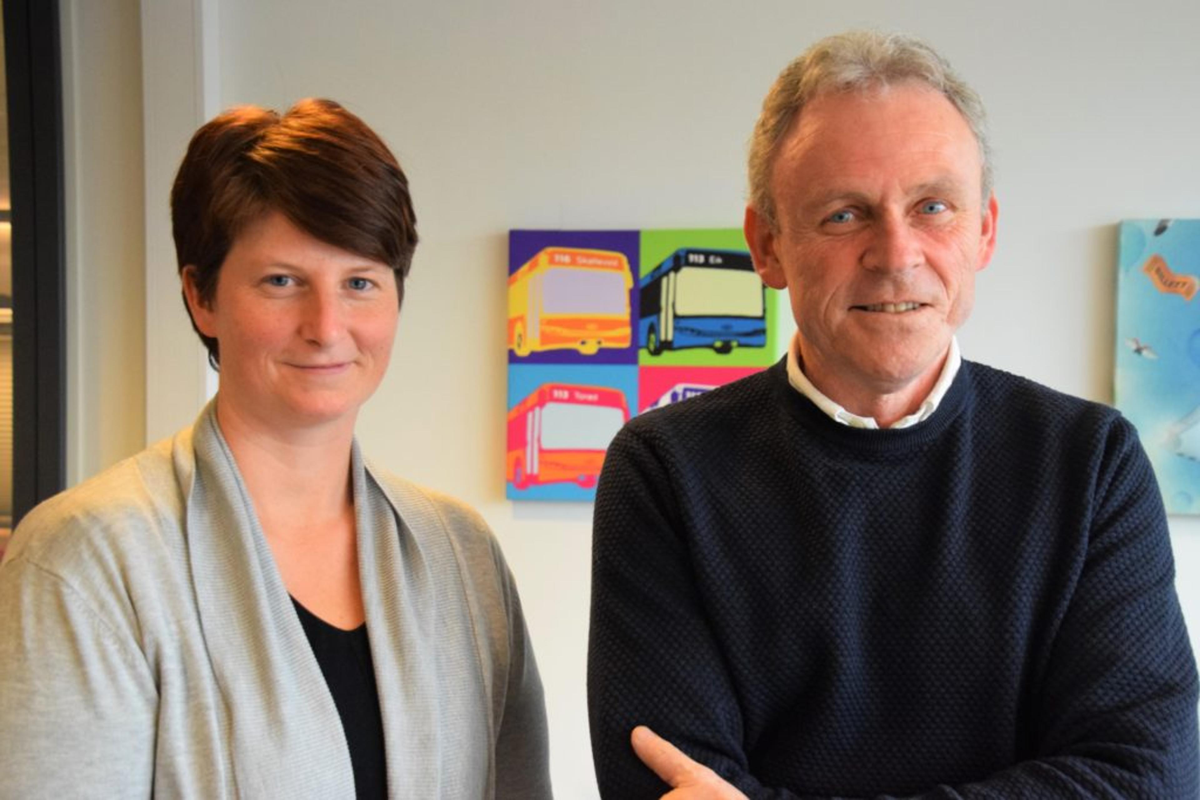 GODE BUSSER: Til og med kunsten på VKT-kontoret er prega av busser. Markedskonsulent Christel Reinertsen og markedsdirektør Trond Myhre har full fokus på buss – og Revetal. Foto: Stian Ormestad.