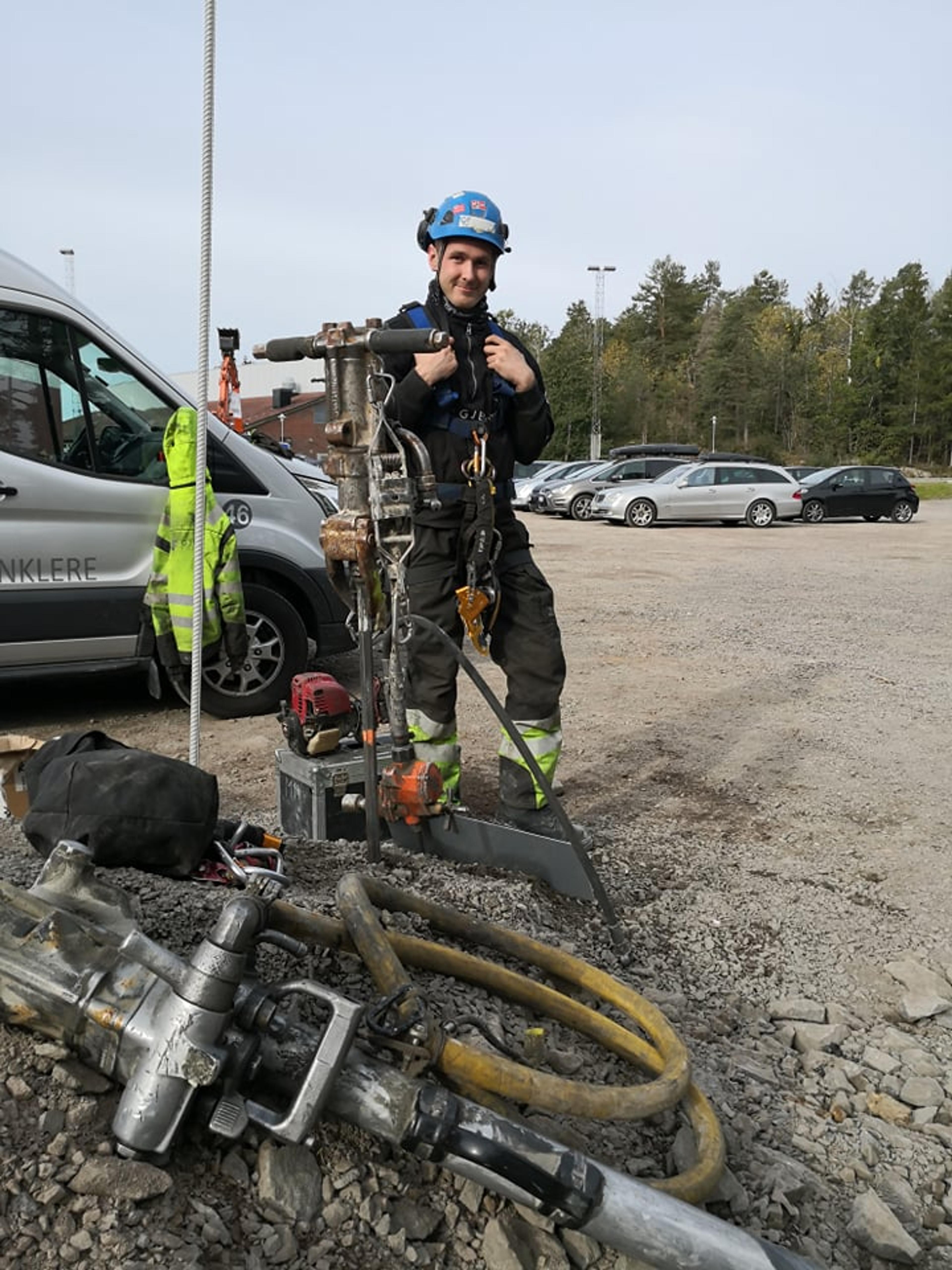TIDLIGERE RE VGS-ELEV: Lars Skjærseth jobber i dag hos Gjerden fjellsikring. Han demonstrerte taumoped, som de bruker i fjellveggen opptil 800 meter over bakken. Foto: Erik Myrvang.