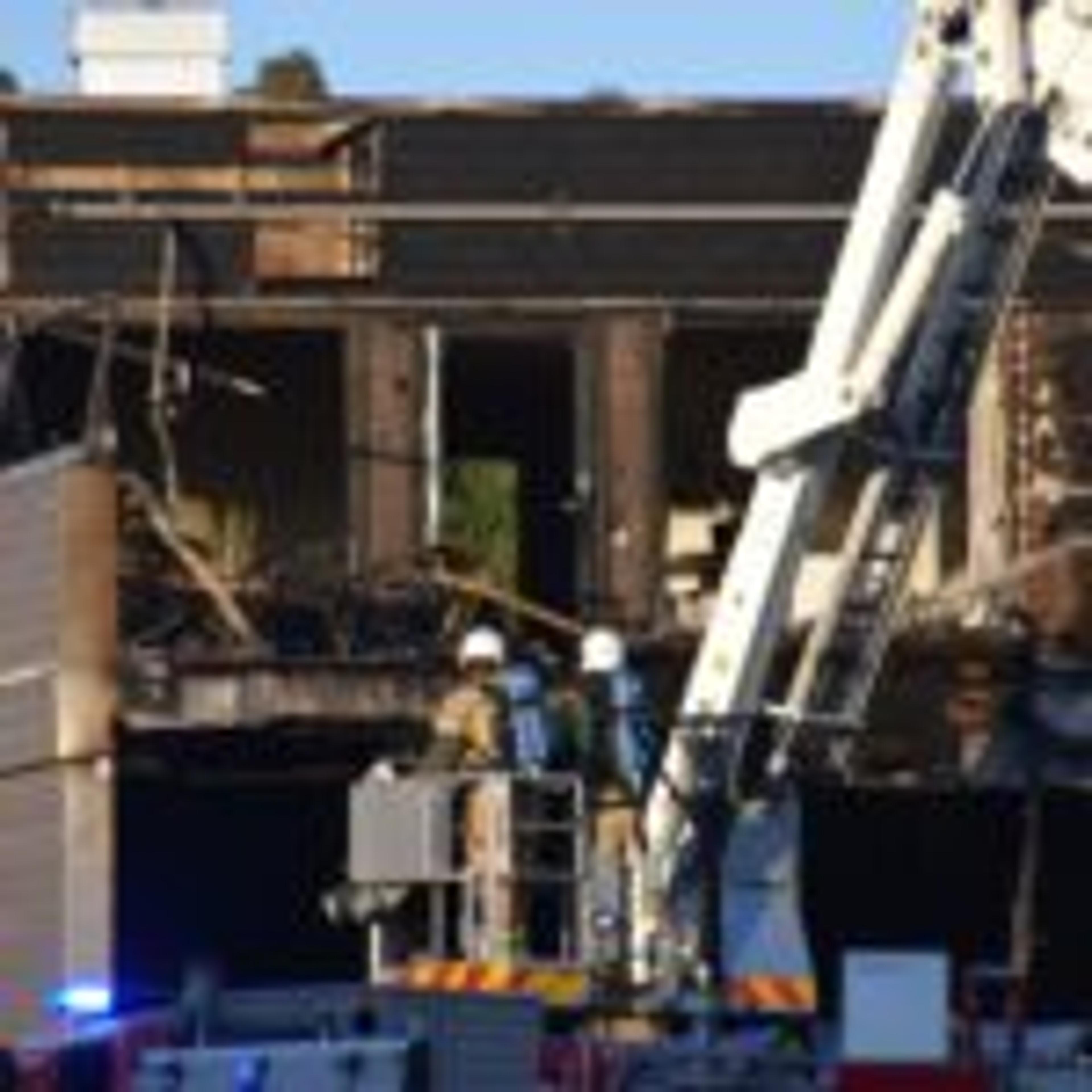 Oppmøtet fra nødetatene er stort, med flere ambulanser, politipatruljer og et stort brannmannskap med flere lastebiler og lift.