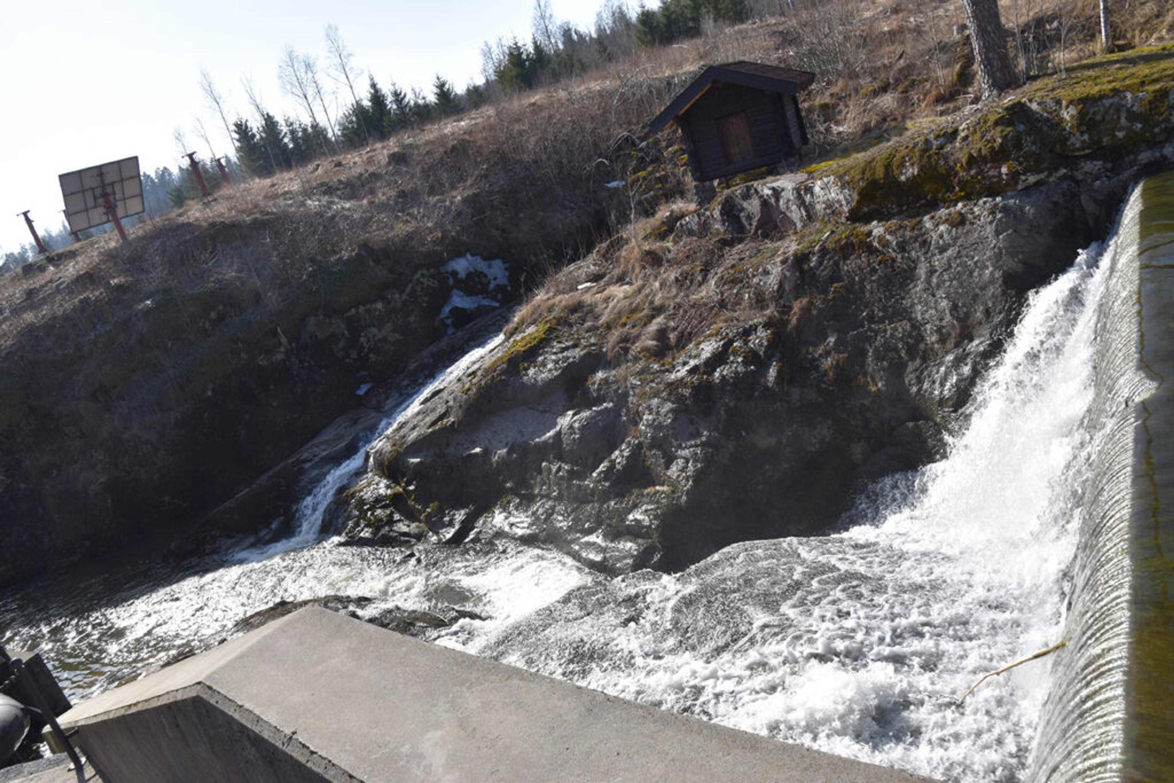 LOKALT KRAFT- OG NÆRINGMUSEUM: På mølla produseres både gammel og mer moderne energi – i forkant ser vi vannkrafta jobbe, og i bakgrunn står den mer moderne solcelleparken og samler solenergi. Foto: Stian Ormestad, ReAvisa.