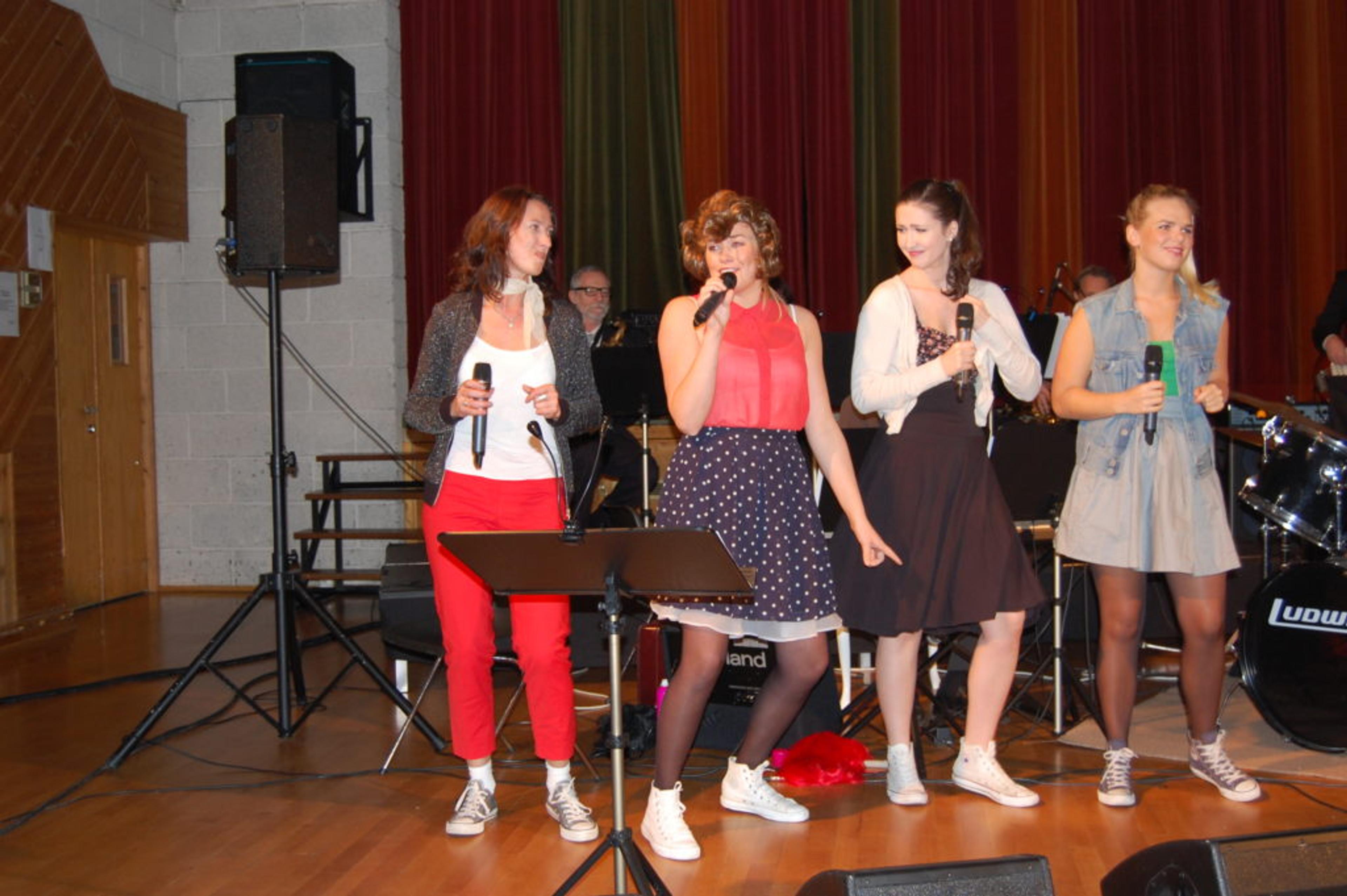 GREASE: Fra en konsert med Storbandet Fokus på Våle samfunnshus for åtte år siden. Fra venstre Line Knudsen, Katrine Hallenstvedt Lid, Charlotte Sofie Eliassen og Hanne Beck. Foto: Håkon Westby.