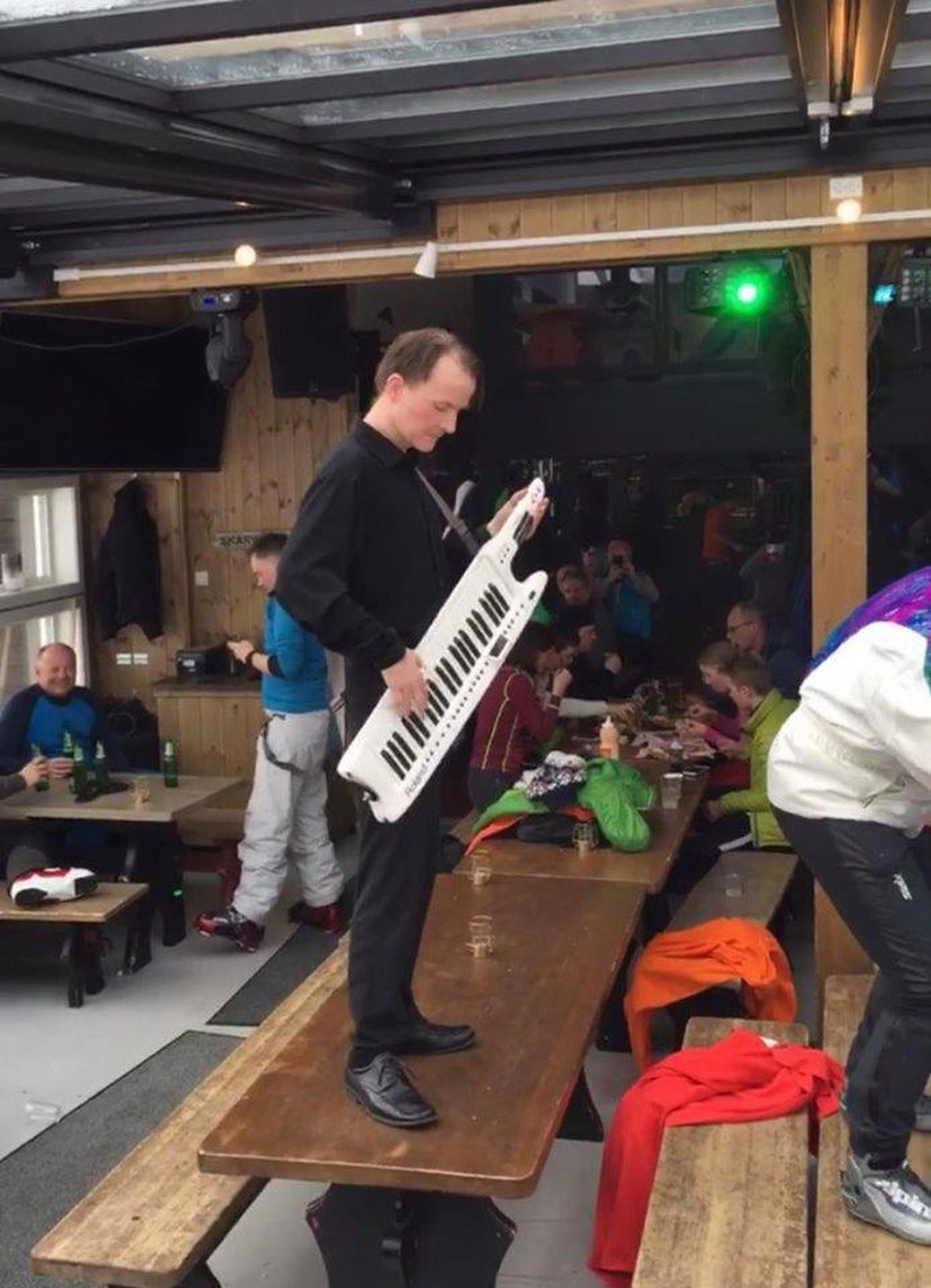 TJUE ÅR PÅ VEIEN: Dagfinn har spilt for «alle» i Re, på pianobarer og utesteder her og i byene rundt Re. Og som her; på afterski i Hemsedal. Foto: Privat.
