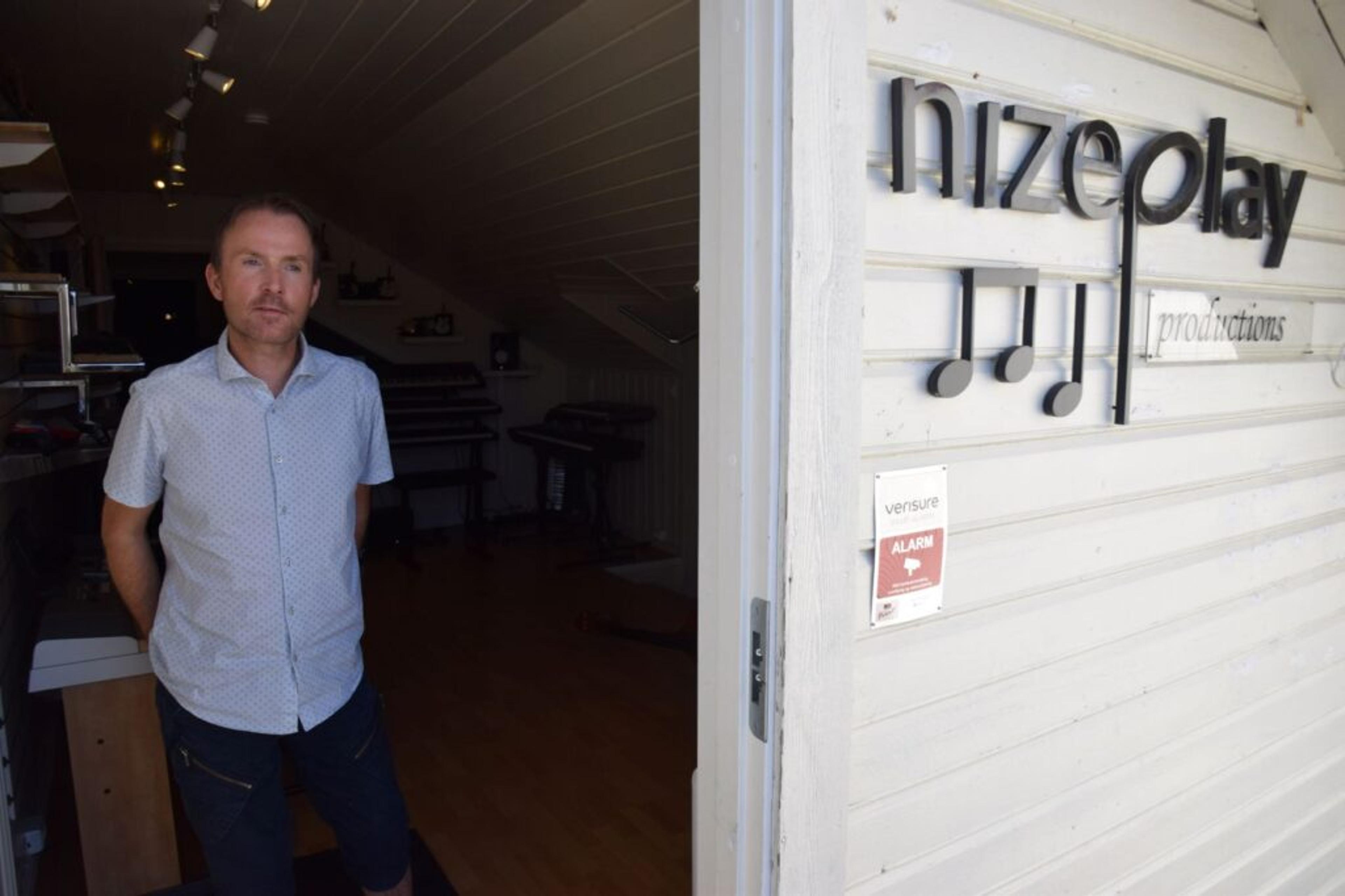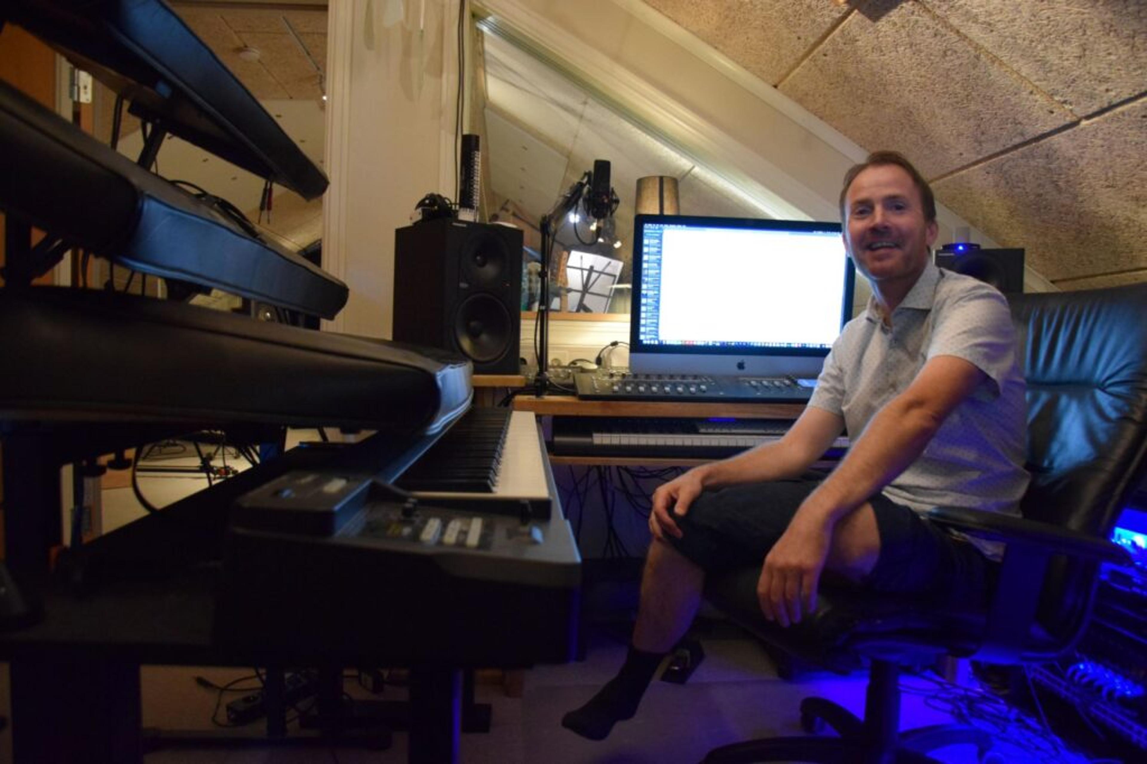 SPILLER INN: Dagfinn gjør mye i studio sitt på Svinevoll. Han har hovedvokal på alle låter. Men mye gjøres også i USA, som for eksempel koringa. – Musikkverden er liten, der mye skjer att og fram digitalt, forteller Dagfinn. Foto: Stian Ormestad.