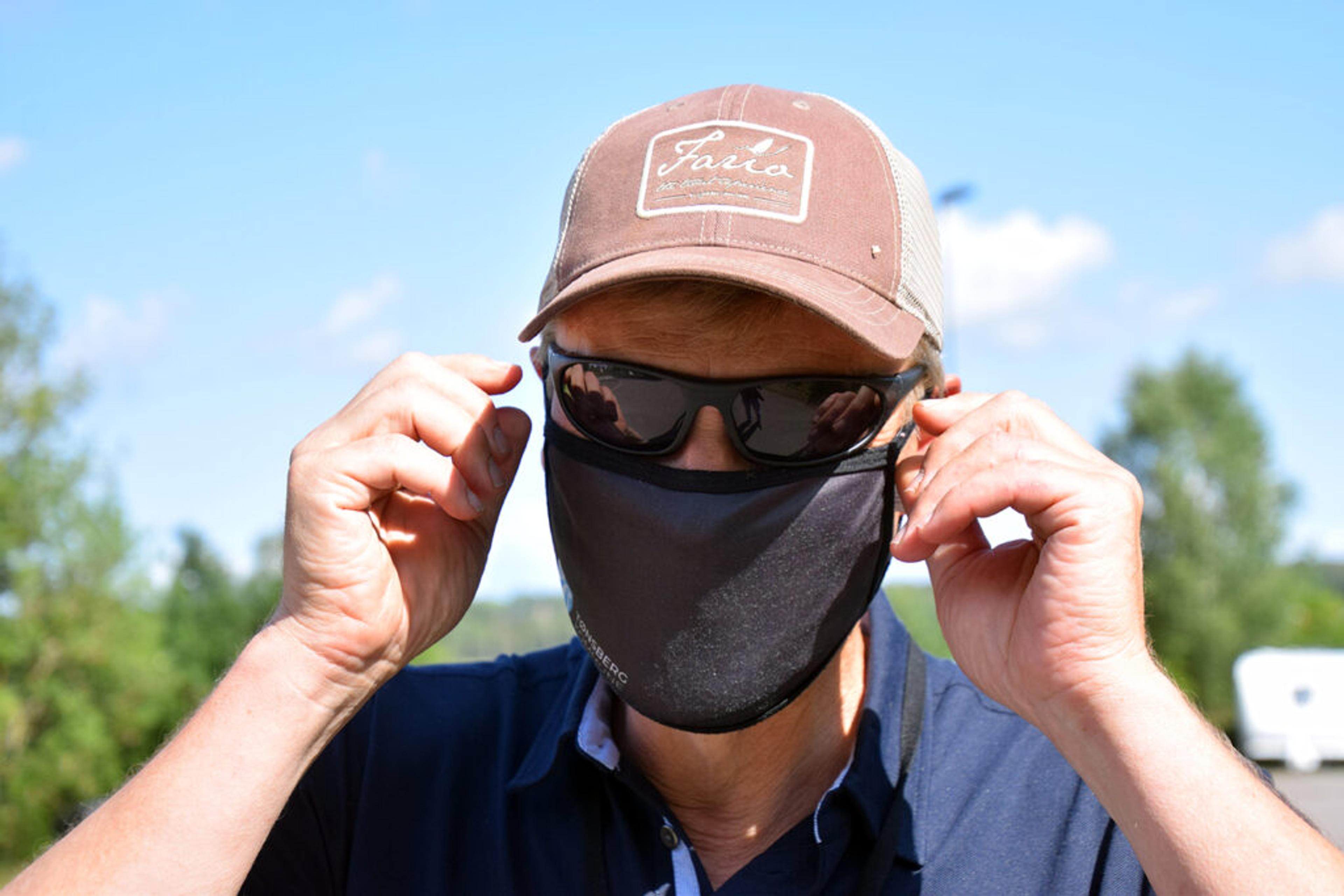 AV MED MUNNBINDET: Nå er det på tide å se hverandre igjen. Bildet er av korona-karantene kontrollør og tidligere lensmann i Re, Hans Petter Gulliksen, som var forbausa over hvor mange ensomme folk han møtte på sine kontroll-runder rundt om i Re. Foto: Stian Ormestad.