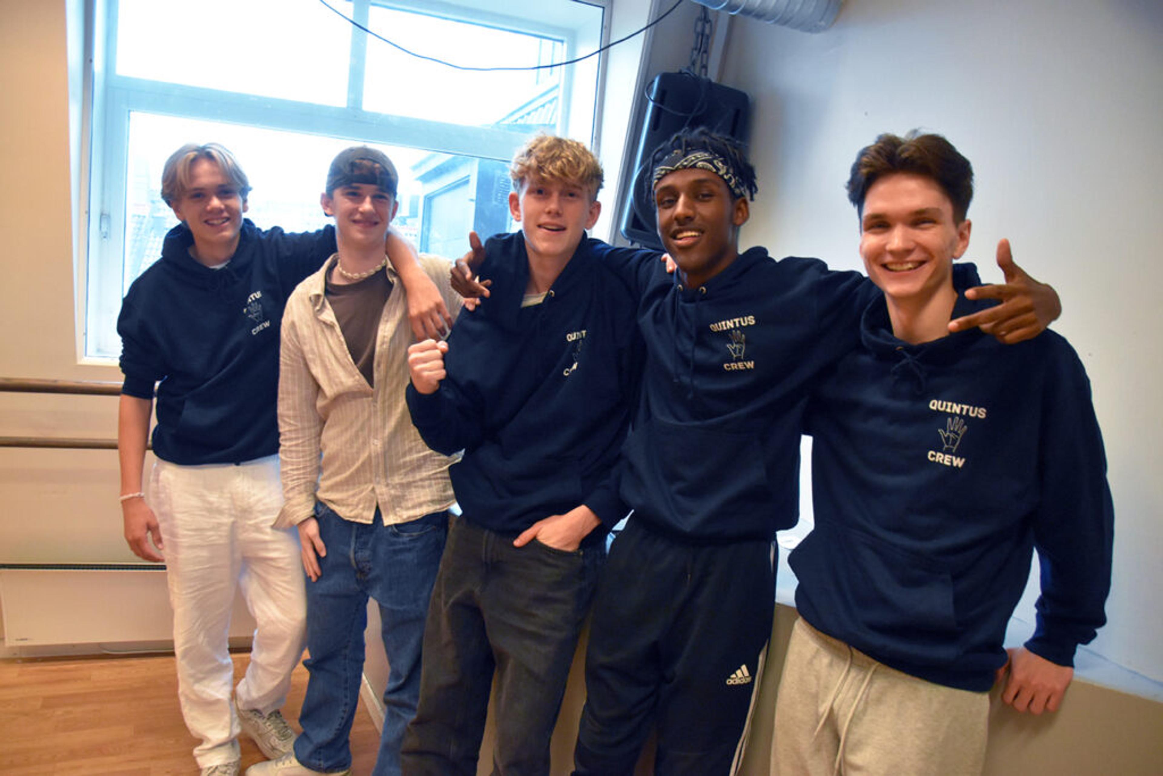 QUINTUS CREW: Med seg i crewet har Re-gutten Kasper Kalleberg (17) fra Valleåsen (i midten) Yuusuf (17) fra Andebu, Askild (18) fra Tønsberg, Tobias (17) fra Eik og Linus (16) fra Nøtterøy. Foto: Stian Ormestad, ReAvisa.