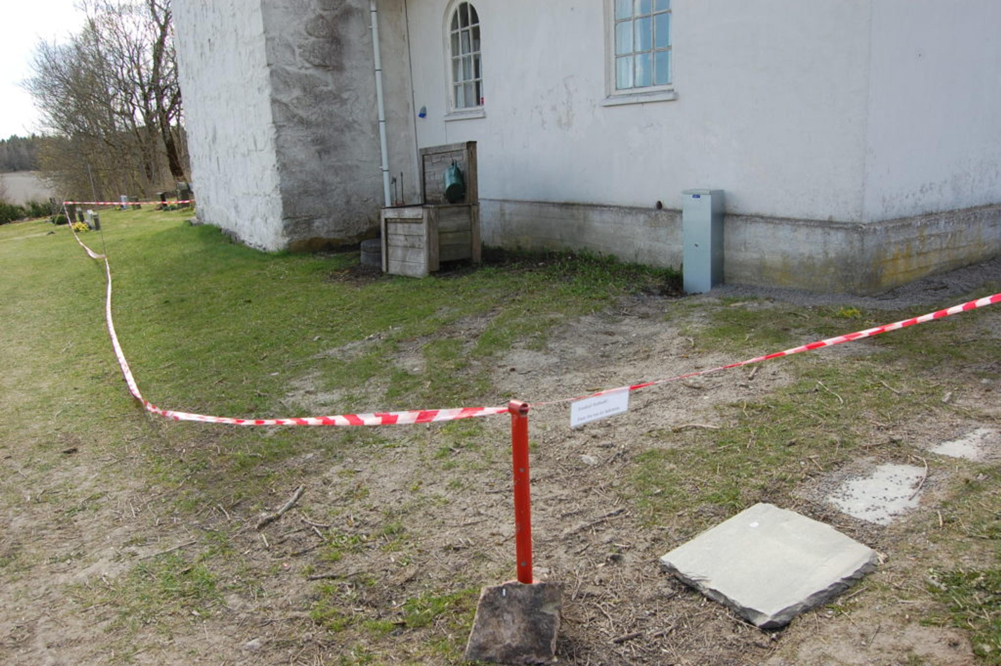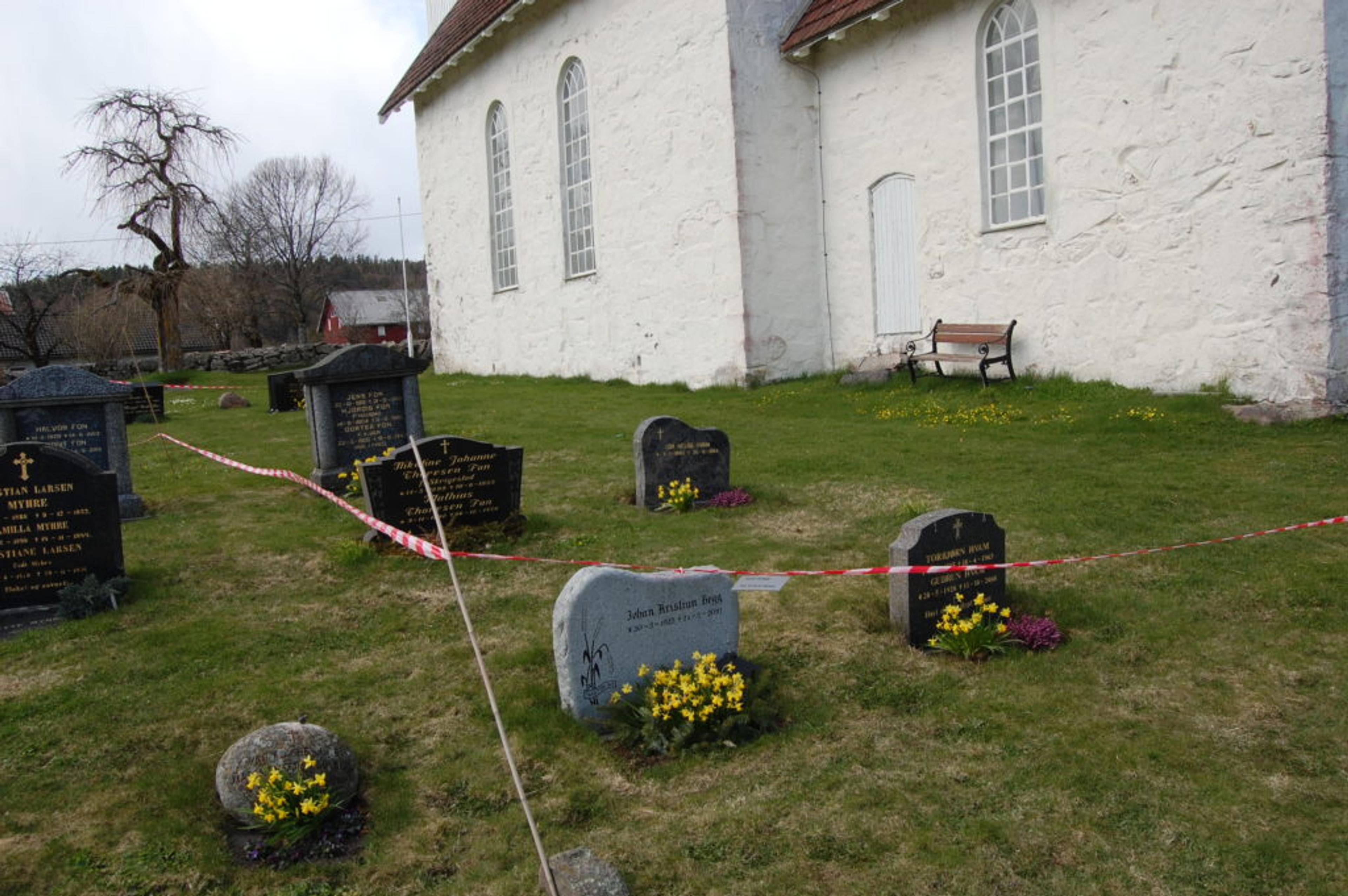 SPERREBÅND: Deler av kirkegården ved Fon kirke var sperra av gjennom våren og sommeren for tre år siden. Kirkevergen frykta at takstein skulle ramle ned og skade noen, på grunn av råteskader i kirketaket. Arkivfoto: Håkon Westby.