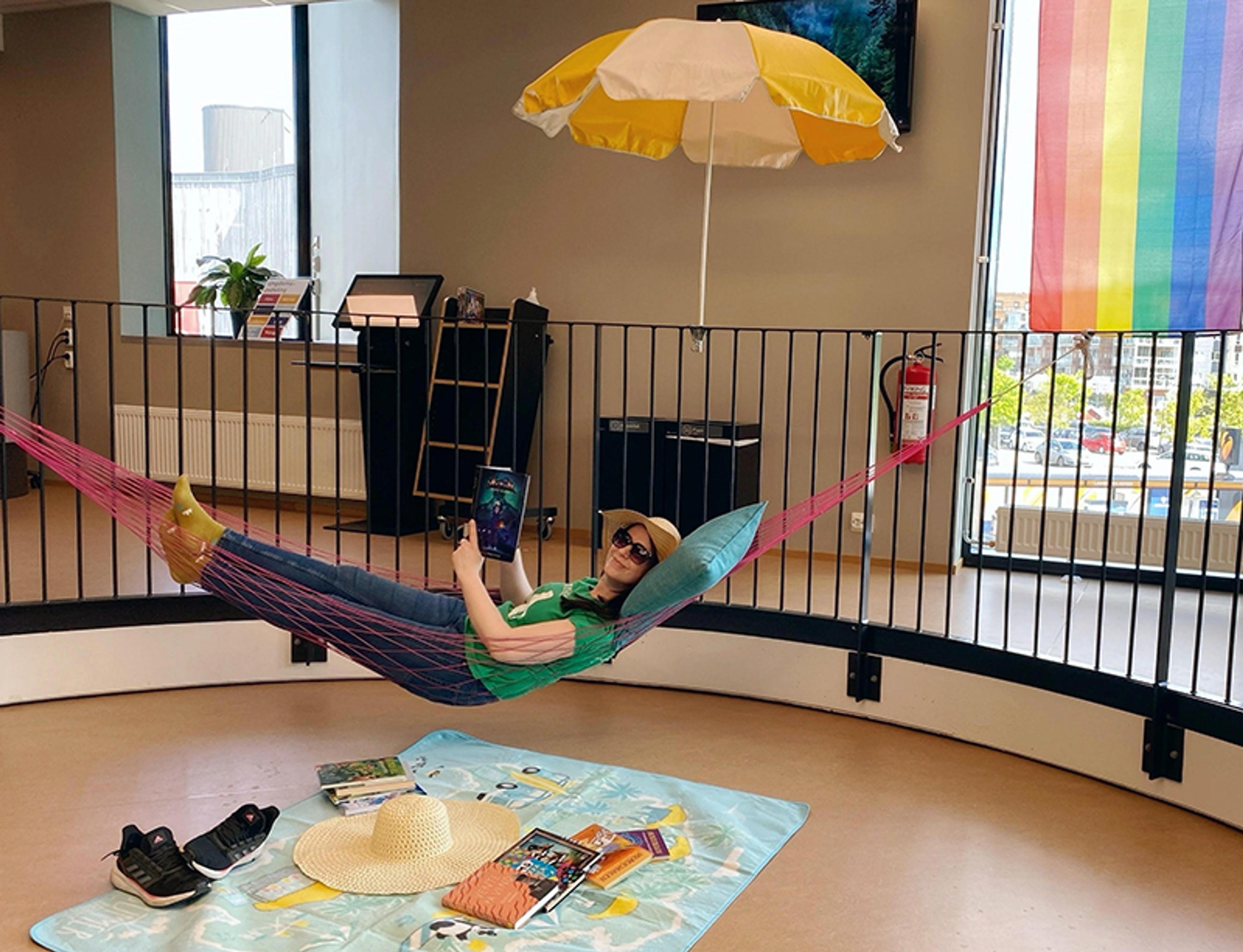 SOMMERLES: På Revetal bibliotek er det allerede full sommerstemning, nå som det gjøres klart til årets Sommerles-kampanje, forteller bibliotekar Hege-Kristin Beck. Foto: Revetal bibliotek.