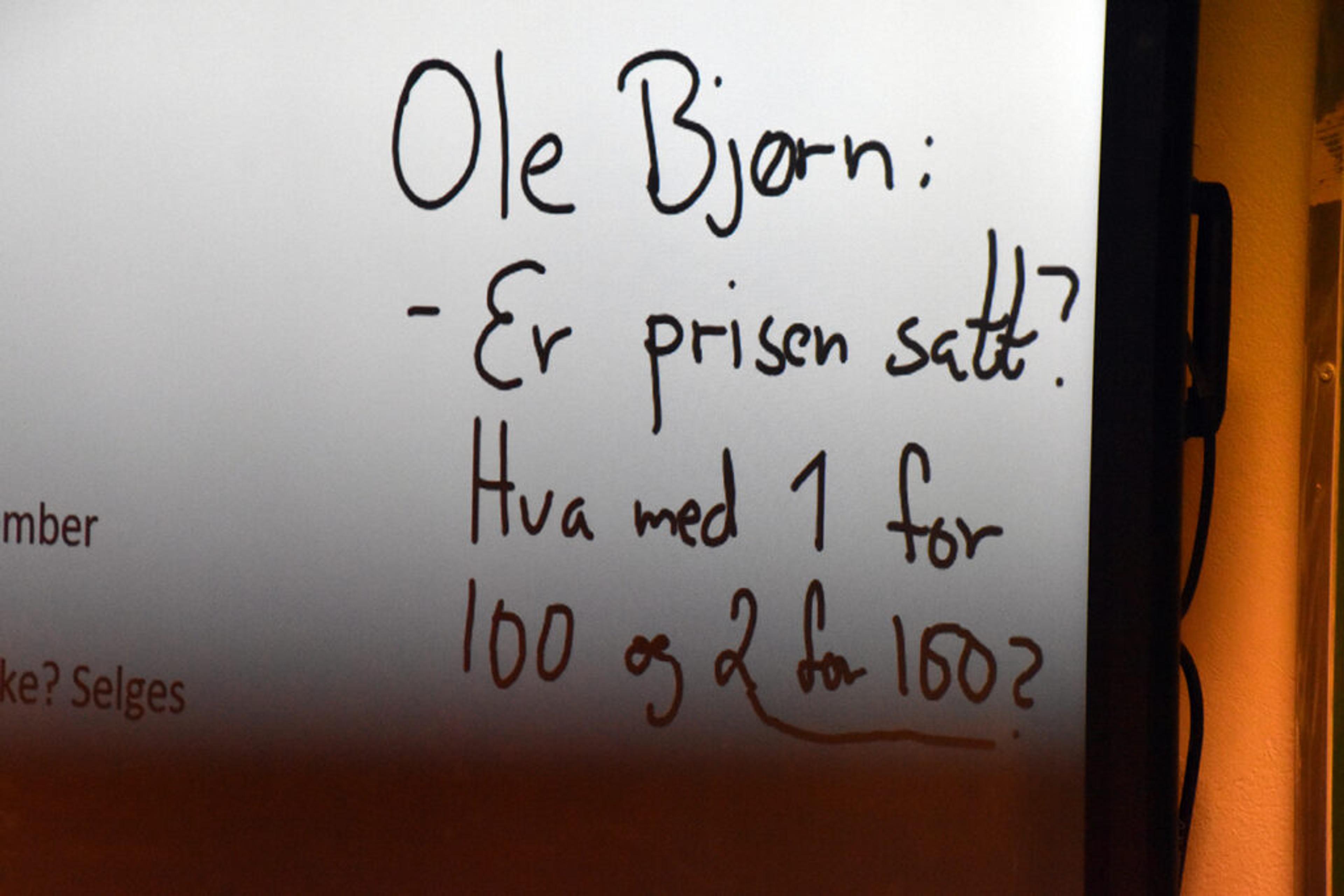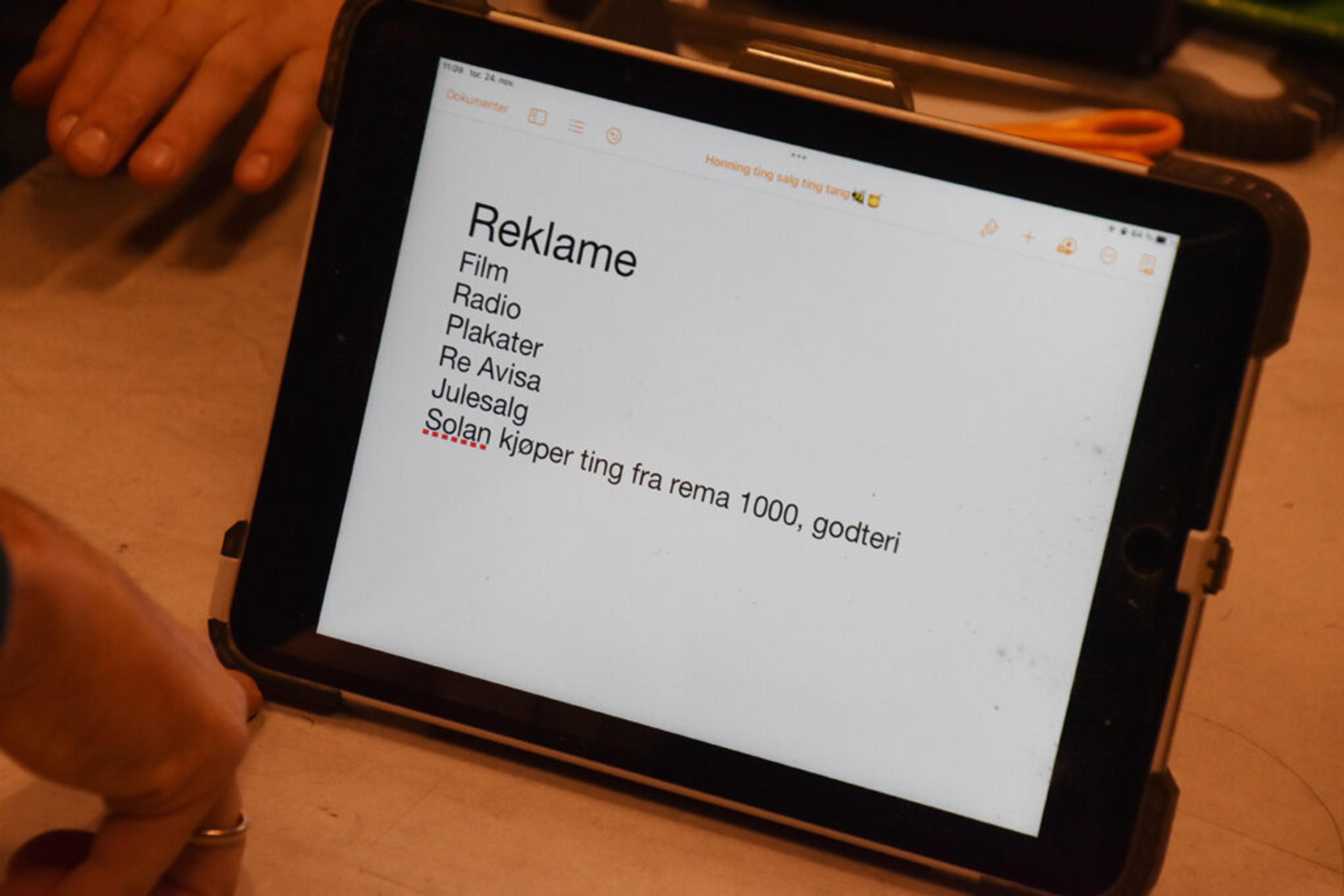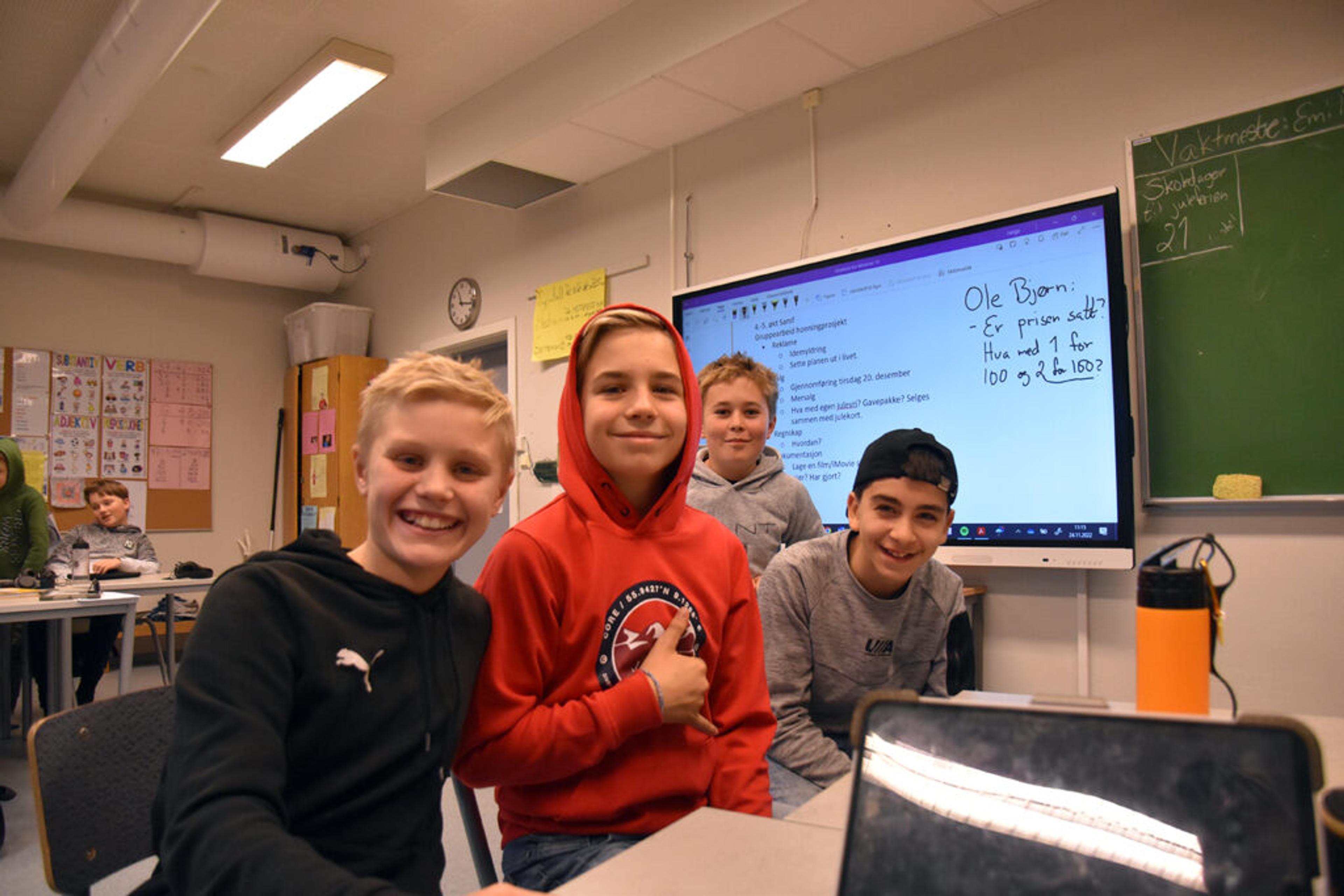 Rett borti gangen sitter 7. klasse og planlegger markedsføringa – det viktigste blir å selge honning på juleavslutninga. Der vil glassene bli pent pakka inn, og elevene foreslår tre for prisen av to-dealer.