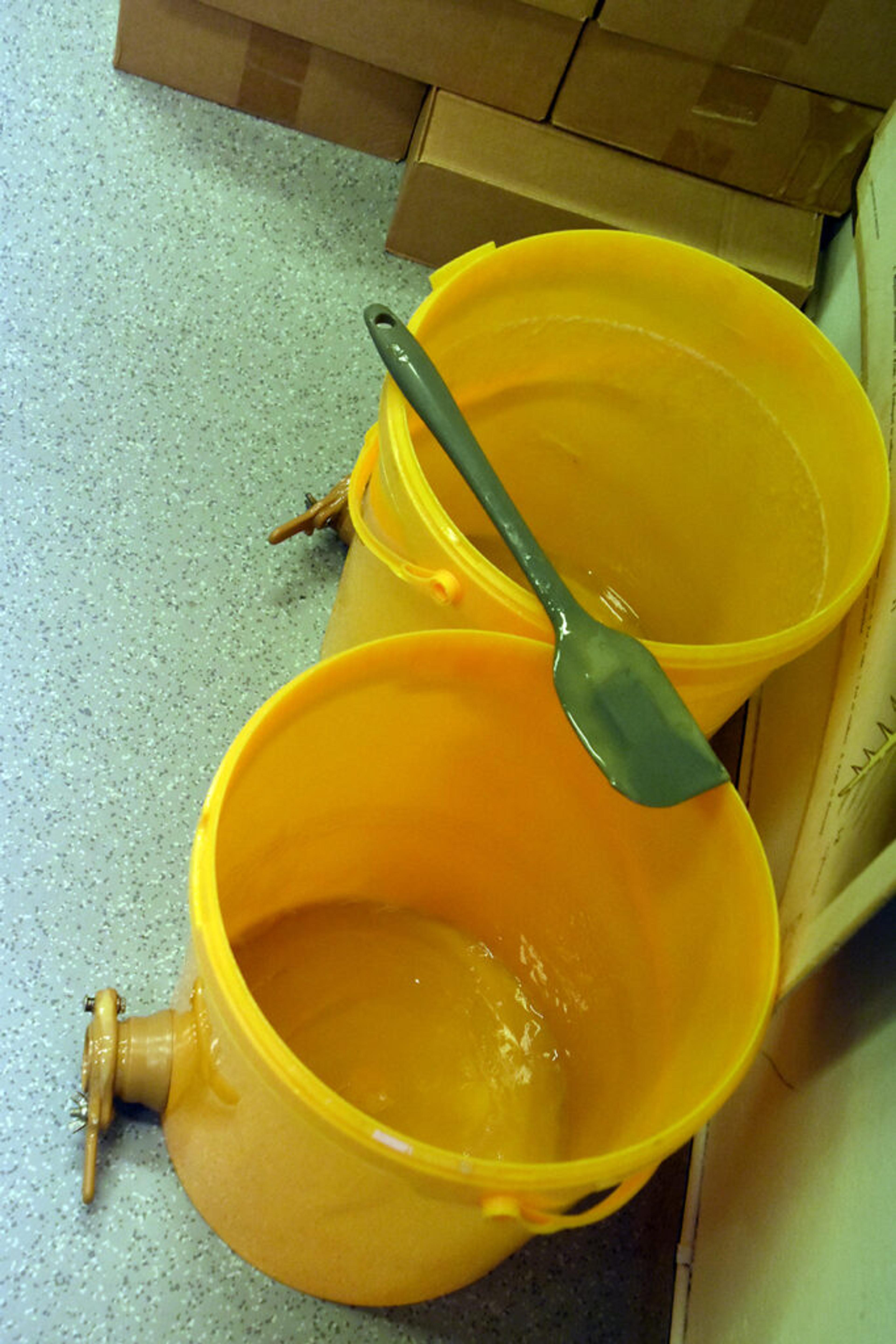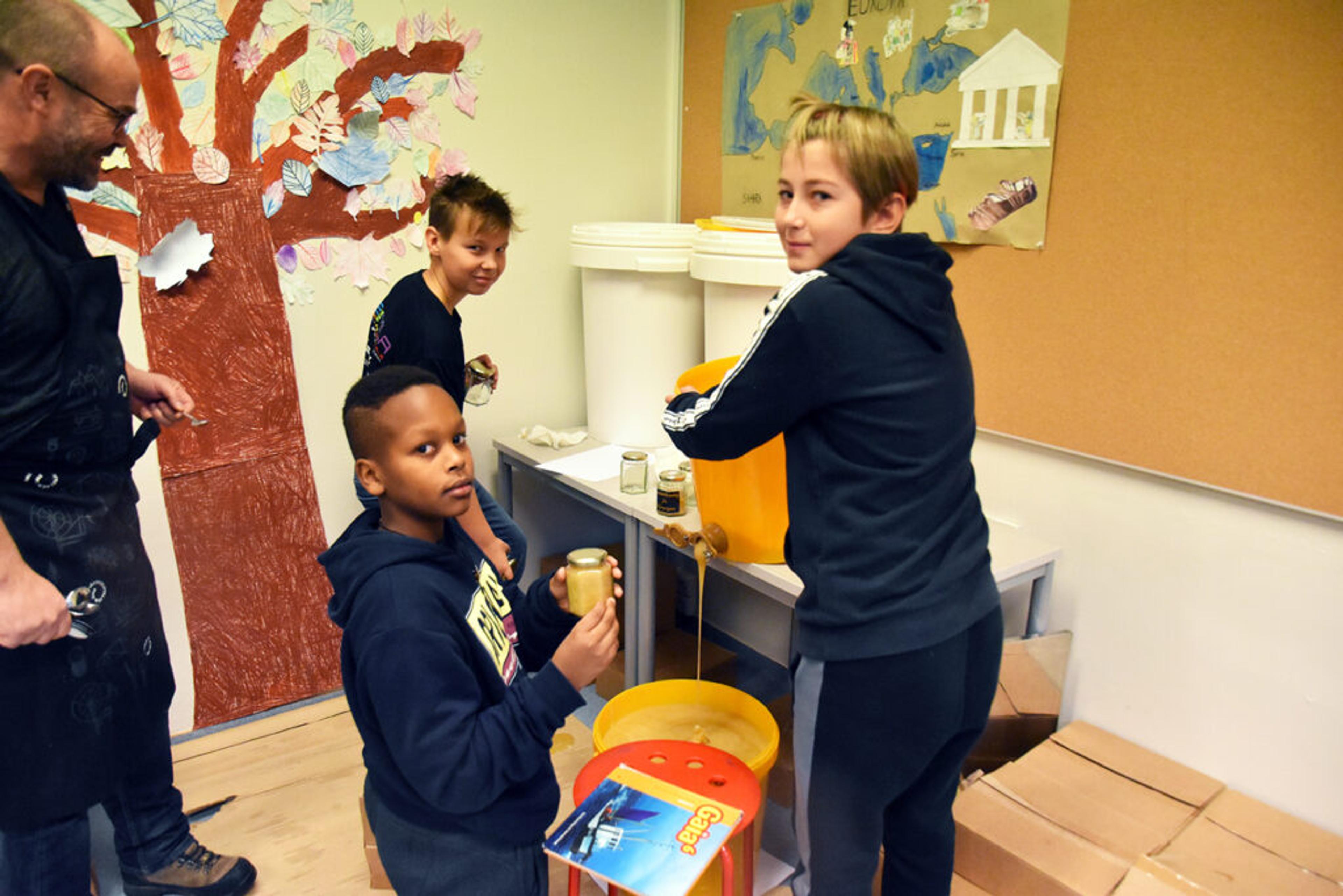 – Oi! Det glasset her blir veldig fullt!, sier Nathan med glasset i handa mens Kacper skrur igjen krana så fort han makter. Honningen er tjukk og fin og kommer litt i rykk og napp: