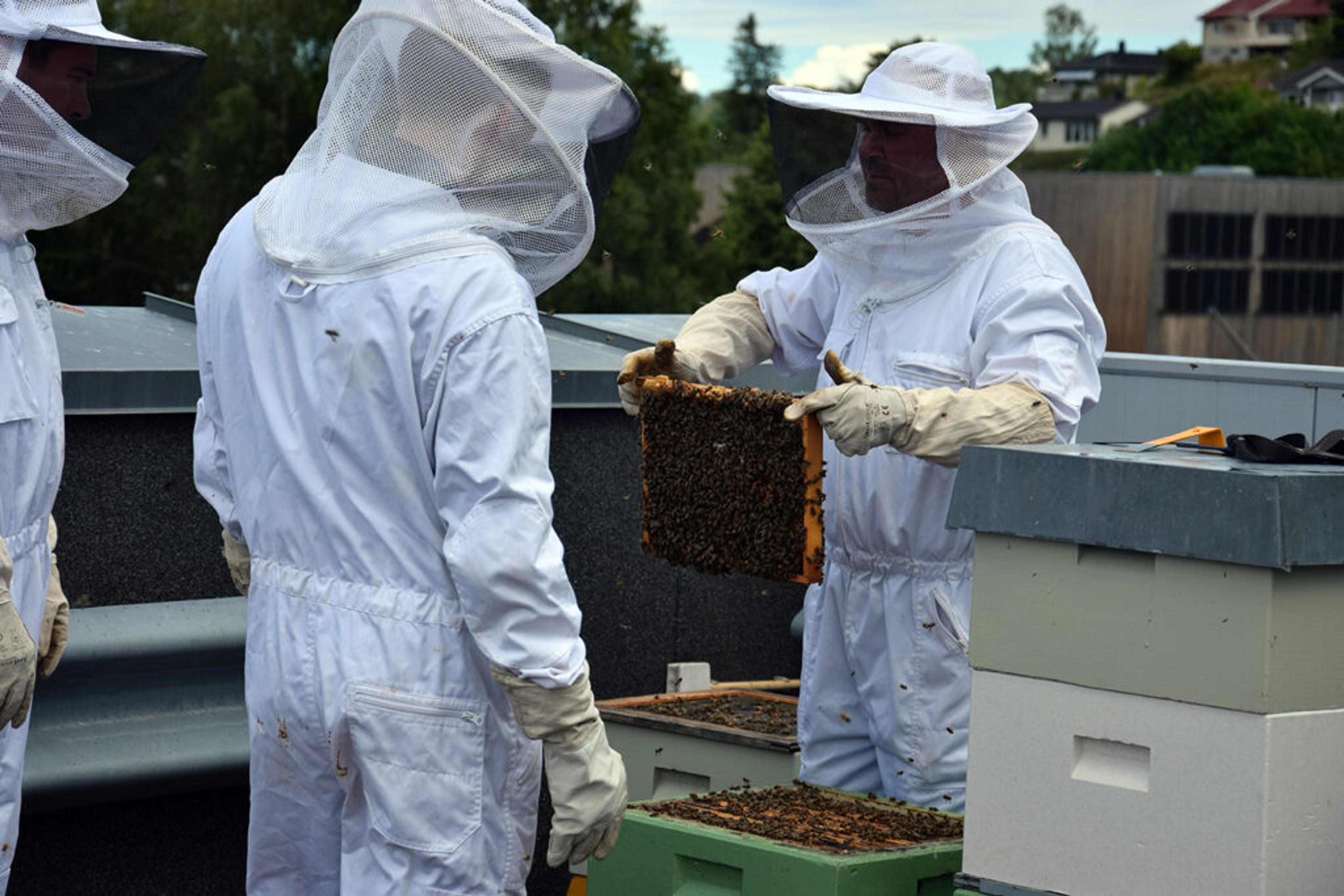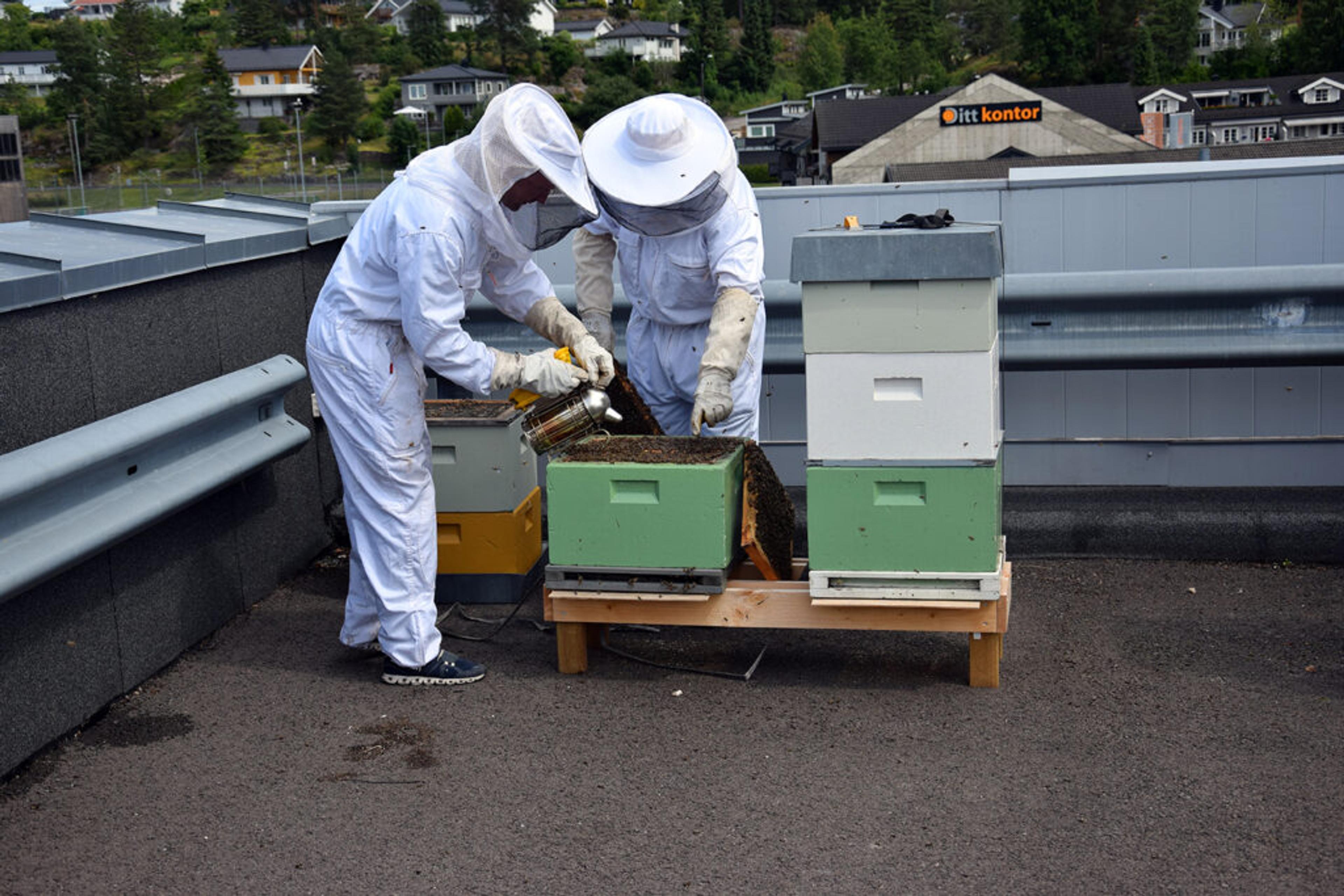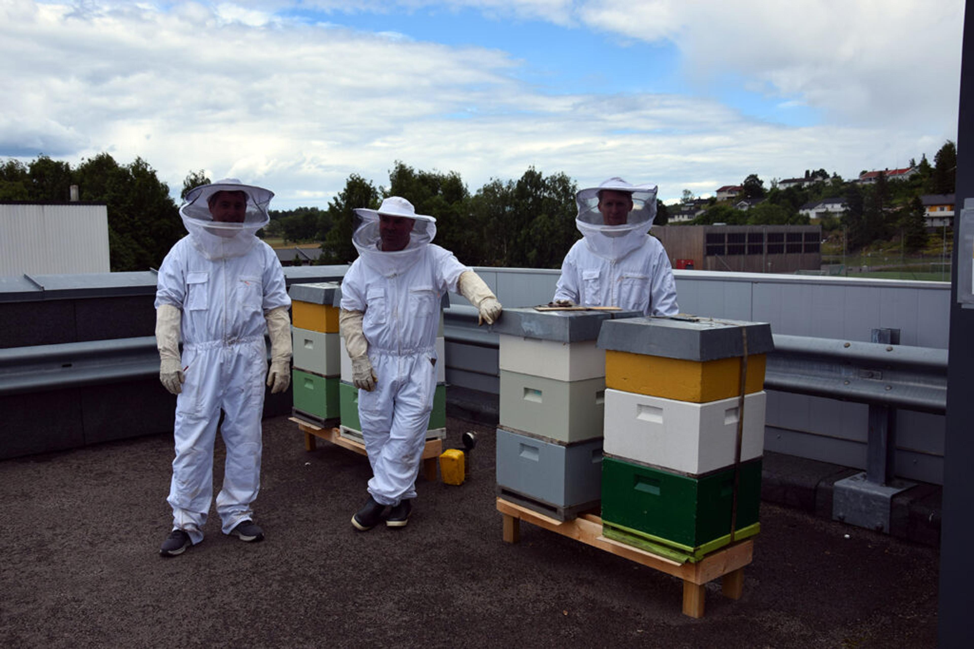 På toppen av parkeringshuset på Re-torvet er det i tillegg til biler nå også bier – her er det parkert fire bikuber som skal produsere kortreist honning.