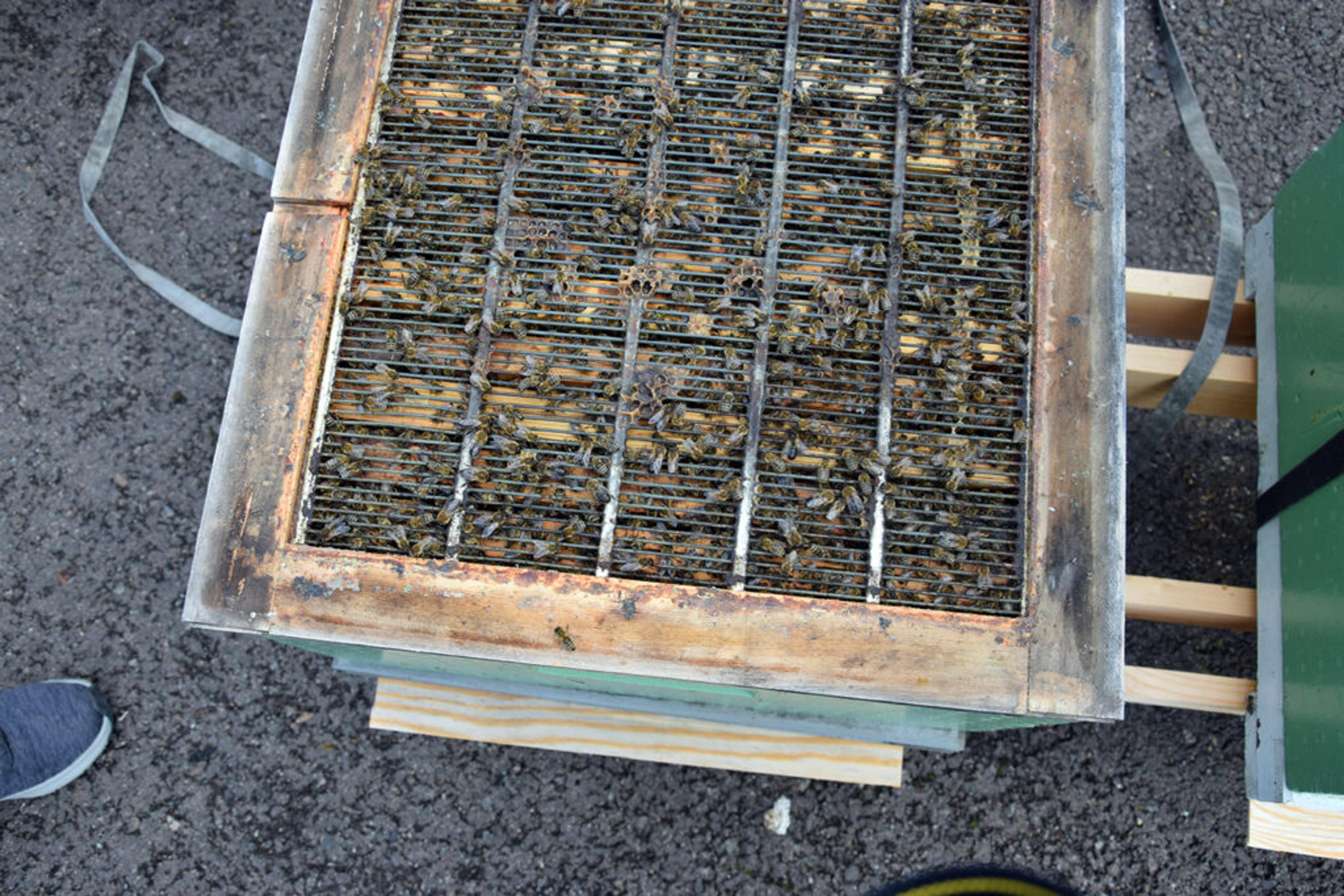 DRONNINGGITTER: Dette hindrer dronninga i å komme opp i «skattekassene» der honningen blir lagra, slik at hun ikke legger egg blant honningcellene. Foto: Håkon Westby.