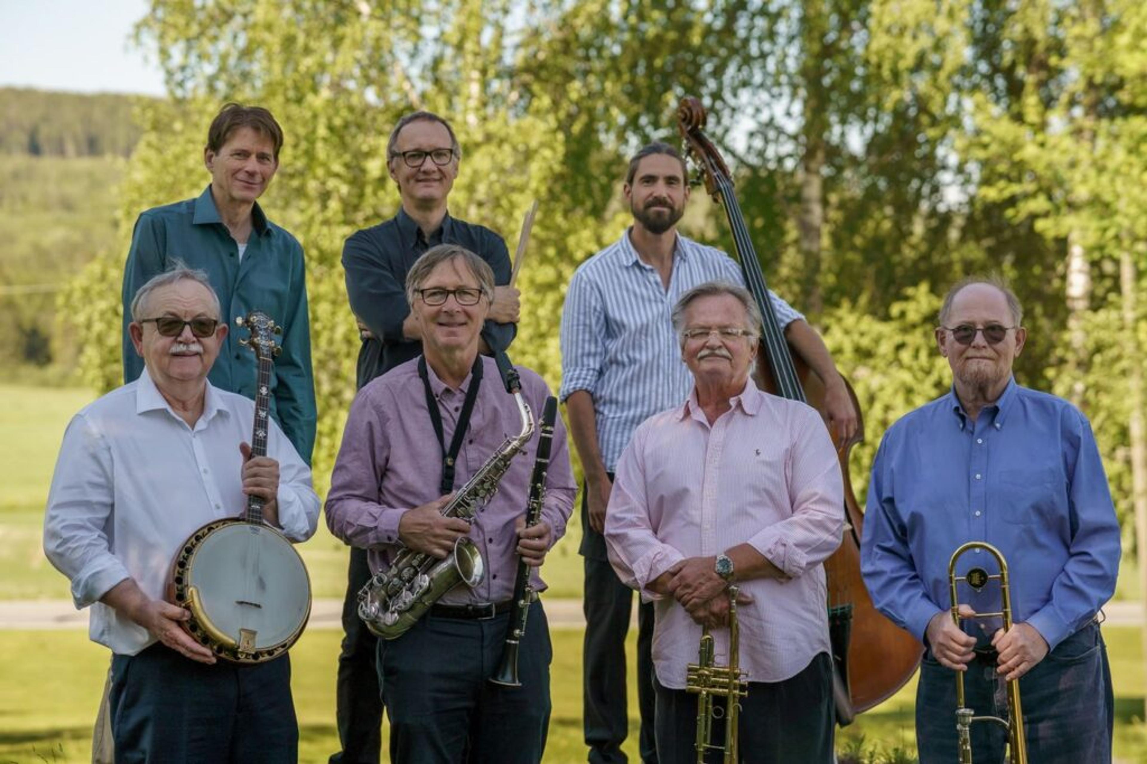MAGNOLIA JAZZBAND: Gunnar Gotaas, trombone, Georg Michael Reiss, klarinett og saksofon, Anders Bjørnstad, trompet, Morten Gunnar Larsen, piano, Torstein Ellingsen, trommer, Børre Frydelund, banjo og vokal, og Sebasian Haugen-Markussen, bass. Arkivfoto.