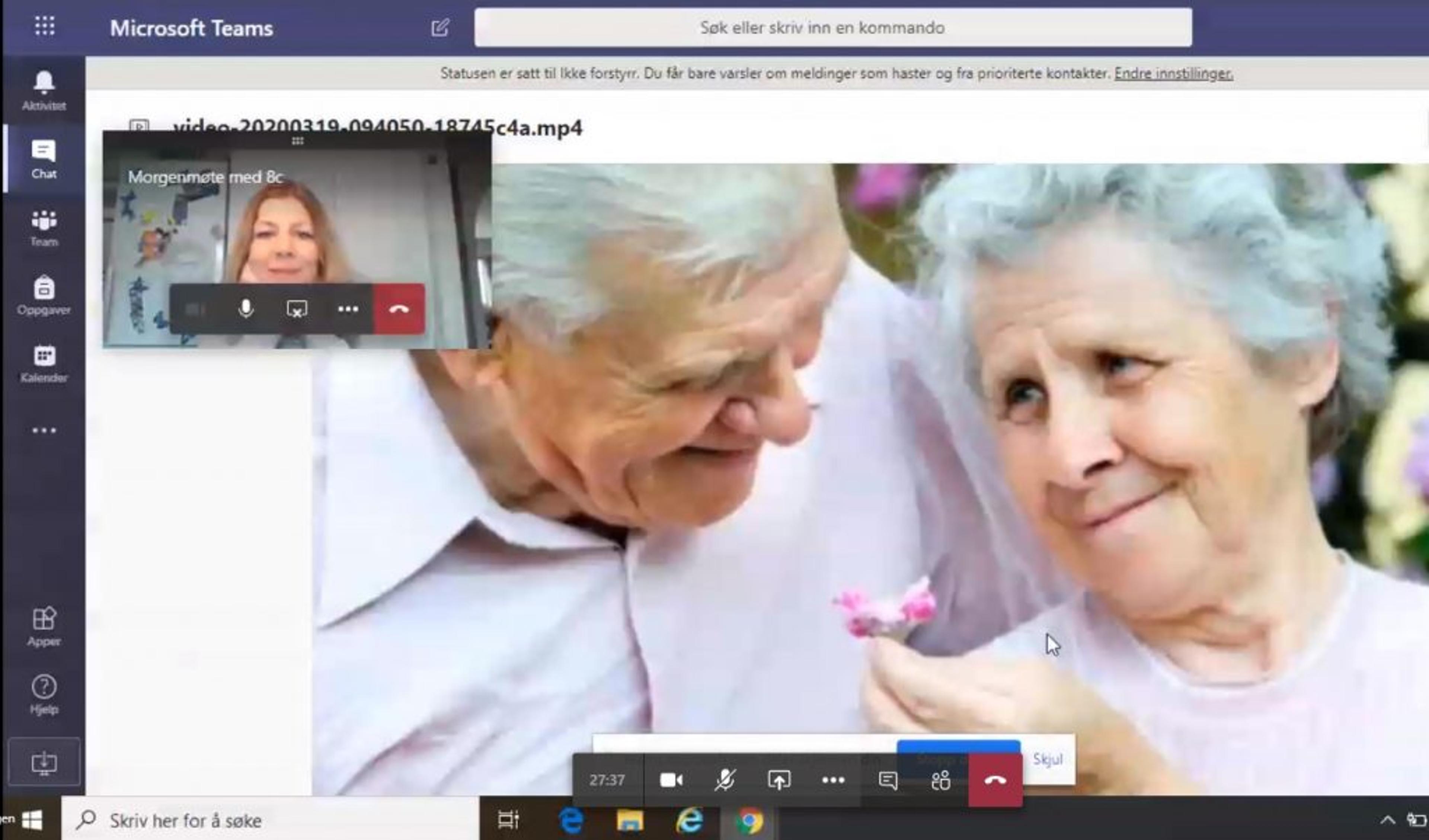 REVETAL UNGDOMSSKOLE-LÆRER: Rikka Rivrud kjører undervisningen hjemmefra kjøkkenet på Revetal. Skjermdump.