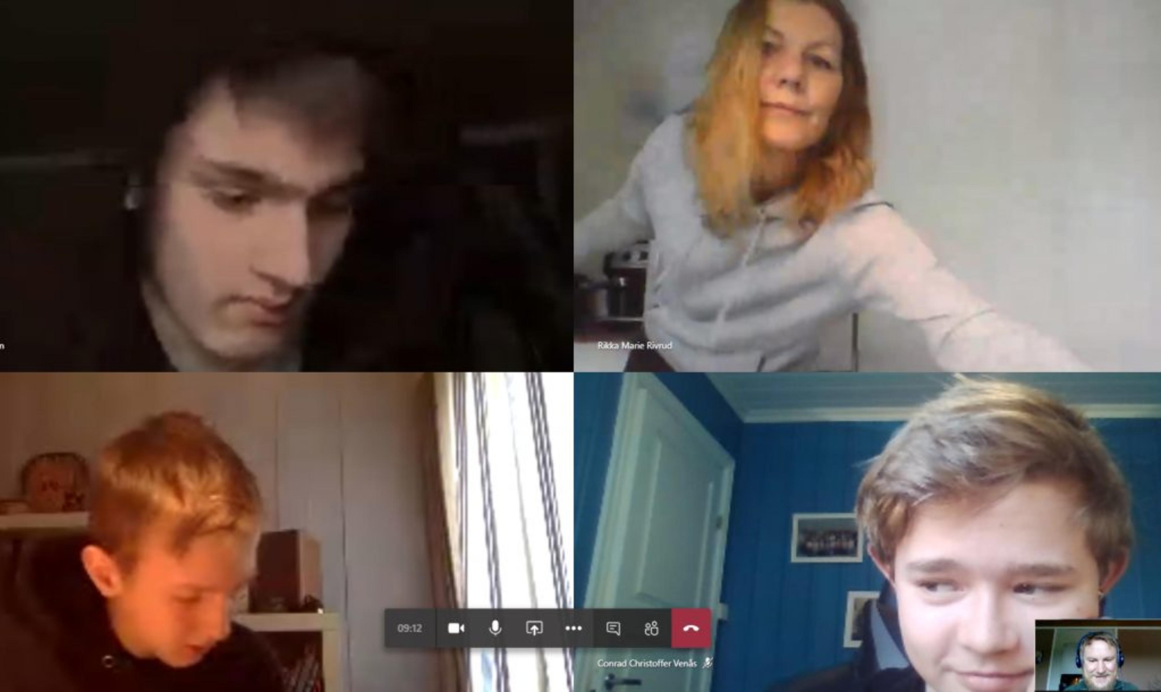 FULL FART: ReAvisa fikk være med inn i det digitale klasserommet til klasse 8C ved Revetal ungdomsskole. På skjermen ser vi Vinsent-Napalm Tafaj Terkelsen, lærer Rikka Rivrud, Otto Lagarhus jr og Conrad Christoffer Venås, og nederst i hjørnet den bittelille Re-daktøren. Gutta kjørte en digital jam over Teams i musikktimen. Skjermdump.