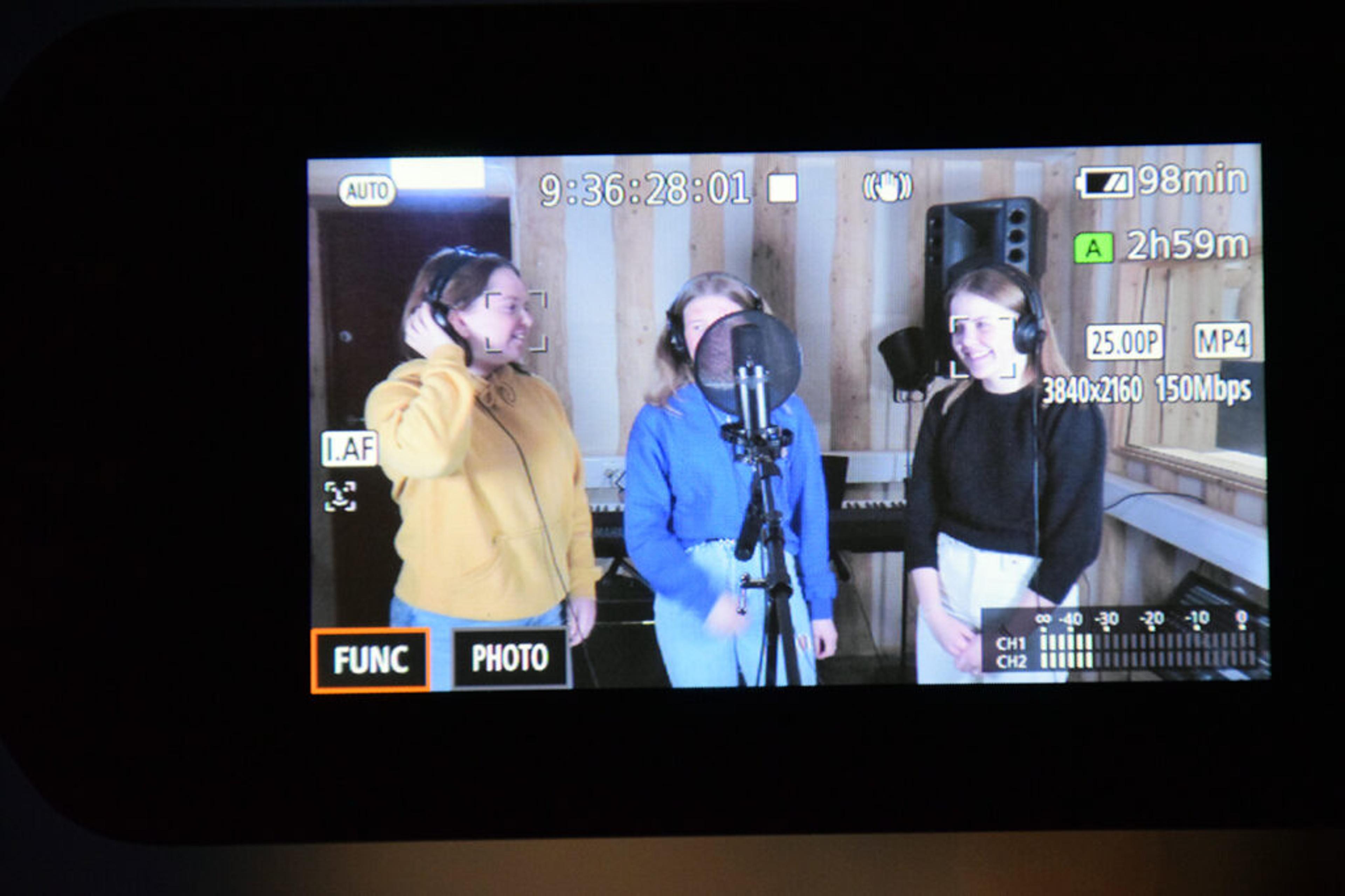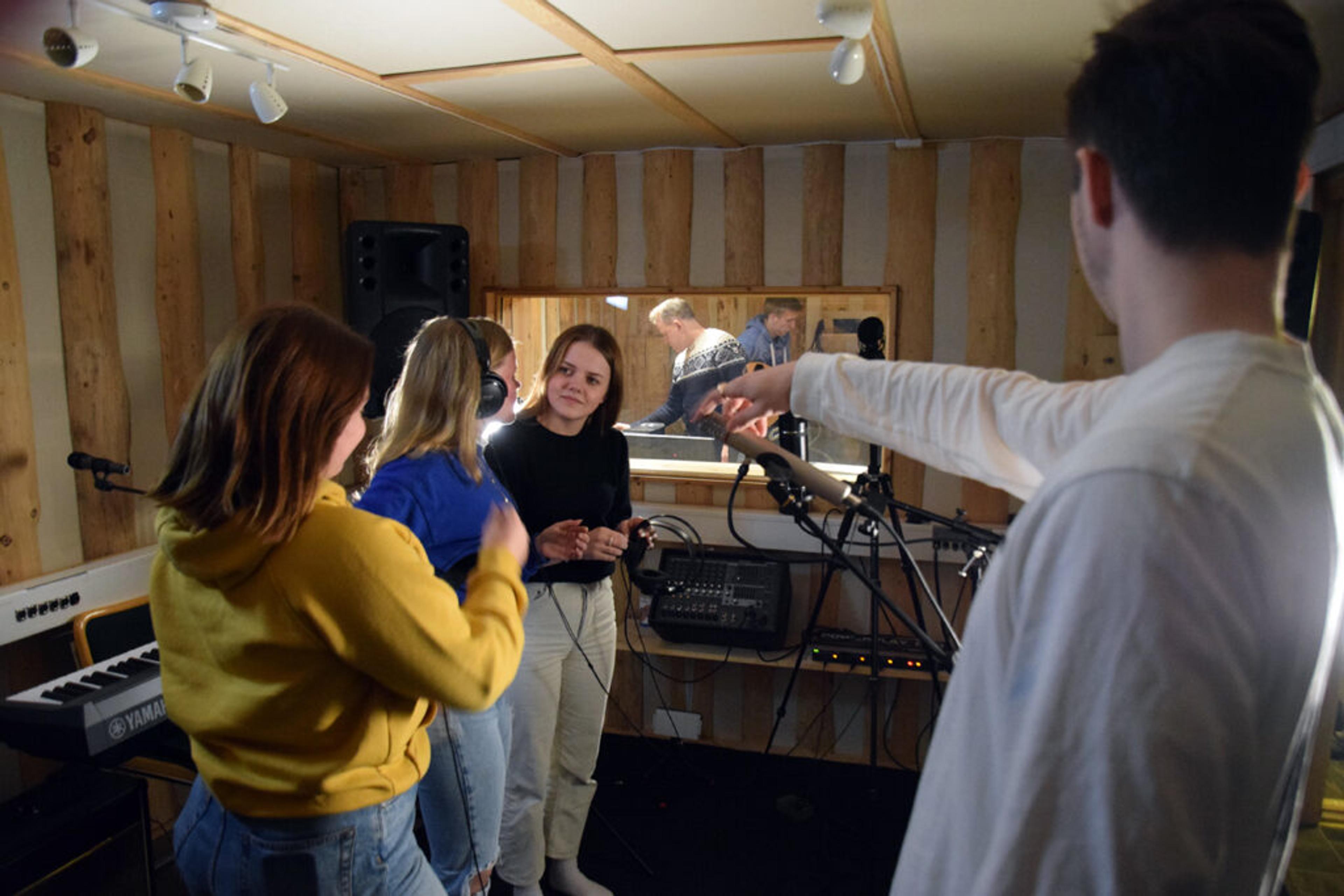 SISTE FINPUSS: Trioen Nora Dalseth (15), Christina Hoff Bøe (15) og Kaja Glåmen (15) er klare for å spille inn sin sang. Foto: Stian Ormestad.