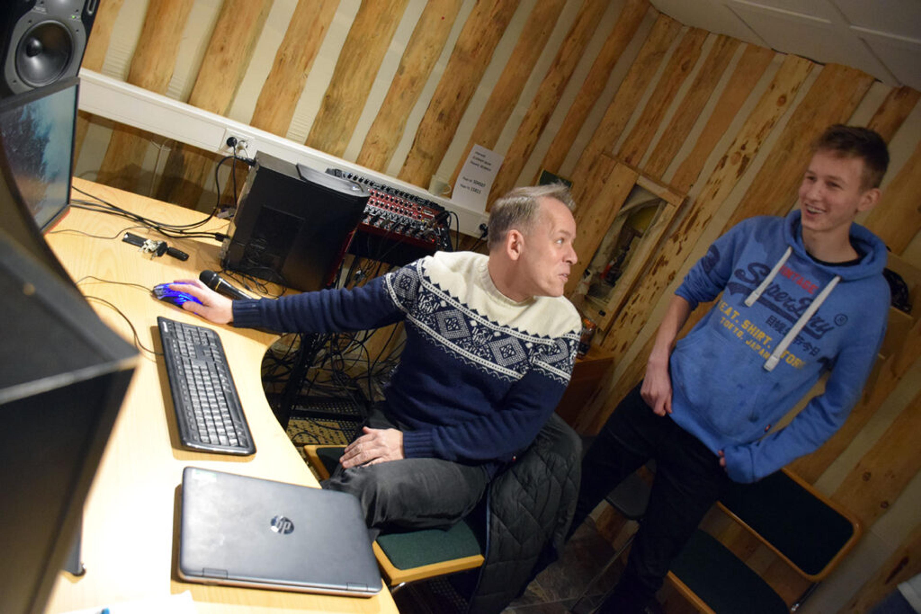 STOR STEMNING: Otto Lagarhus junior (14) trakterer gitar i verdensklasse, og Frank Wedde bak spakene i studio er over seg av begeistring. Foto: Stian Ormestad.
