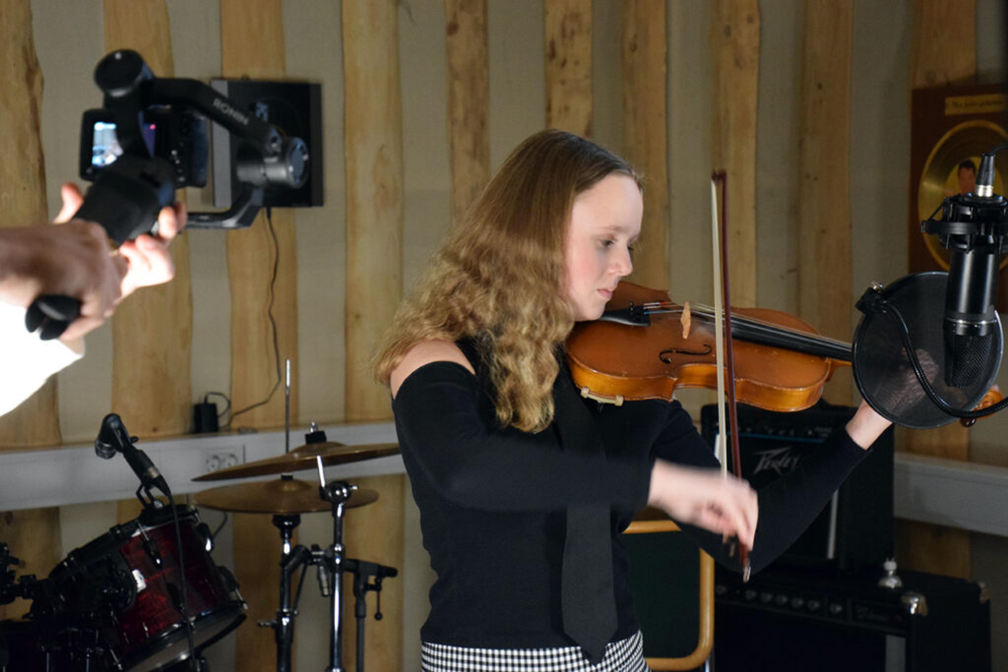 – Det er første gang jeg spiller inn musikk så proft som dette, forteller Aurora Jonassen (14) fra Revetal.
