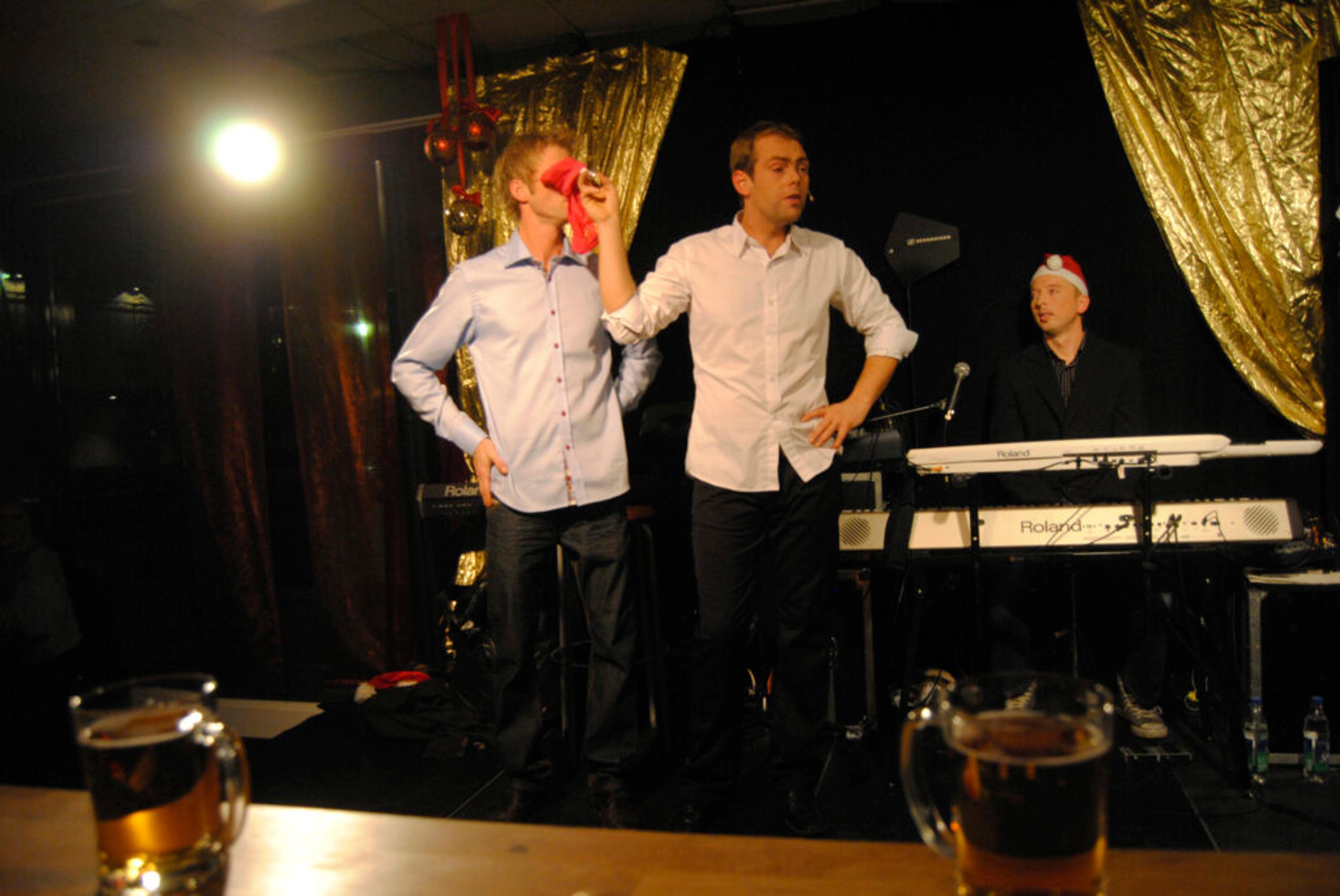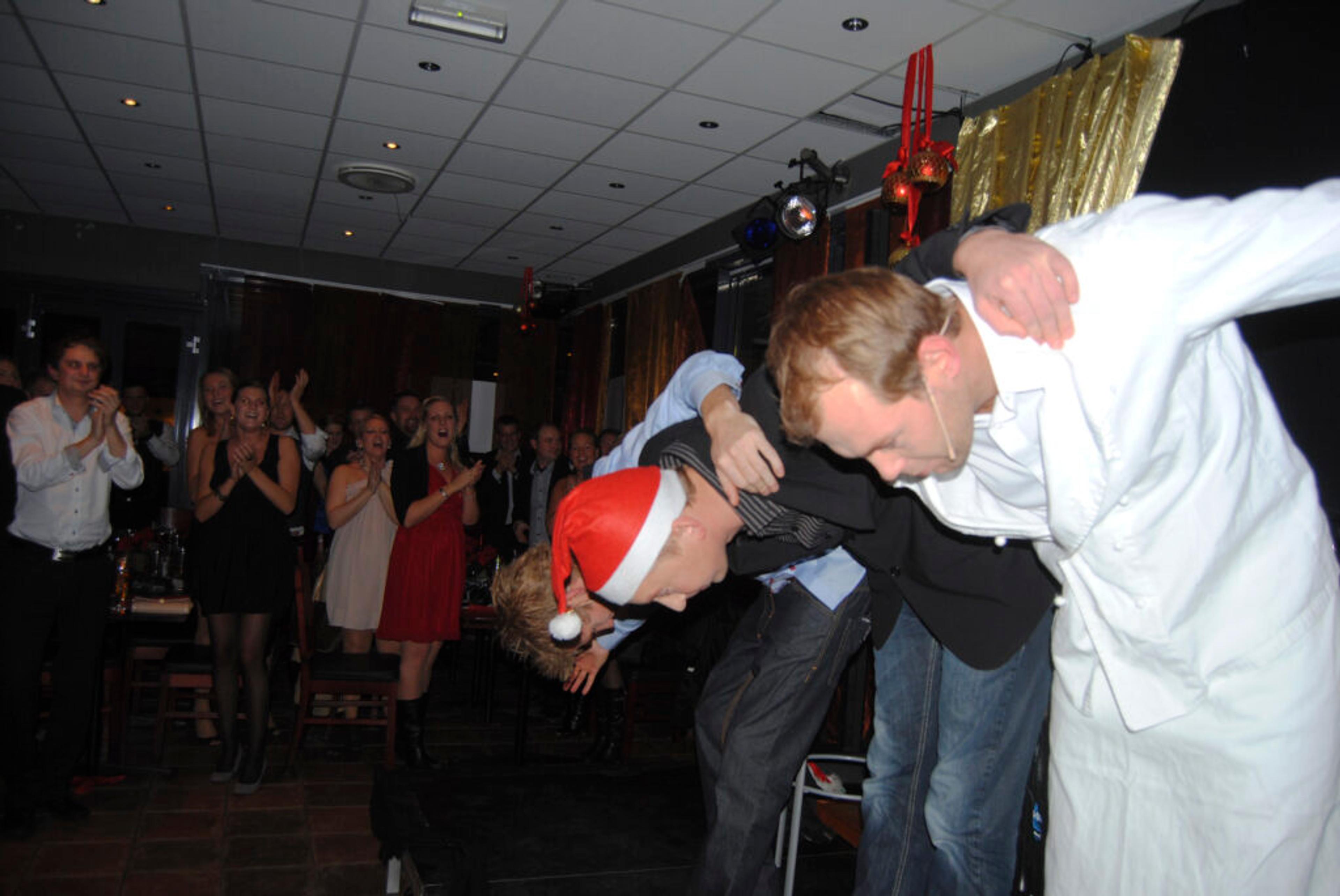 FØRSTE SESONG: Her takker og bukker Tommy og Harald for seg etter det aller første juleshowet på Revetal. Siden den gang har det blitt en latterlig fin tradisjon. Arkivfoto: Stian Ormestad.