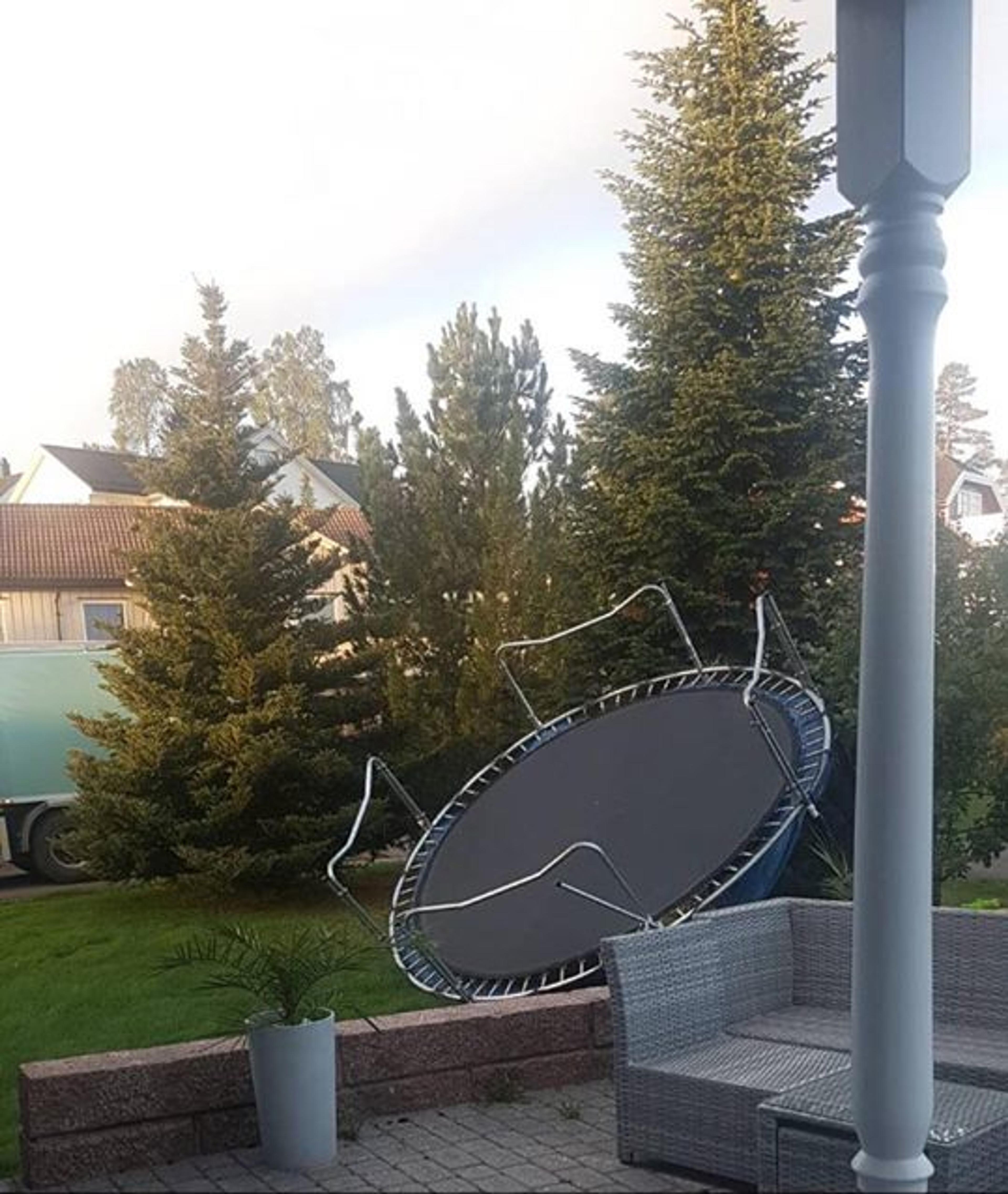 VINDKAST: Natt til i går var det også noen kraftige vindkast over Re, som for eksempel i Revetalåsen der vinden tok tak i ei trampoline og et epletre. Det blir enda verre ifølge meteorologene i kveld og natt. Foto: ReAvisa-leser.