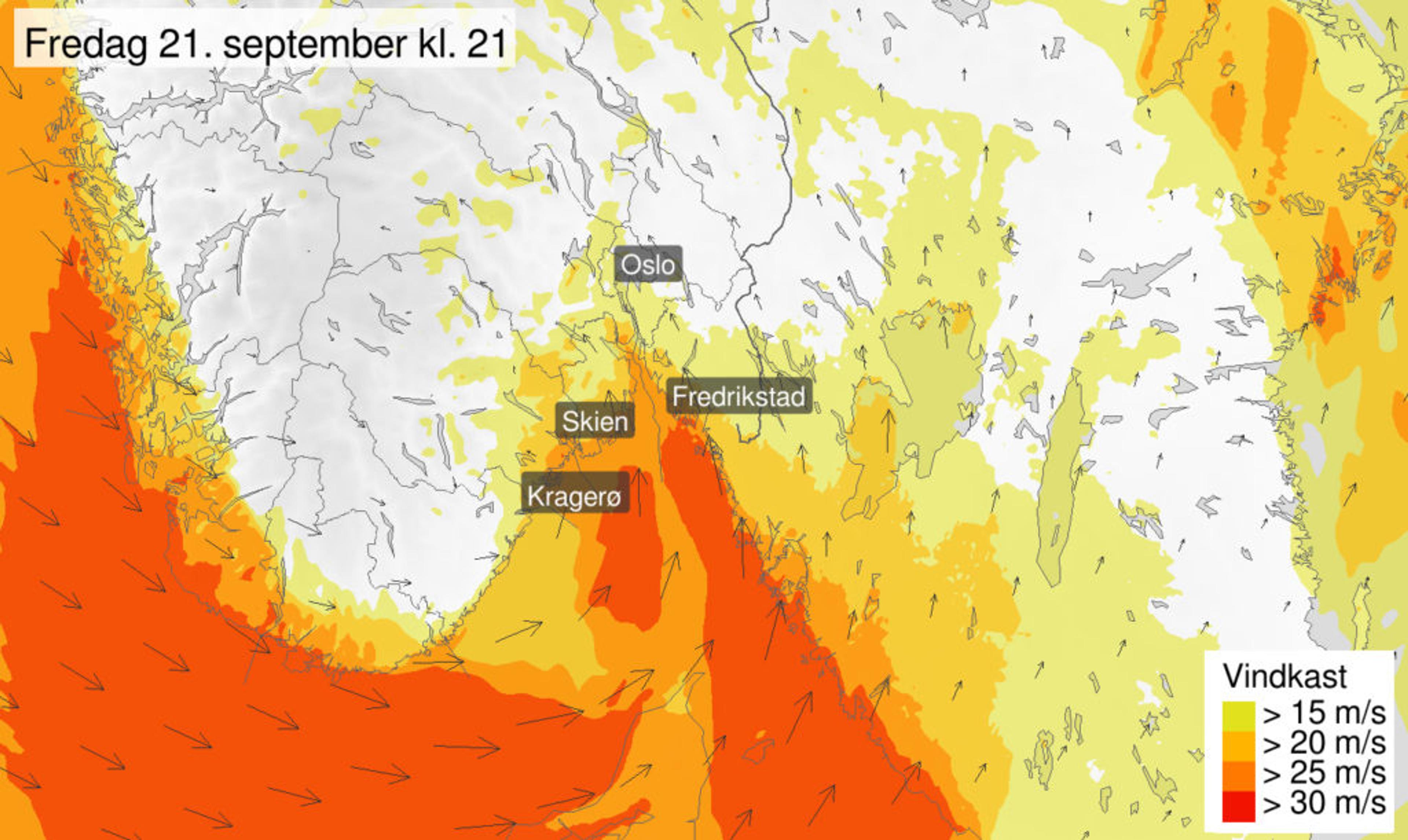 UVÆR PÅ VEI: Farenivået er oppgradert til det høyeste farenivået for vindkast Vestfold, Østfold, Oslo og Akershus. Illustrasjon: Meteorologisk Institutt.