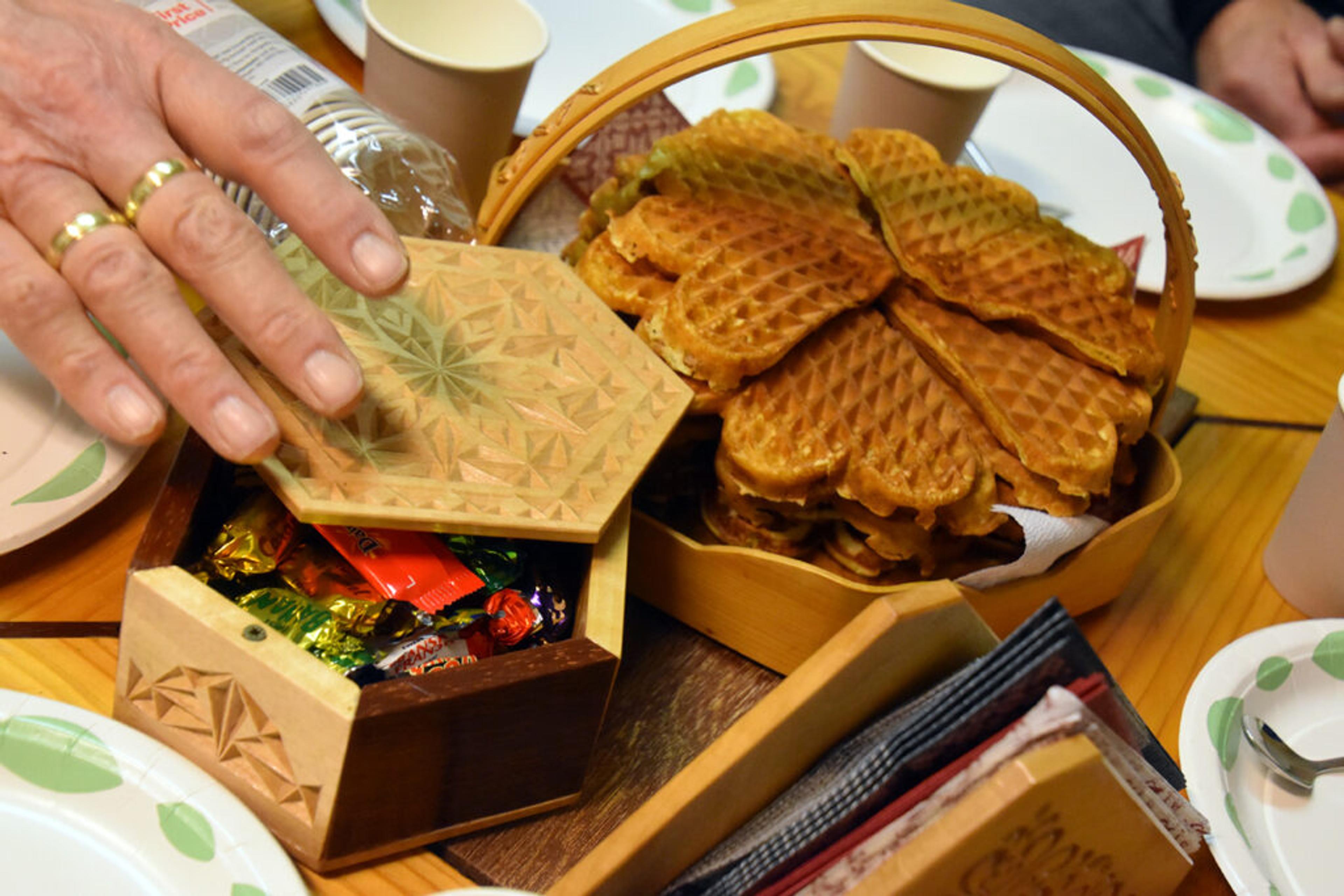 Da lokalavisa var innom var det julegaveproduksjon på gang. En stokk av kirsebærtre er veldig populær. Emil har laga et skrin av det, med et lokk av bjørk, med fantastiske utskjæringer på toppen.