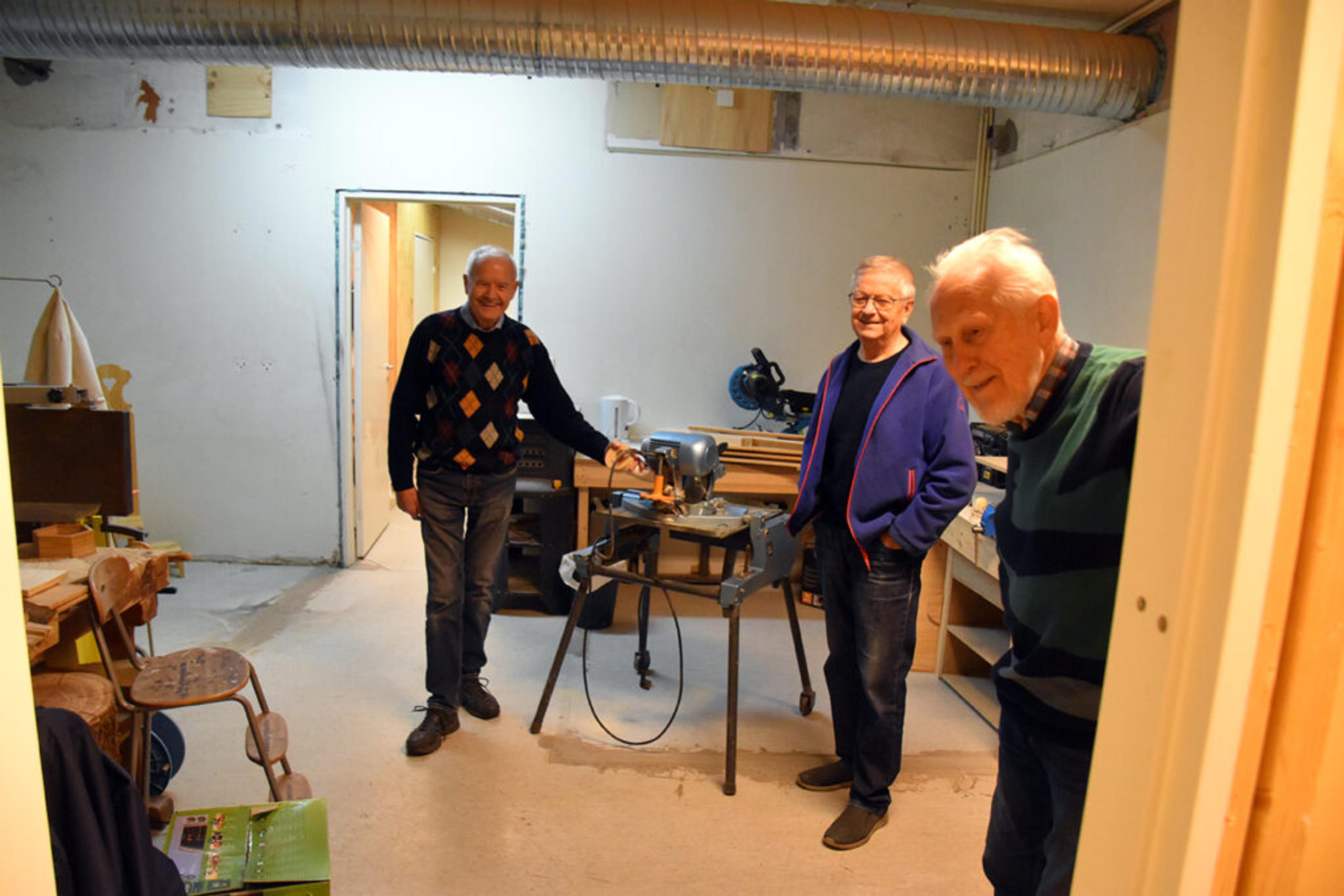 – VELKOMMEN! Trioen i snekkerbua tar gjerne flere i mot til å bruke det flotte hobbyrommet i bånn av Re-torvet. Foto: Stian Ormestad, ReAvisa.