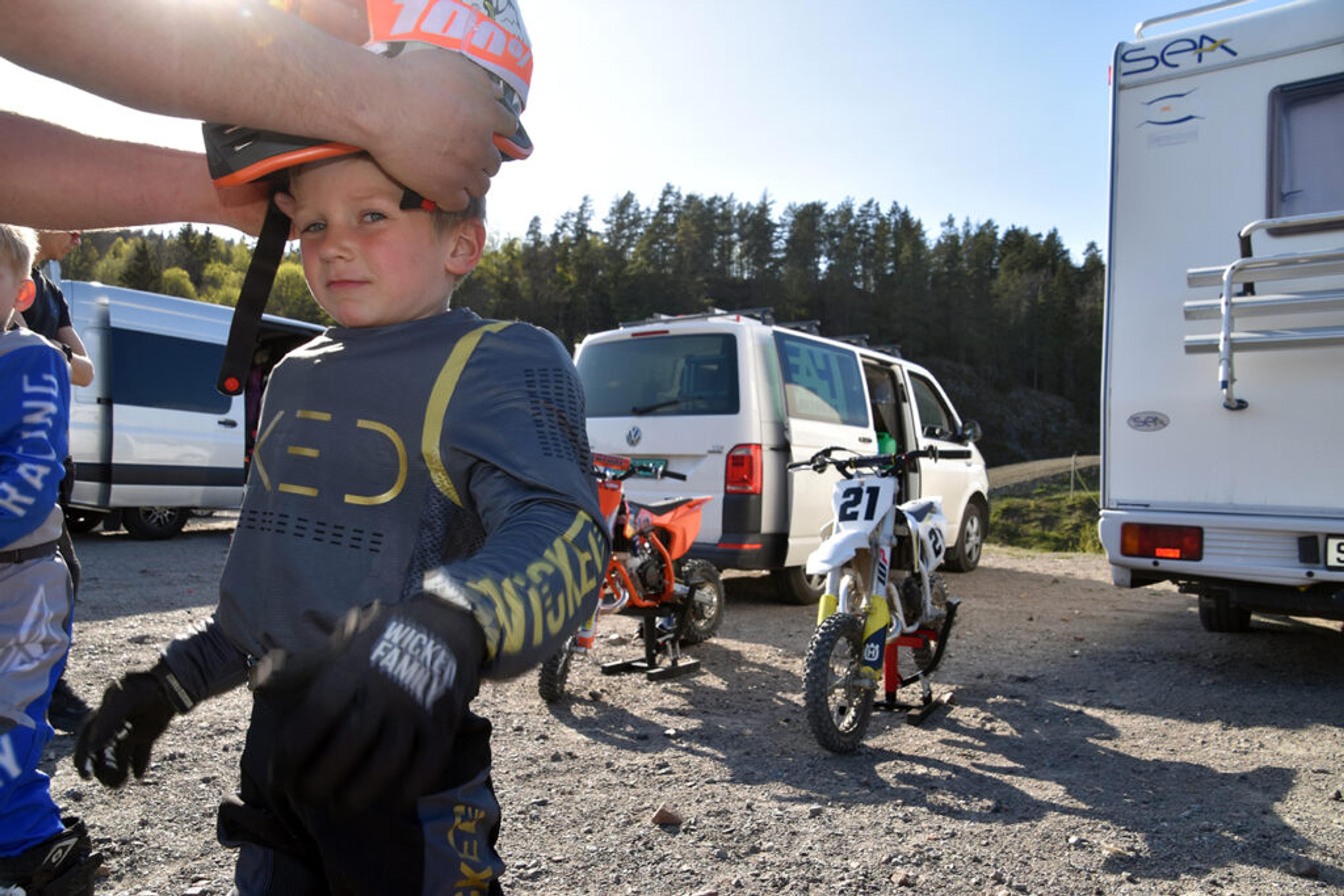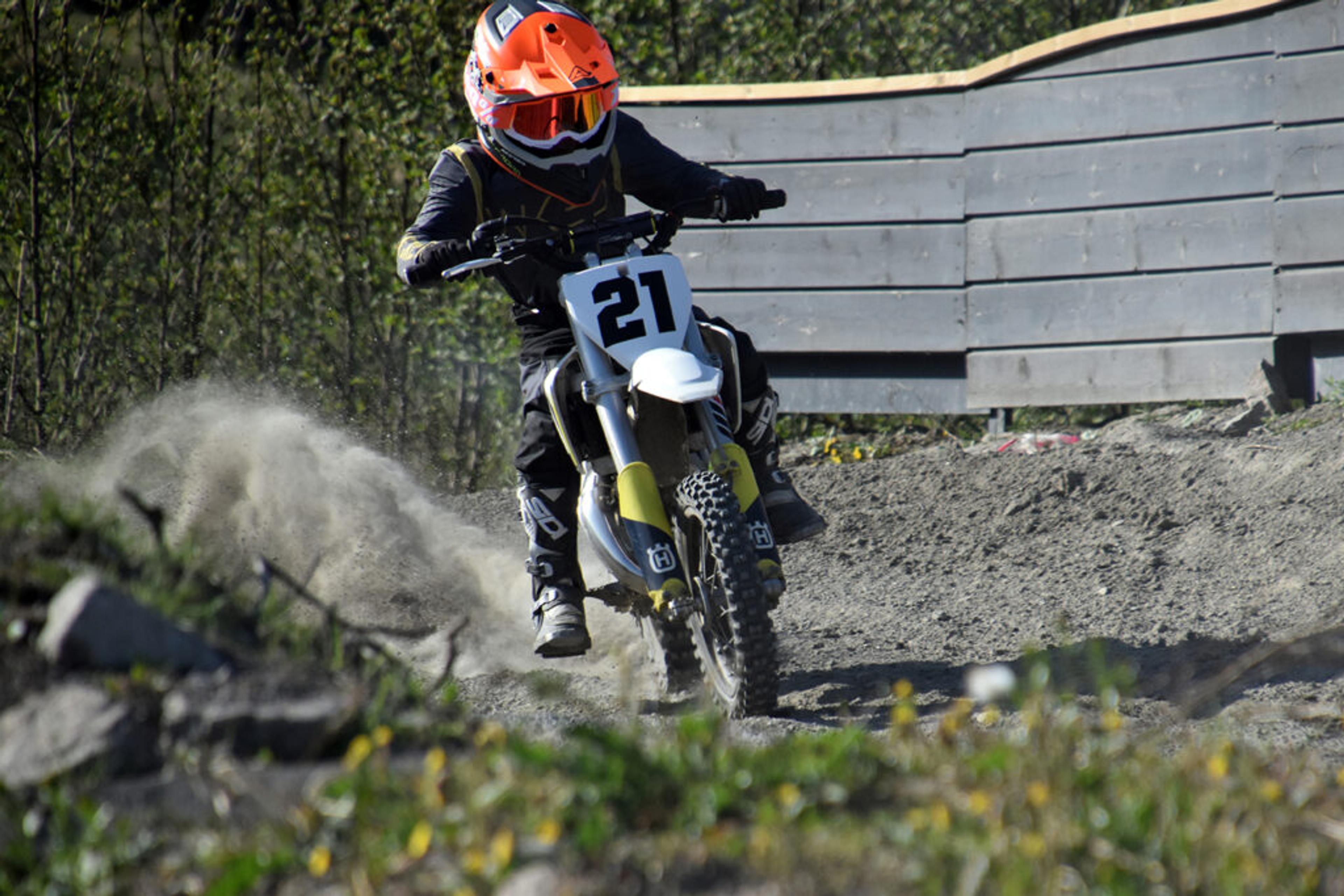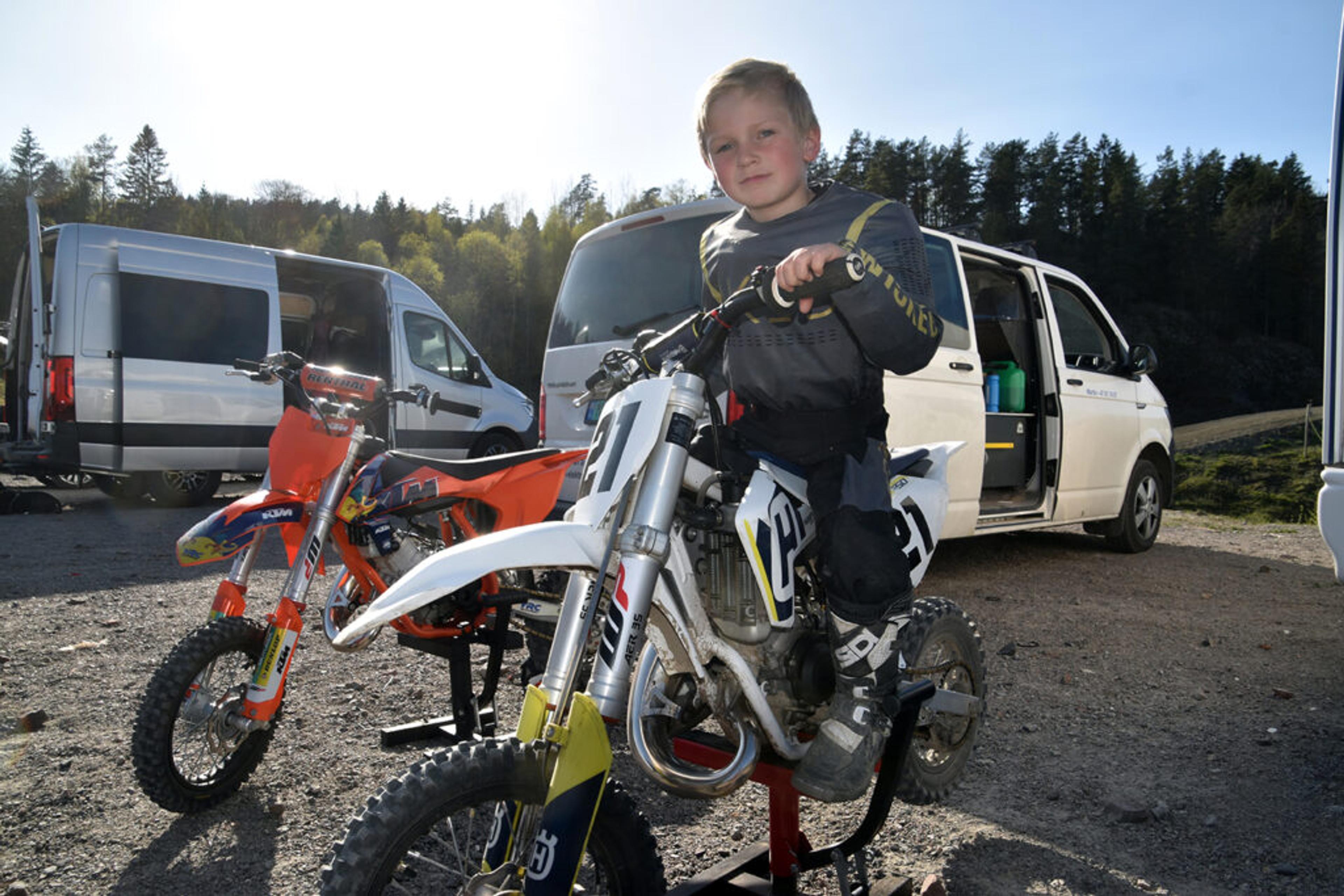 Emrik Fladmo Sommerstad (6) fra Skjeggestad har allerede kjørt motocross ett år og er en rutinert kar på sykkelen. Han elsker å suse av gårde i full fart på Ødegården, motocrossbanen her i Re.