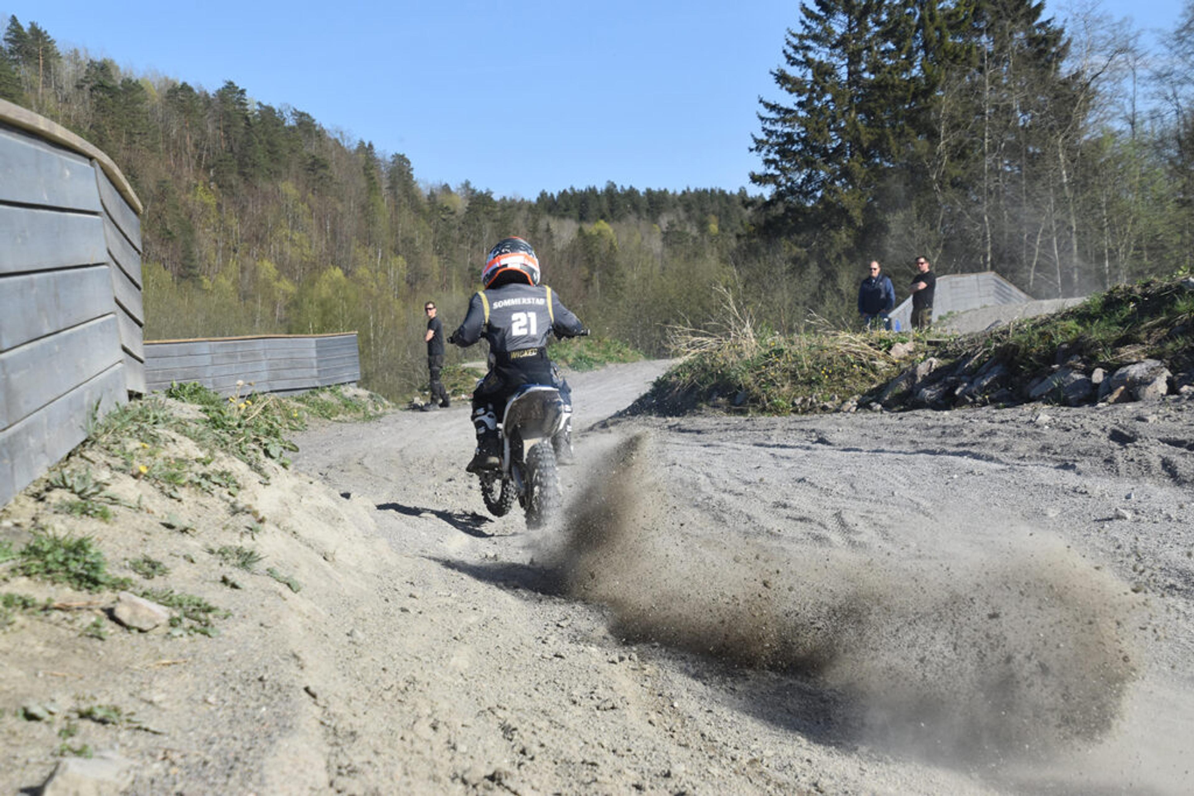 FULL FART! Gjennom sju tiår har det vært fart, spenning, action og høye hopp på Ødegården i Re. En ny generasjon crossere er i gang, med blant andre Emrik Fladmo Sommerstad (6) og Iver Haslestad Gundersen (5). De er klare for første løp på hjemmebane, med totalt 295 deltakere til start. Foto: Stian Ormestad, ReAvisa.