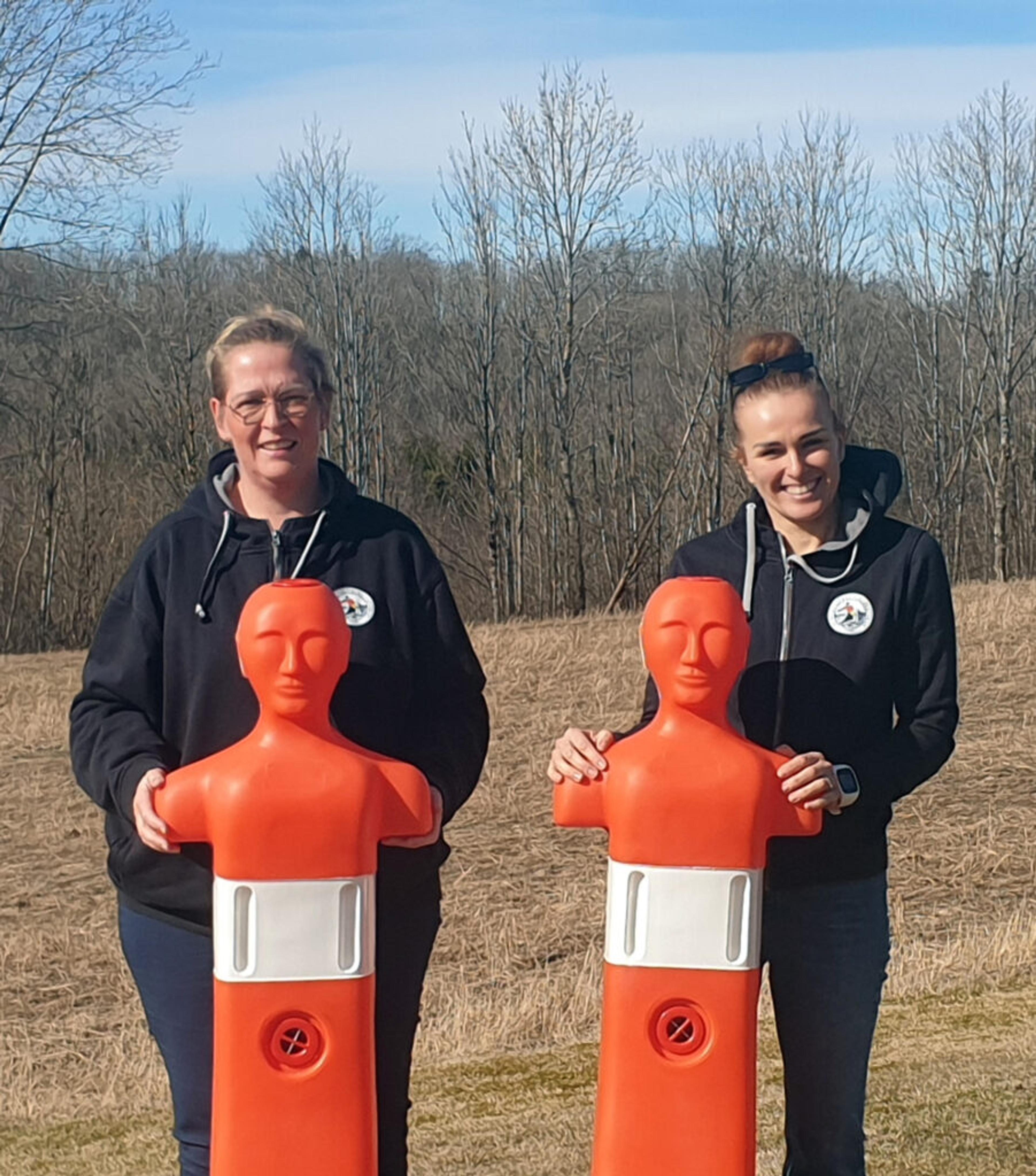 SPLITTER NYE SYNKEDUKKER: På Revetal er det nå rundt 350 barn som lærer å svømme og å bli trygge i vannet med NLS Gullfiskenes gode svømmehjelp. Her ser vi svømmeinstruktør Torill Pettersen og leder Karolina Hansen med de nye synkedukkene. Foto: Privat.