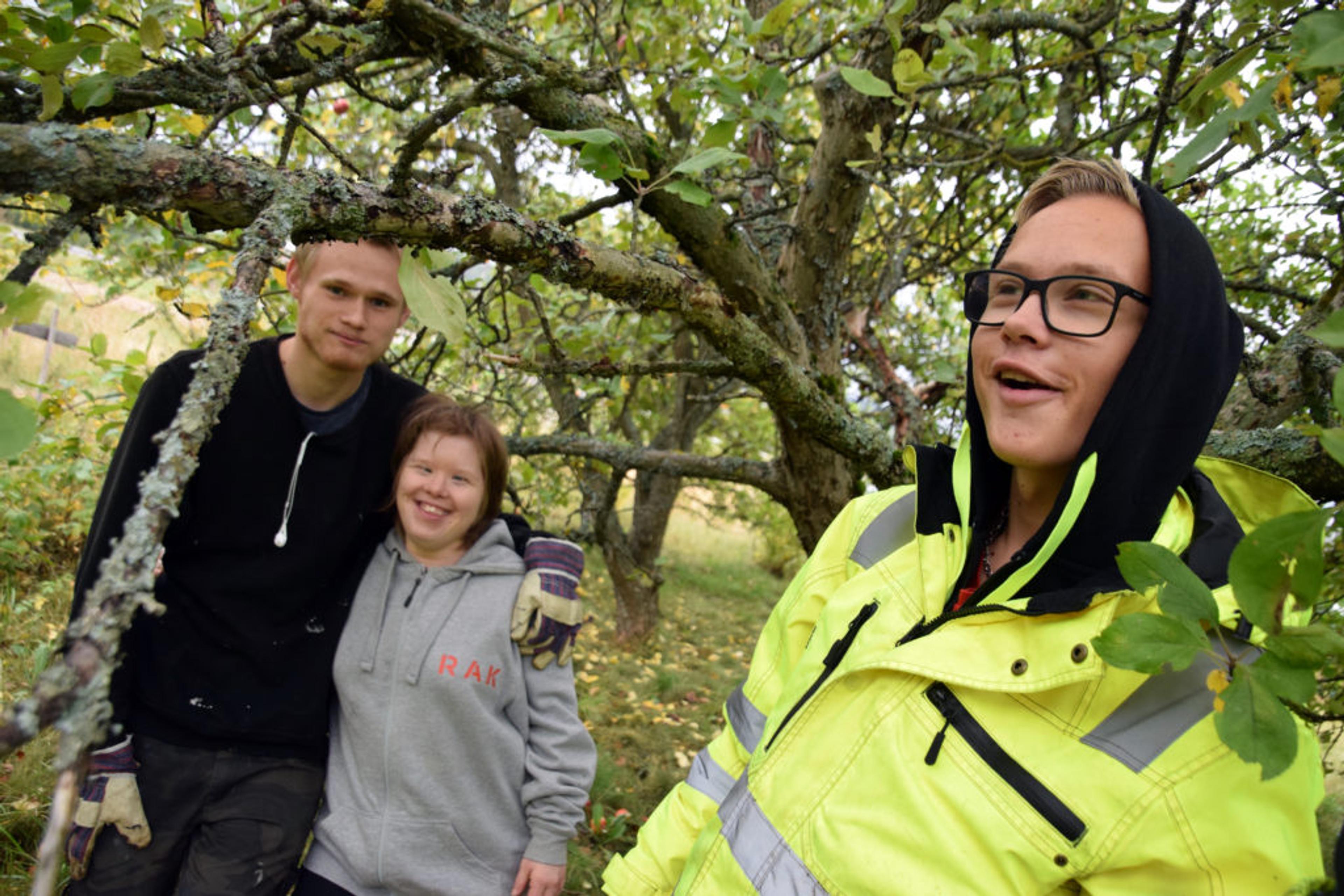 PLUKKER EPLER: Mikael Hagen Johansen (19), Linn Jeanette Roberg (32) og Kristian Grønseth krogseter (17) er tre av mange epleplukkere fra RAK. Foto: Stian Ormestad.